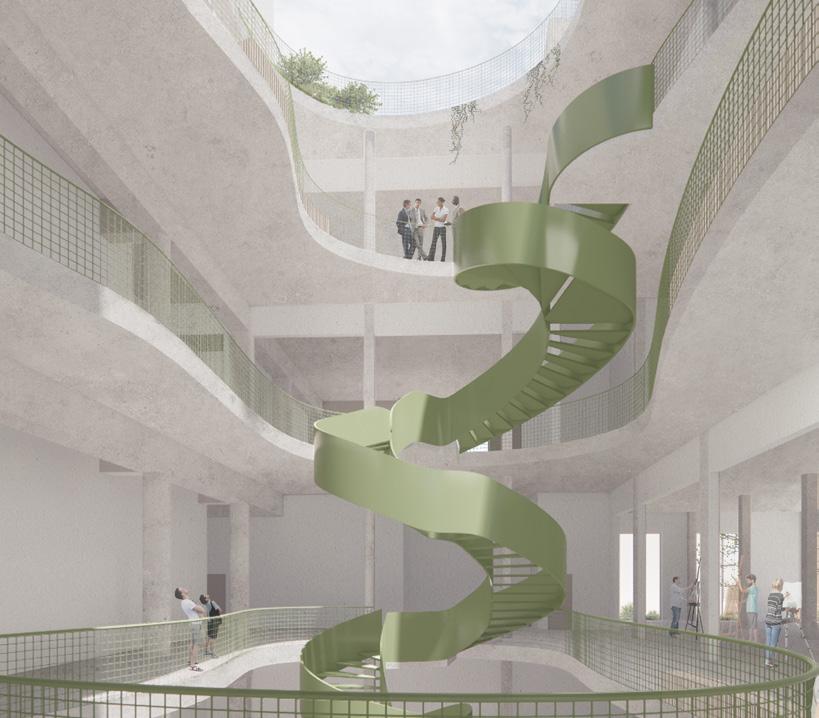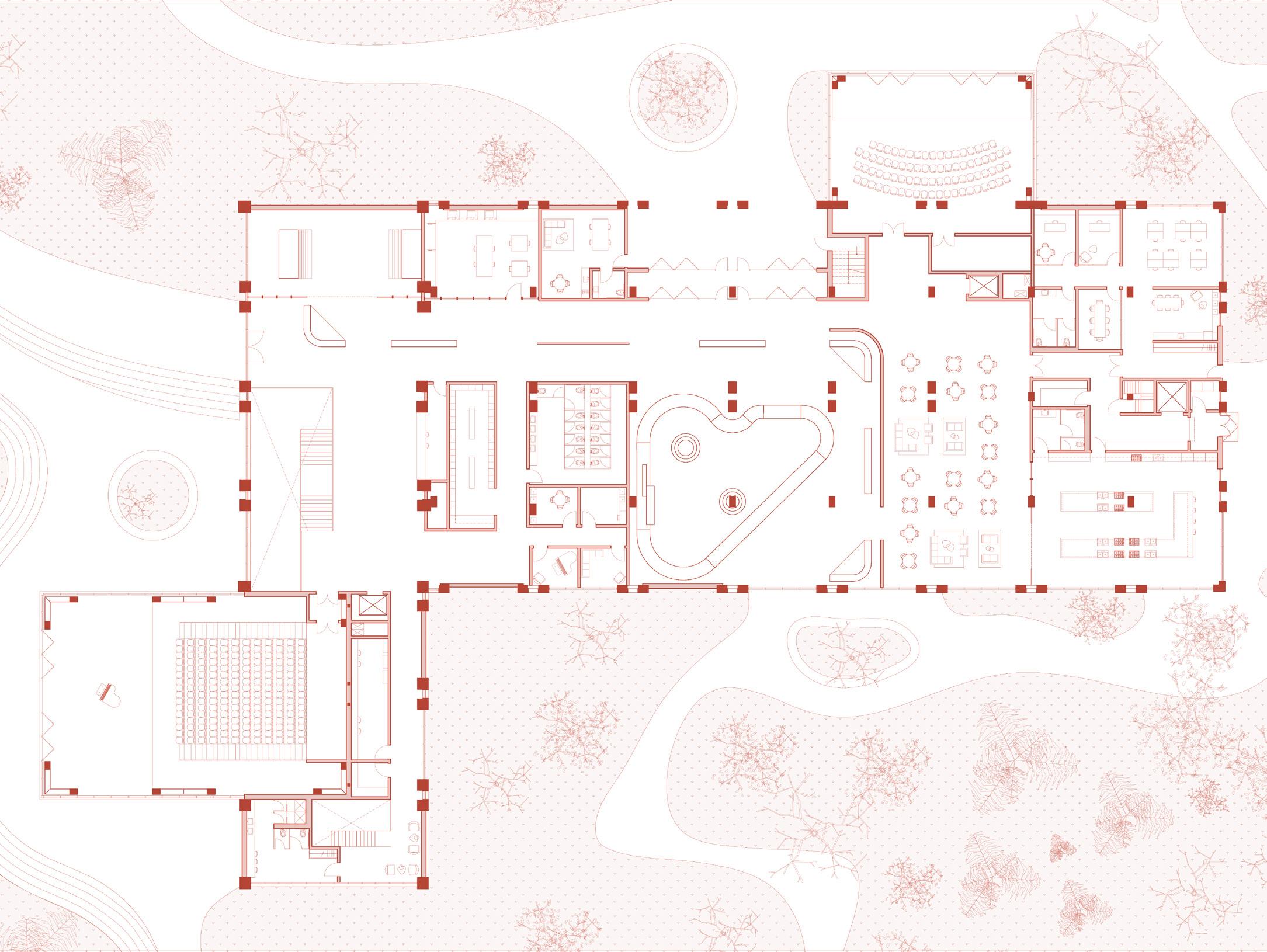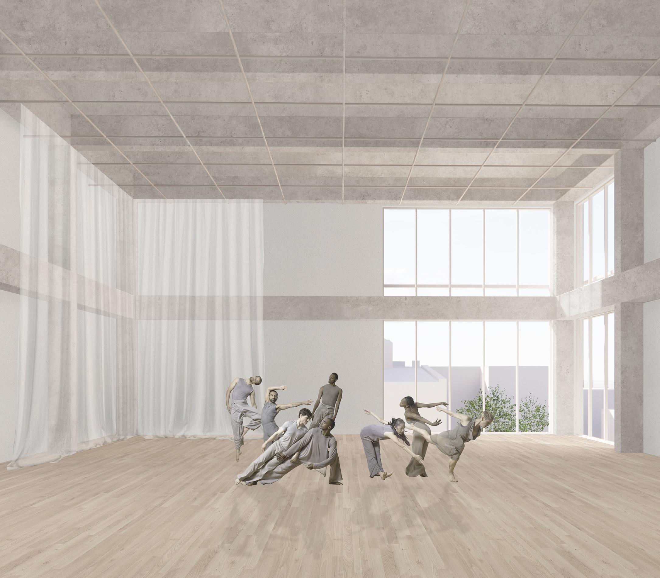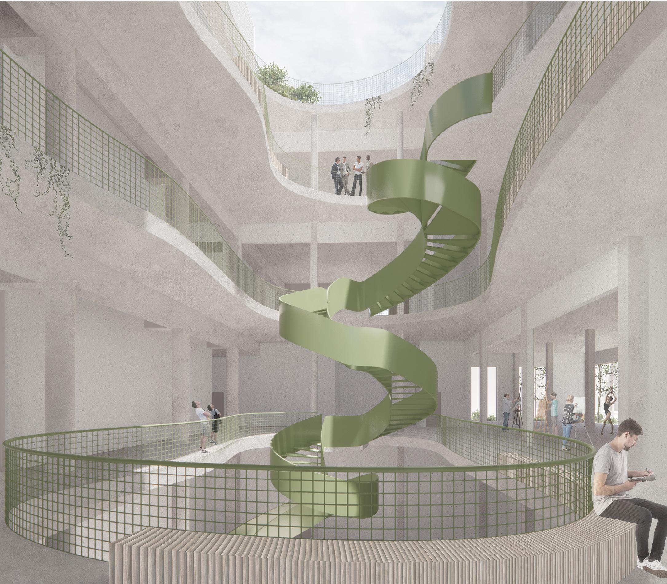 La forme du vide diffère à chaque étage. Tout d’abord, il est percé dans le but de forcer un contact visuel entre les différentes disciplines artistiques. Puis, sa forme organique à l’apparence aléatoire organise la circulation dans le foyer. Elle incite à la pause, à l’échange et à l’observation.