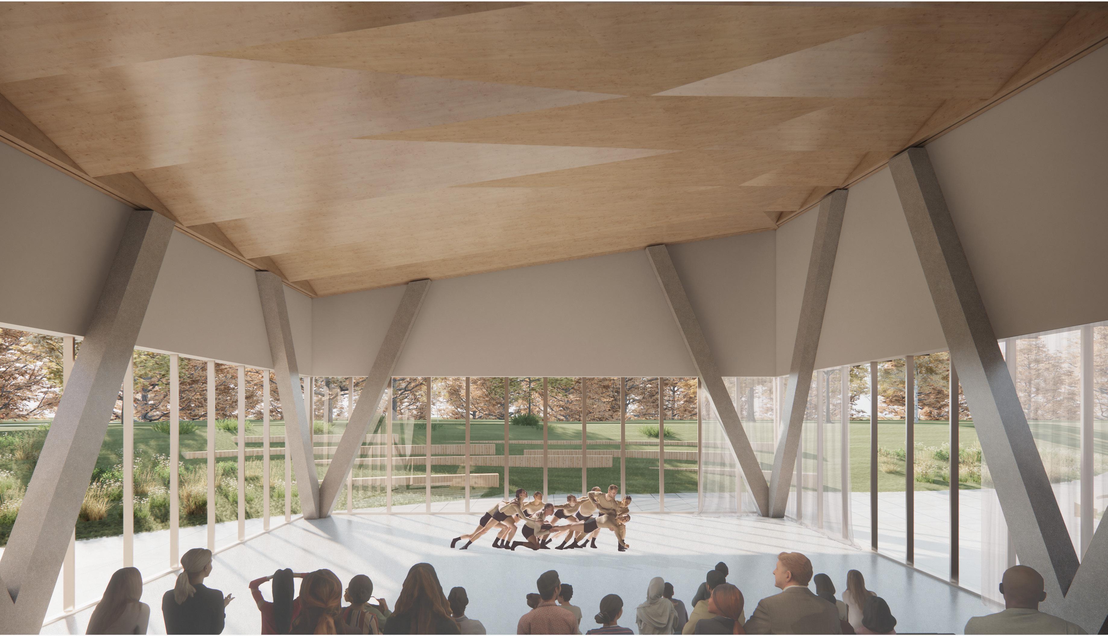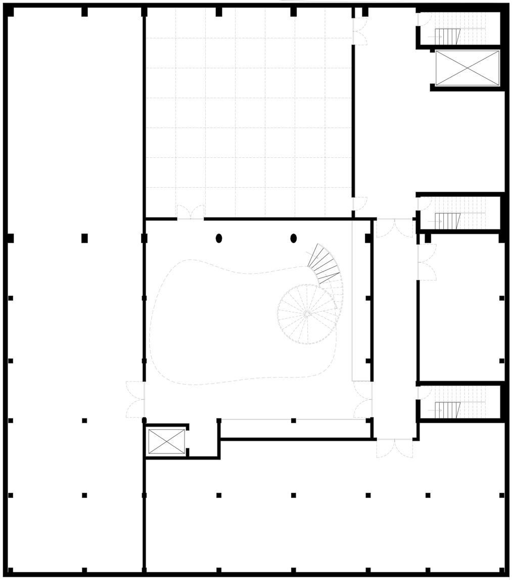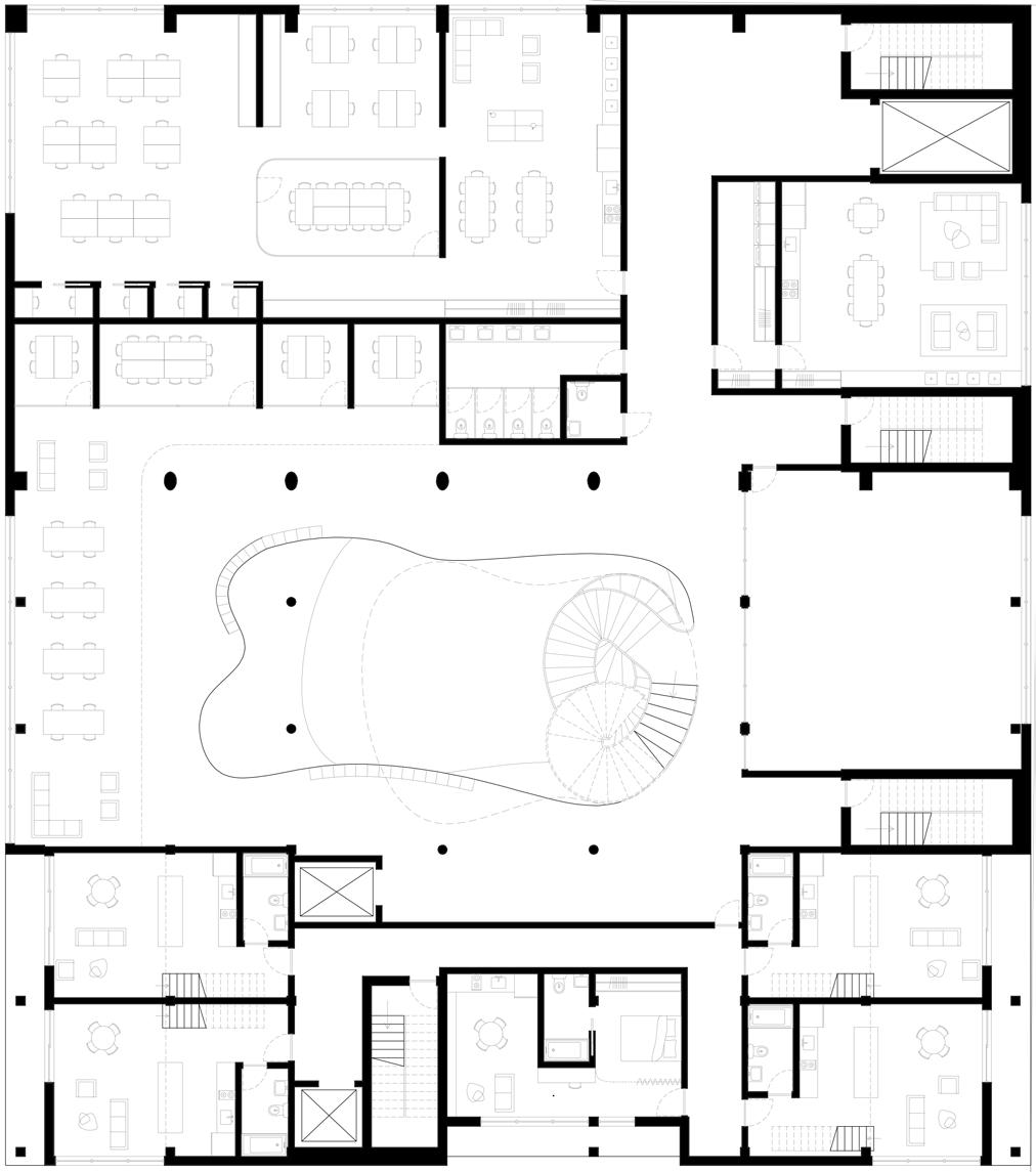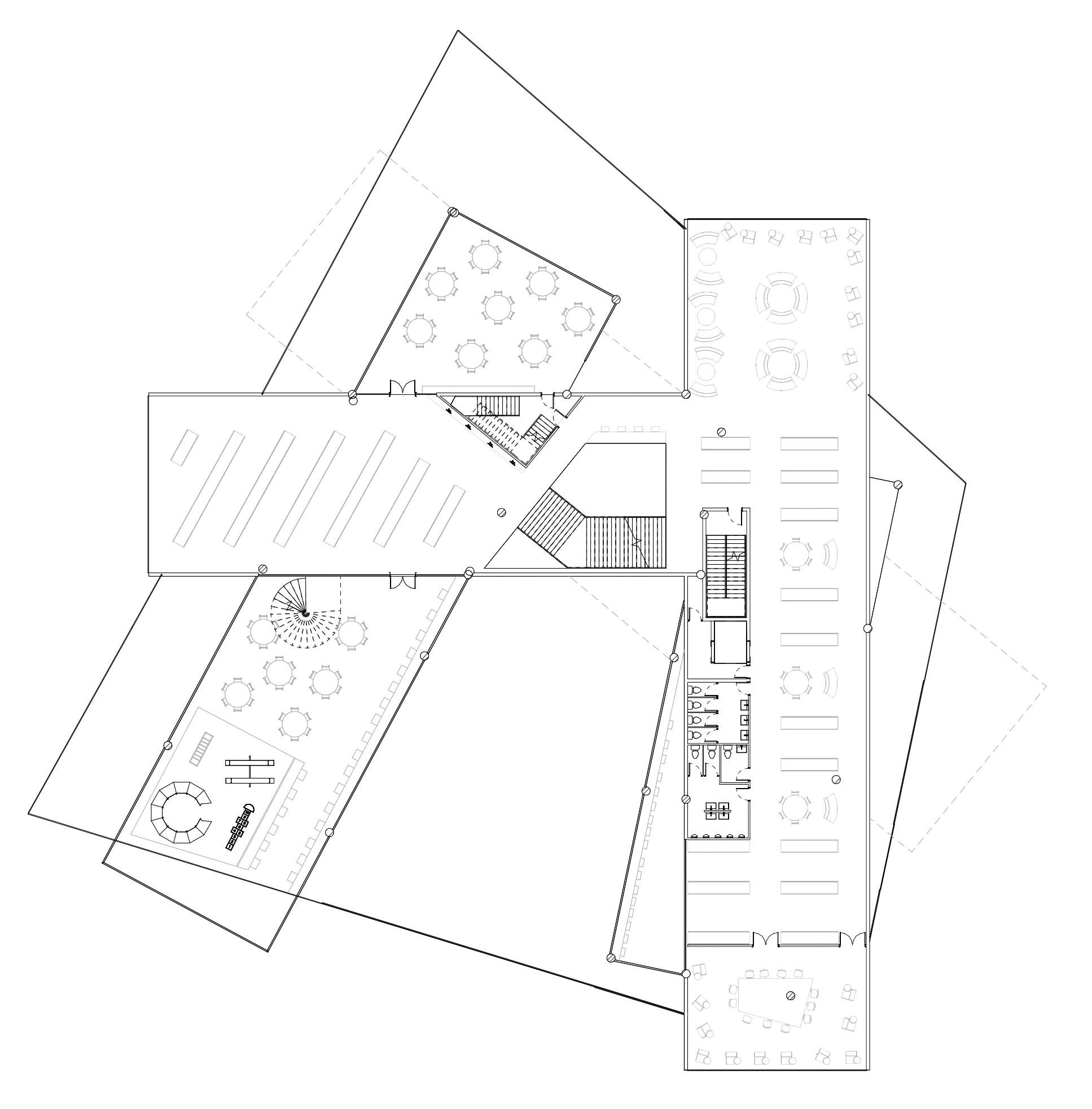 La forme du vide diffère à chaque étage. Tout d’abord, il est percé dans le but de forcer un contact visuel entre les différentes disciplines artistiques. Puis, sa forme organique à l’apparence aléatoire organise la circulation dans le foyer. Elle incite à la pause, à l’échange et à l’observation.