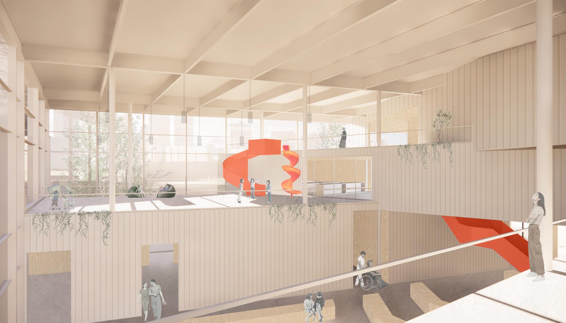 Les terrasses permettent un contact entre les différents programmes et les différents groupes qui habiteront les lieux. Elles accentuent l’aspect ludique de l’espace et placent l’usager à mi-chemin entre l’intérieur et l’extérieur.