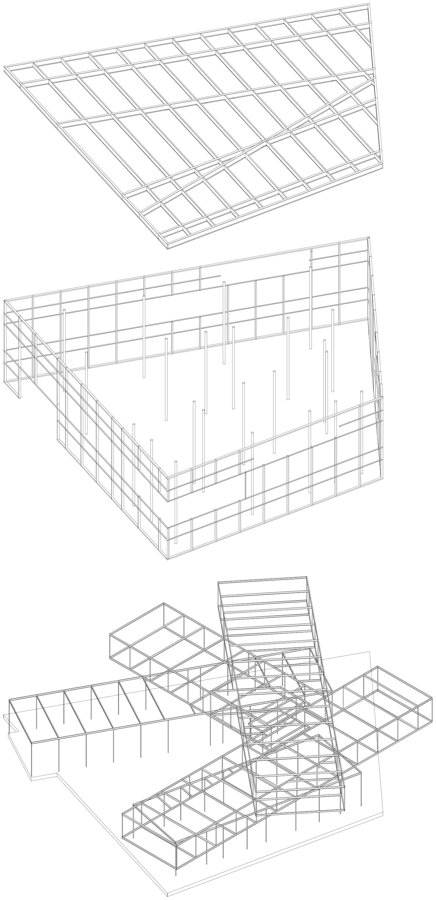 Le bâtiment est supporté par une structure d’acier selon deux systèmes distincts. Les blocs intérieurs ont une structure autonome et le système d’enveloppe est supporté par un ensemble de colonnes traversantes placées selon la trame des blocs.