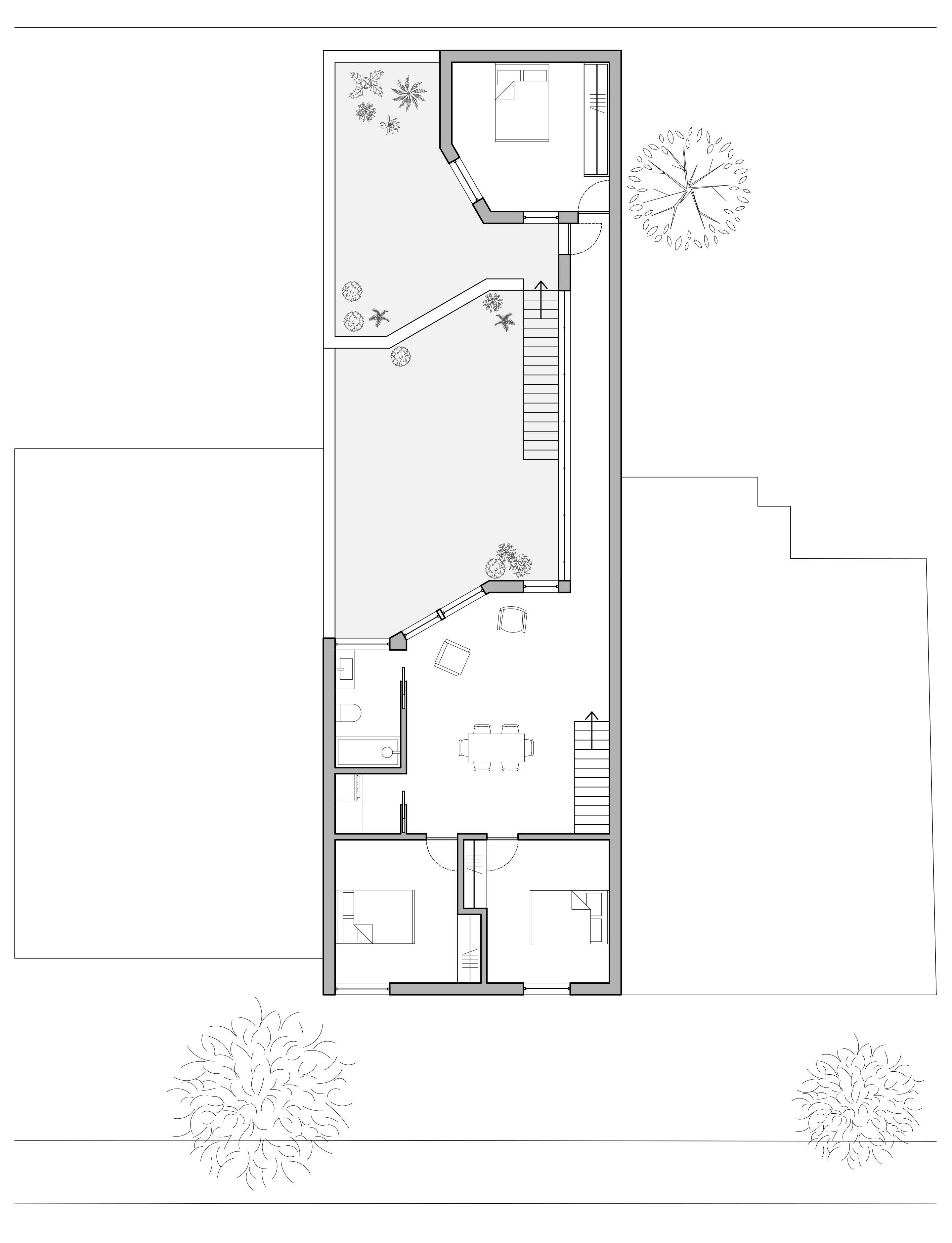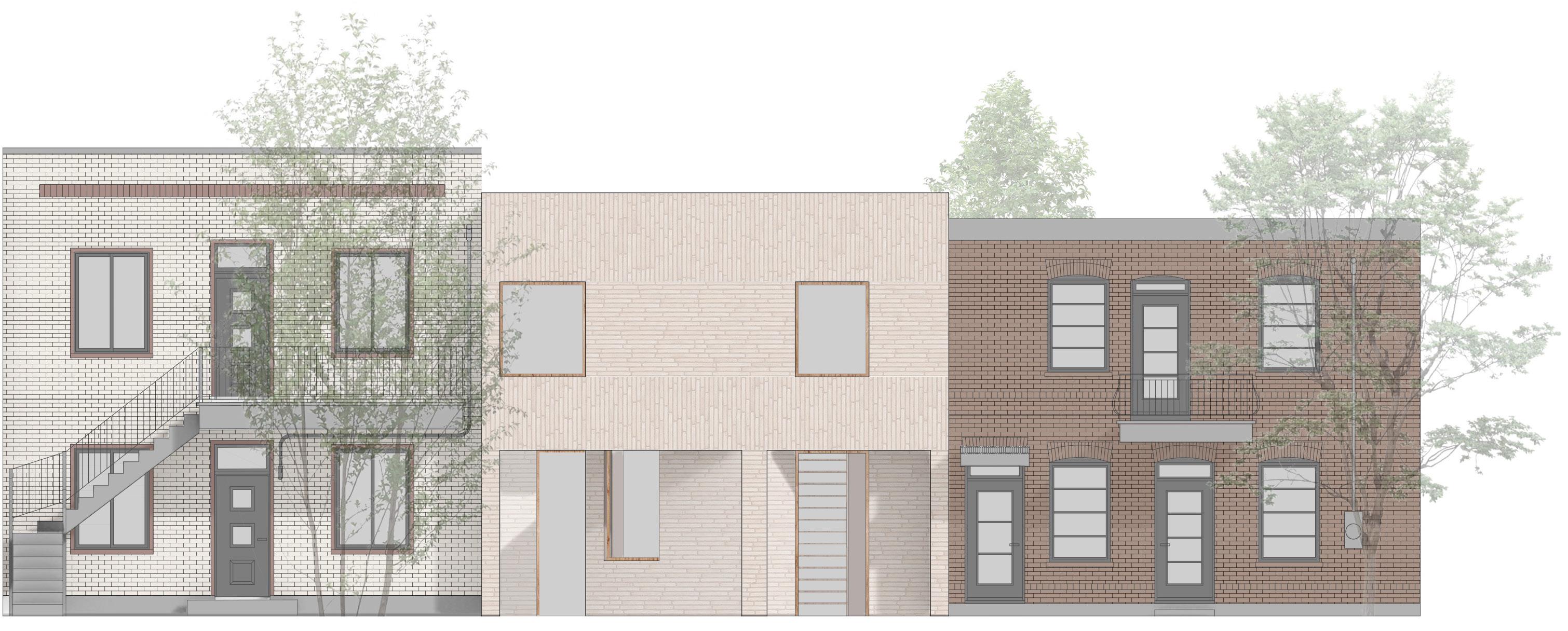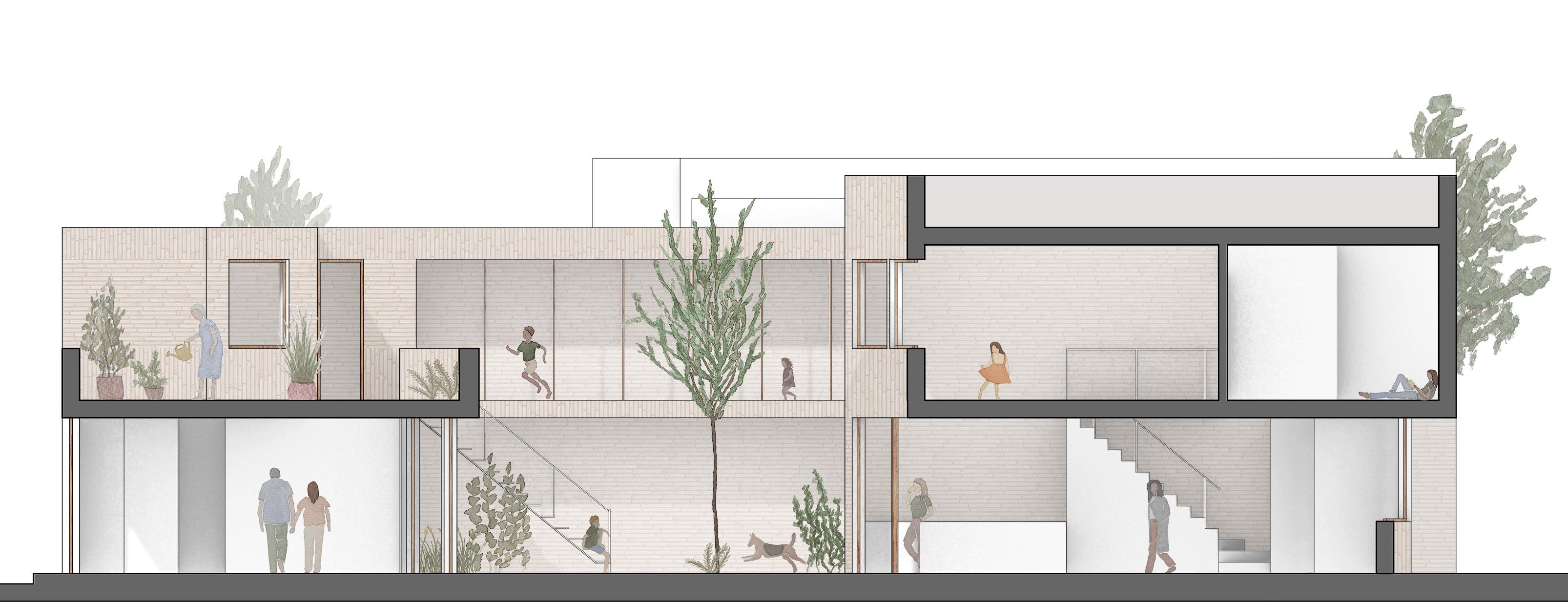 La cour intérieure est vue comme un élément rassembleur qui permet des échanges entre les membres de la famille. Elle permet aussi de créer un écran d’intimité et un espace tampon entre les deux résidences. À plus long terme, la résidence arrière pourrait aussi loger un jeune couple d’étudiants ou de professionnels.