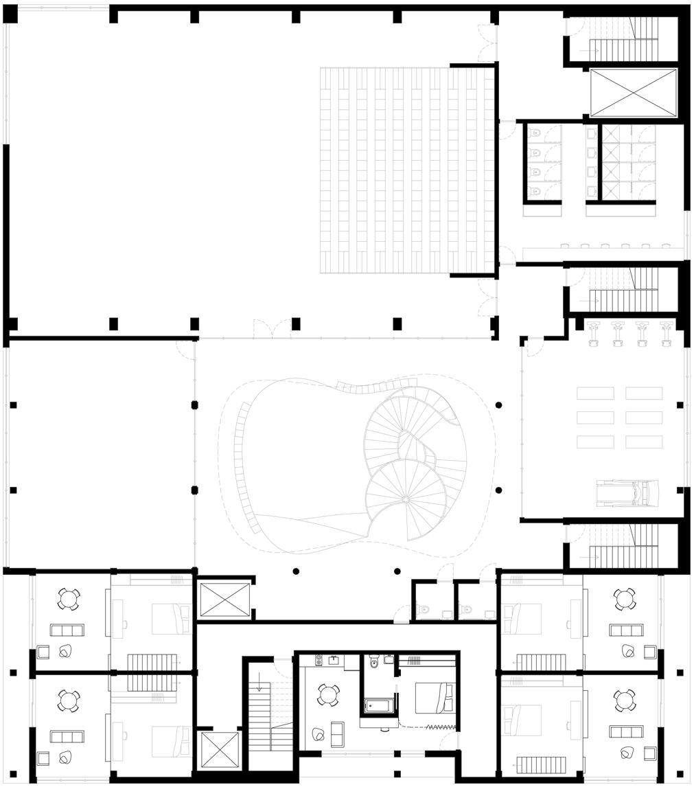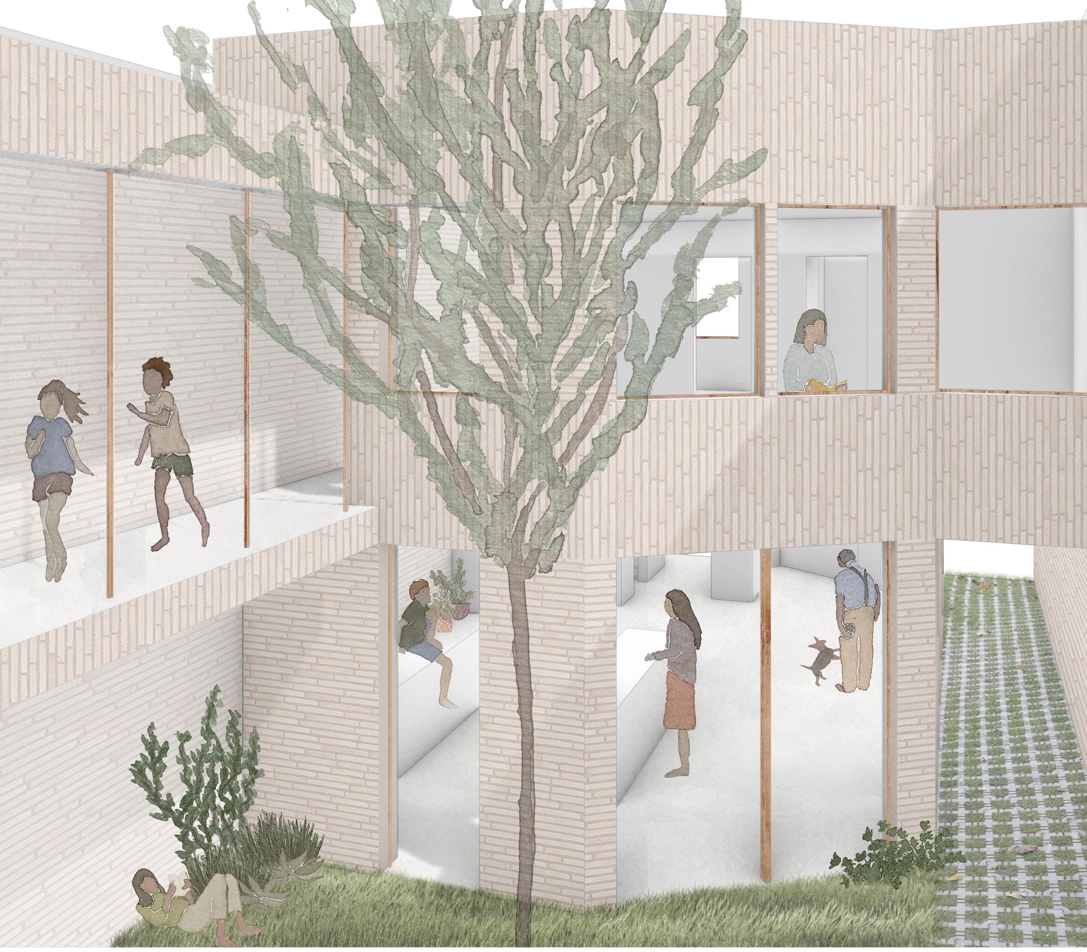 La cour intérieure, fermée par la nouvelle branche, est un lieu paisible pour tous les habitants. D’une part elle crée un pont entre l’ancien et le nouveau, mais elle permet aussi de créer un espace tampon entre le commun et le privé. Dans cet ordre d’idées, toutes les chambres ont une vue sur la cour, de même qu’une grande partie des espaces pouvant être partagée entre les communautés.