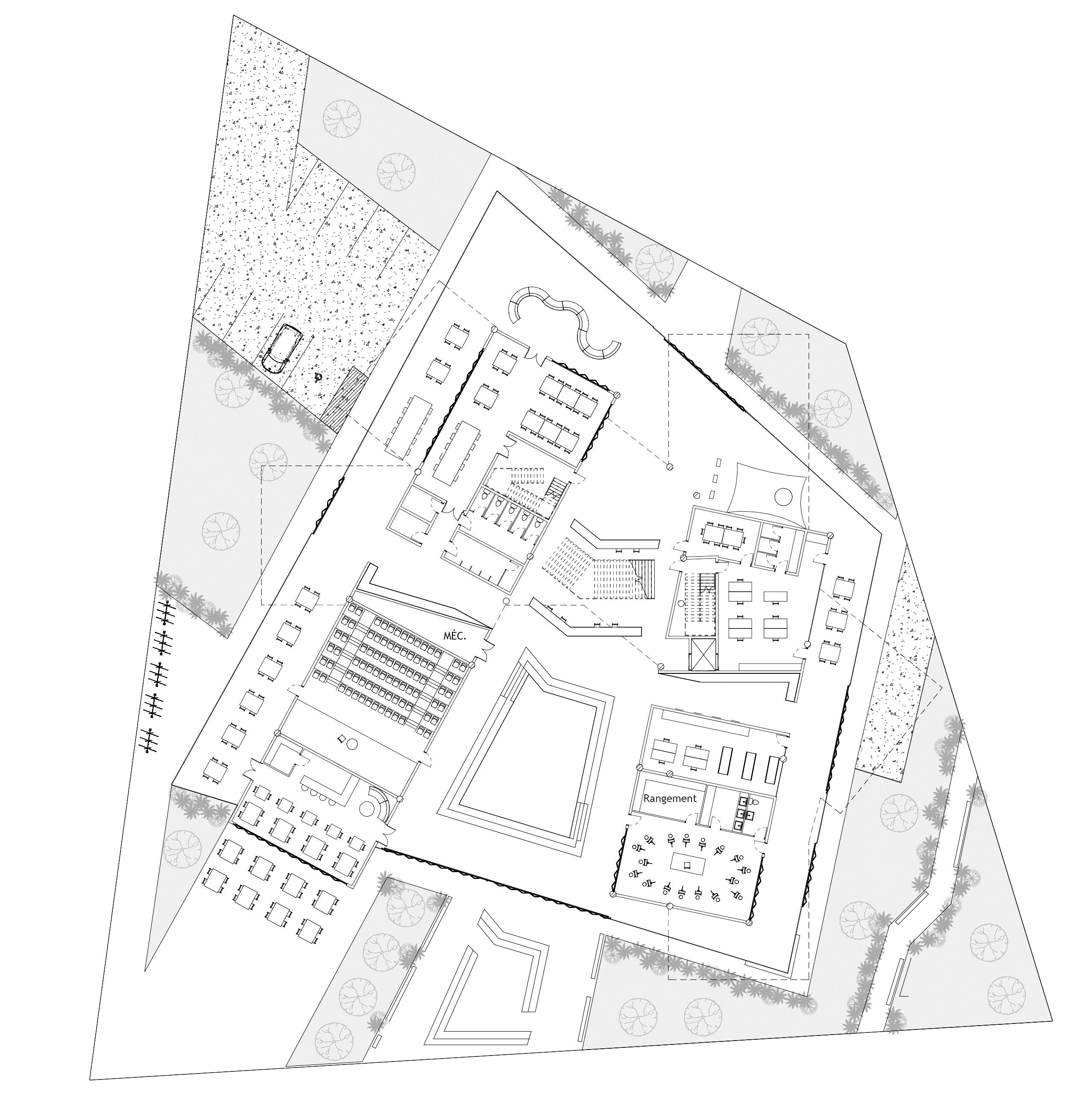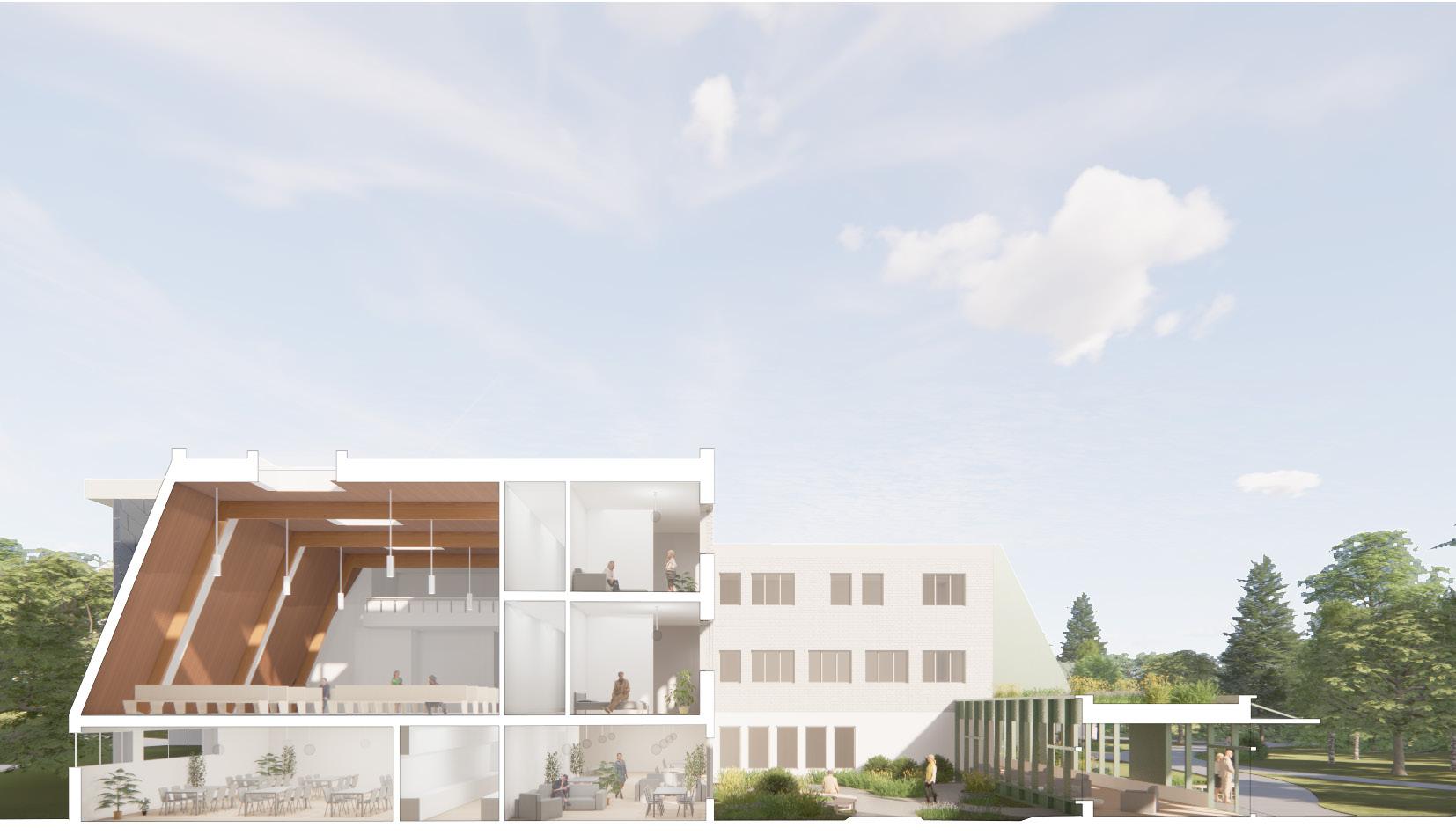 Le projet Les Maisons de la Clairière tire son nom de la caractéristique distinctive du site : une zone dégagée de végétation au cœur même de l’emplacement. C’est précisément à cet endroit que l’on retrouve les trois bâtiments existants du couvent des sœurs missionnaires de Laval, en plus d’une nouvelle branche qui y est ajoutée. Le caractère paisible et naturel du lieu nous a fortement inspirés à développer un programme qui ferait bénéficier les personnes âgées ainsi que les personnes autistes de ce havre de paix. D’ailleurs, ce sont aussi deux groupes qui profitent grandement de la mixité sociale.