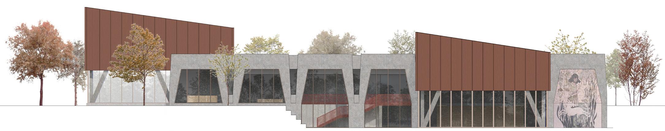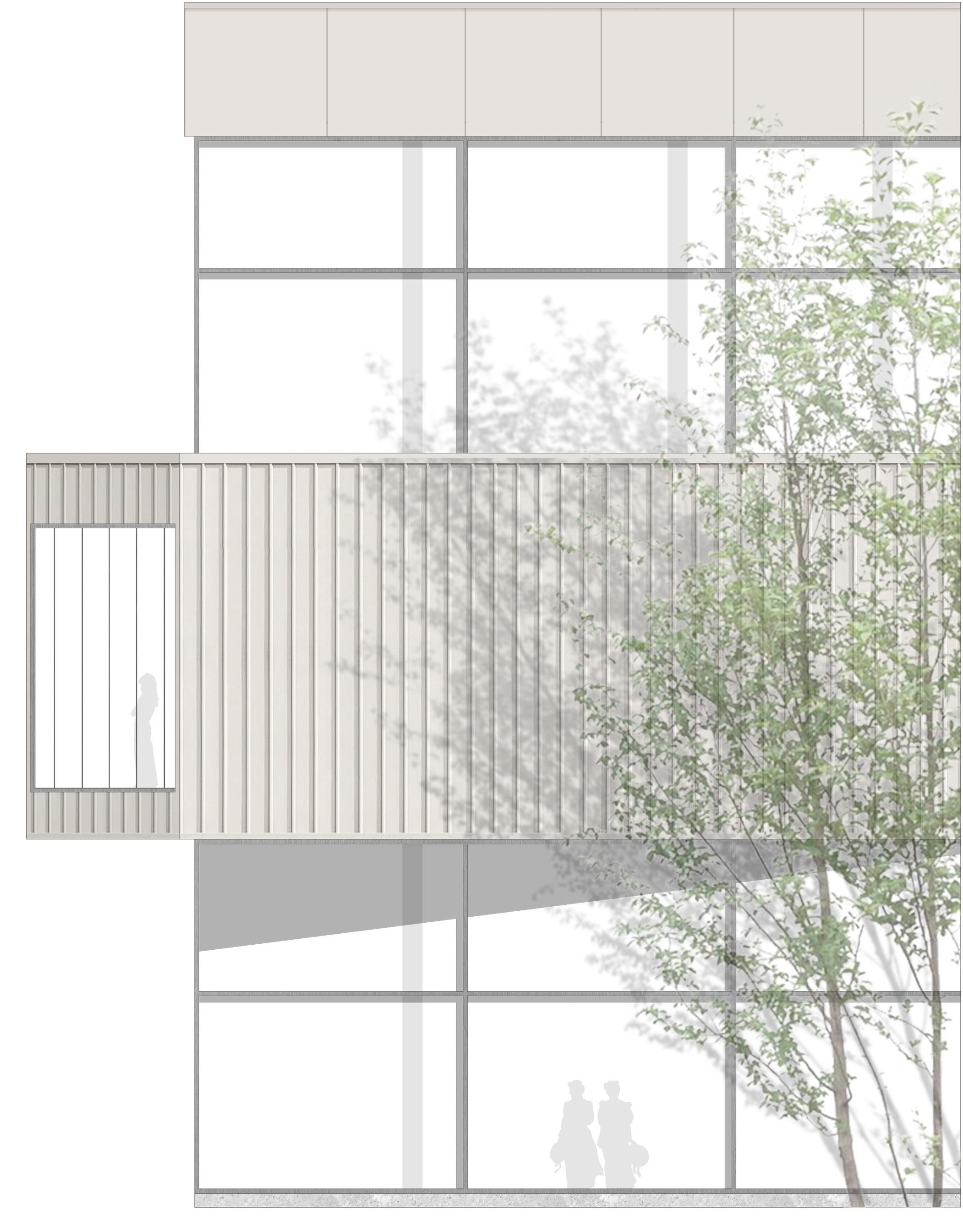 Les deux annexes sont soutenues par une structure hybride de bois et de béton. En partie basse, des colonnes de béton angulaires reprennent le langage des portiques de béton existant. Puis, en partie haute, un origami de panneaux de CLT inclinés supporte la toiture, tout en agissant en tant que diaphragme. Enfin, la jonction entre