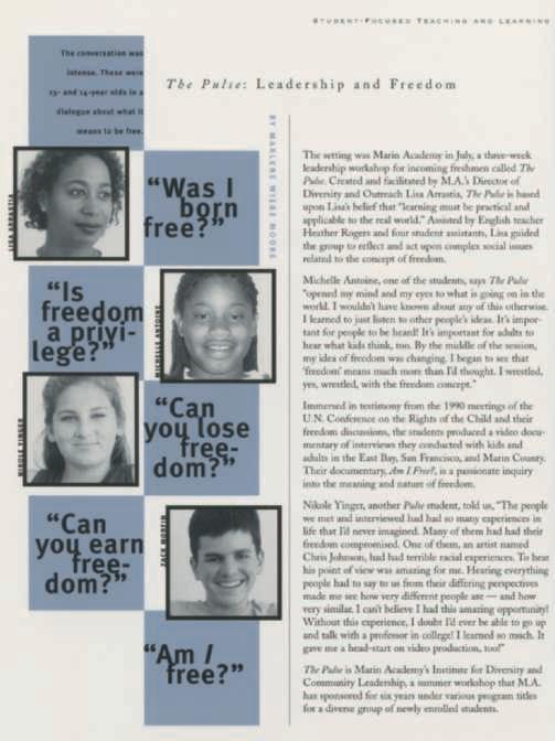 This issue of NEXUS features a brief history of Marin Academy, five decades of words and images highlighting interesting milestones along our journey. Our Dean of Faculty, STELLA BEALE , shares the excitement and vision that led us to launch our new Penn Fellows program, and our new Dean of Equity and Inclusion, PIYA KASHYAP , shares her visions for the future. We’re always celebrating and spotlighting our incredible alumni’s accomplishments and can’t wait to see everyone at our upcoming 50th-anniversary events. Athletes, artists, and our recent graduates contributed much to our community this year, and we’re delighted to share their incredible accomplishments. Last, and certainly not least, our annual report shines a light on our generous community's gifts of time, talent, and treasures. We hope you enjoy this special 50th-anniversary edition of NEXUS.
