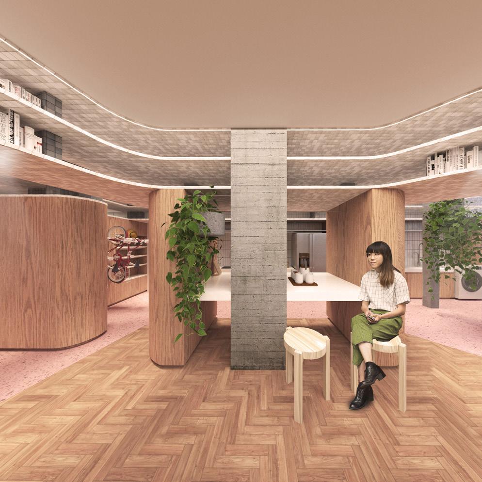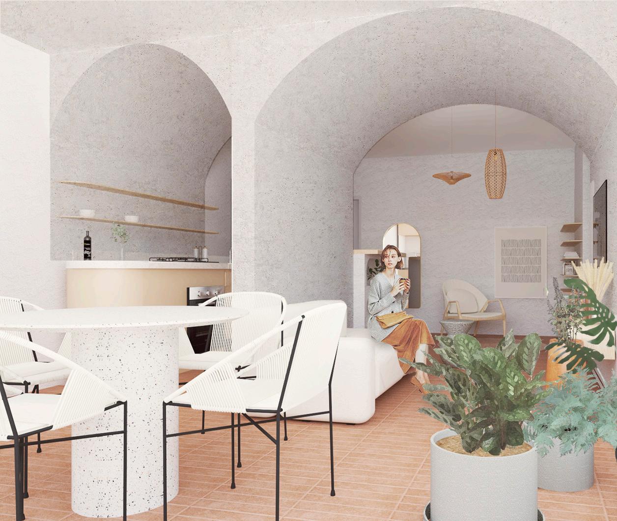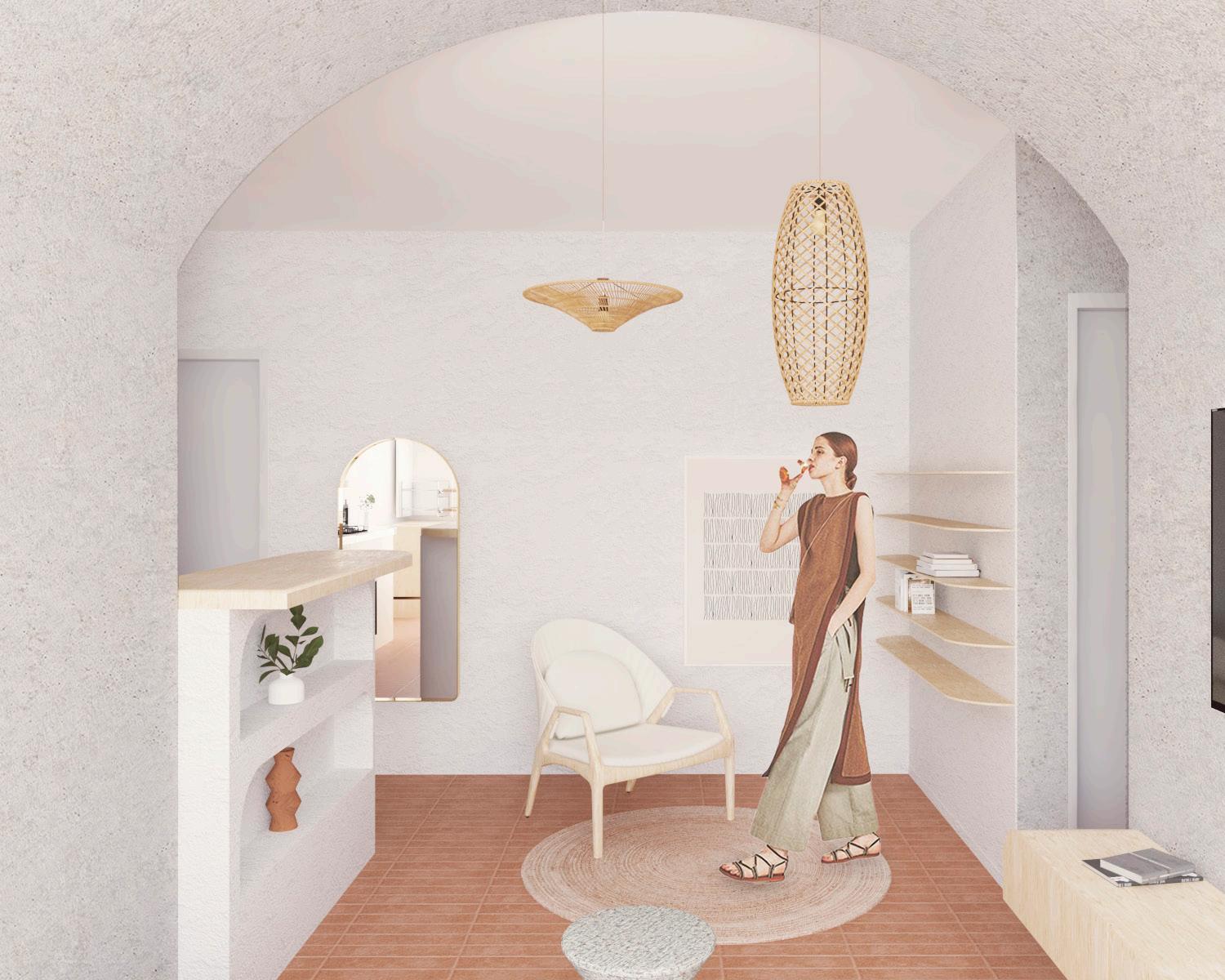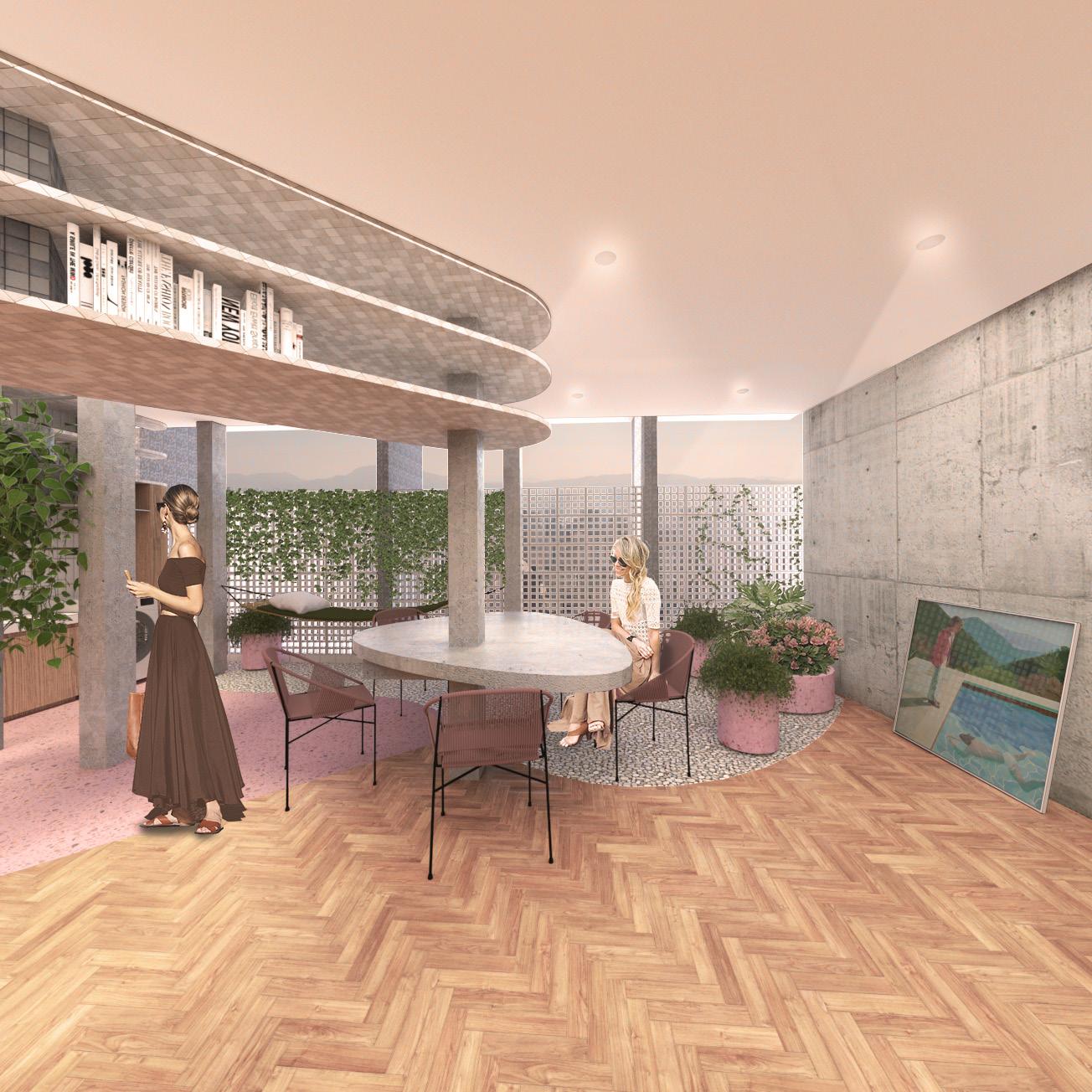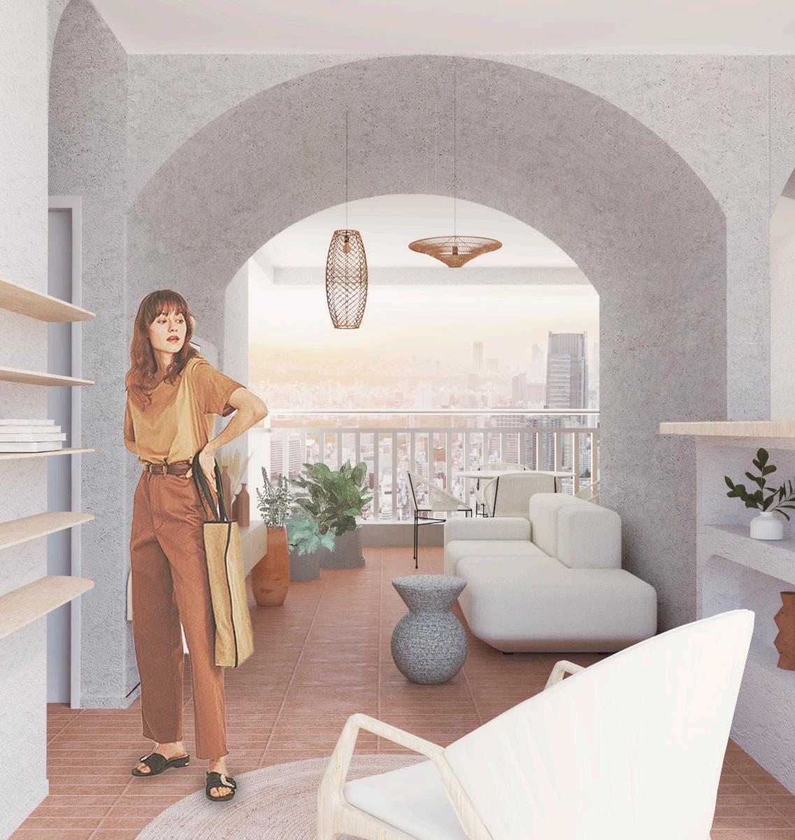 Neste projeto optamos pela utilização de cores claras, materiais naturais e formas orgânicas, trazendo mais aconchego para os moradores. A imagem foi feita utilizando um misto de colagens e renders de maneira mais livre, passando a ideia que queremos ilustrar.