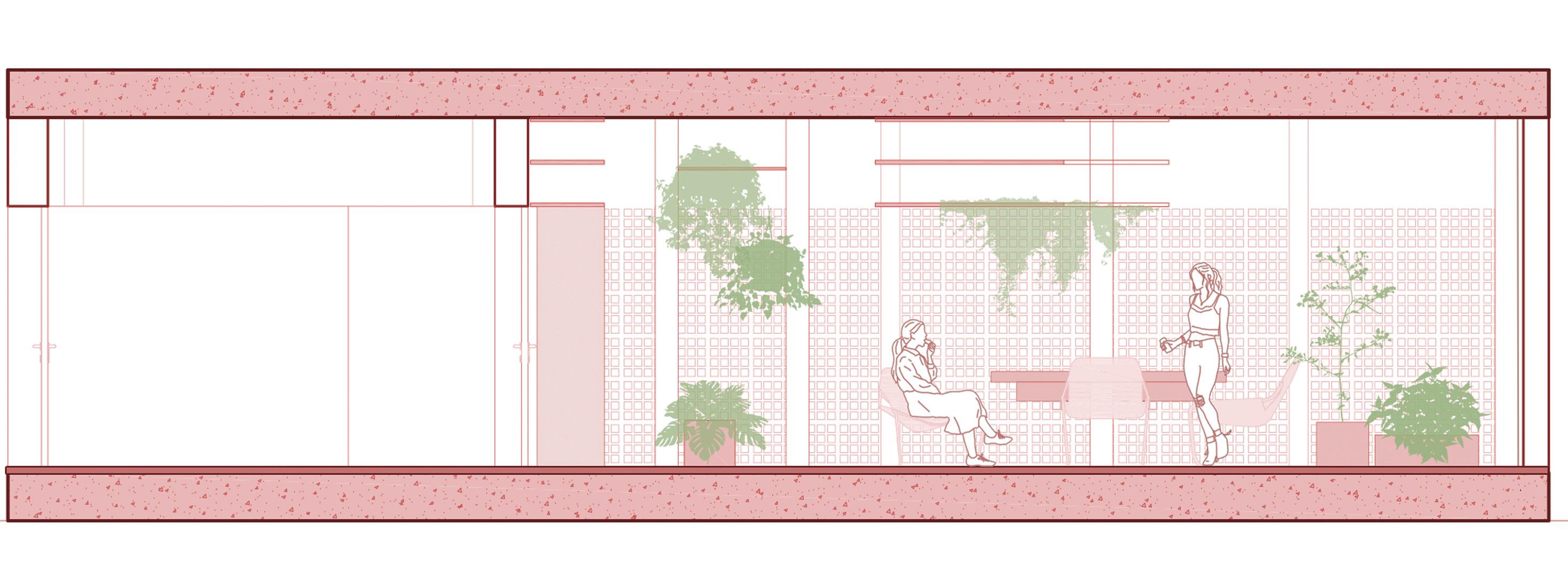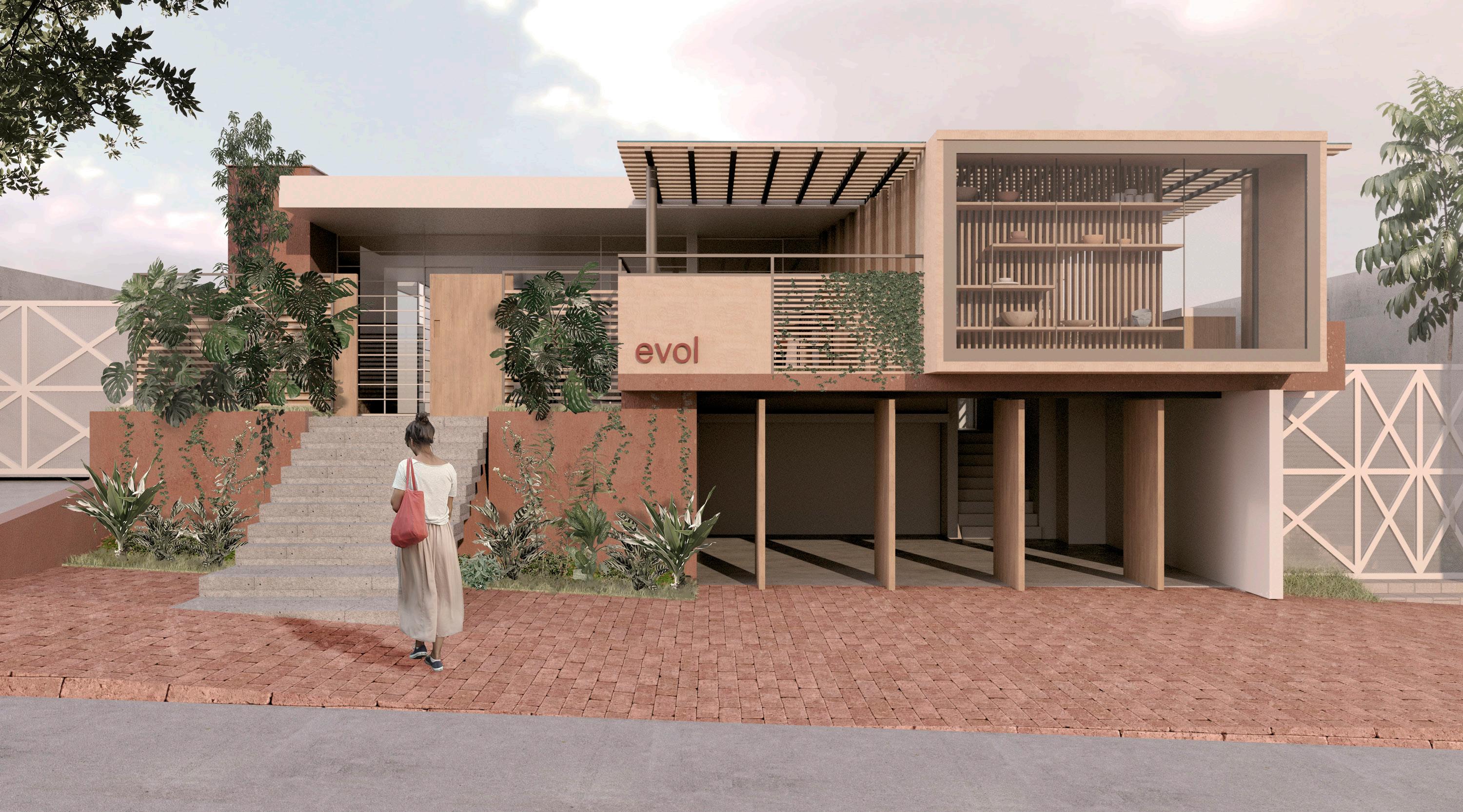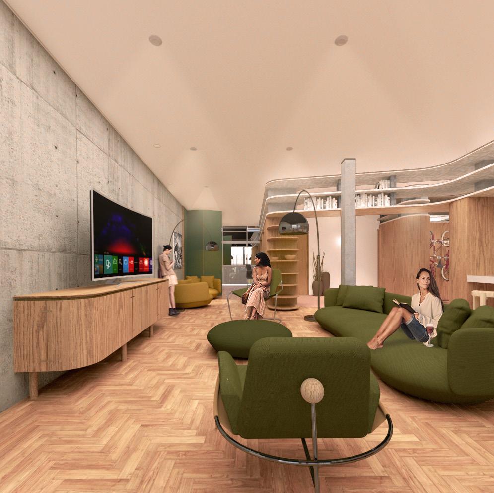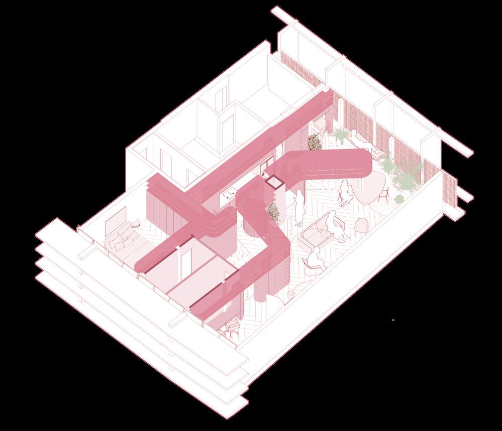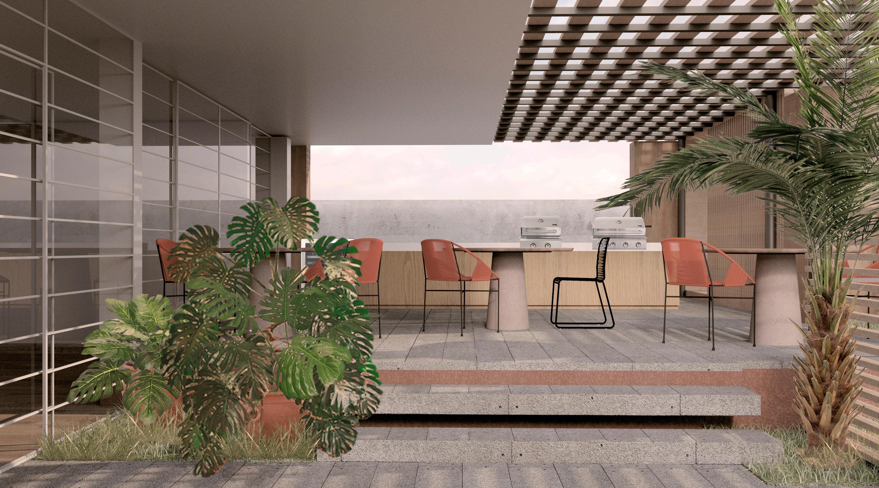 Neste projeto optamos pela utilização de cores claras, materiais naturais e formas orgânicas, trazendo mais aconchego para os moradores. A imagem foi feita utilizando um misto de colagens e renders de maneira mais livre, passando a ideia que queremos ilustrar.