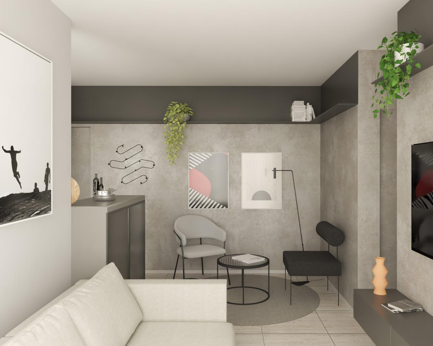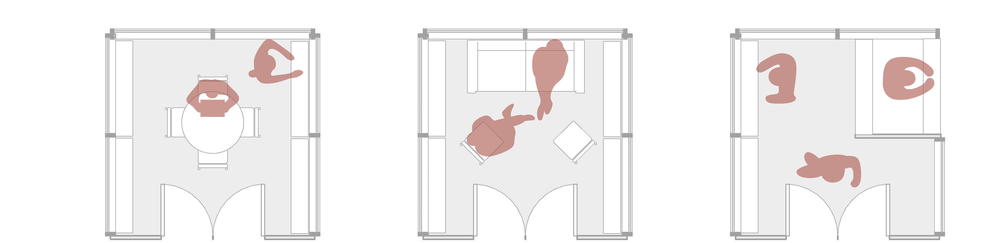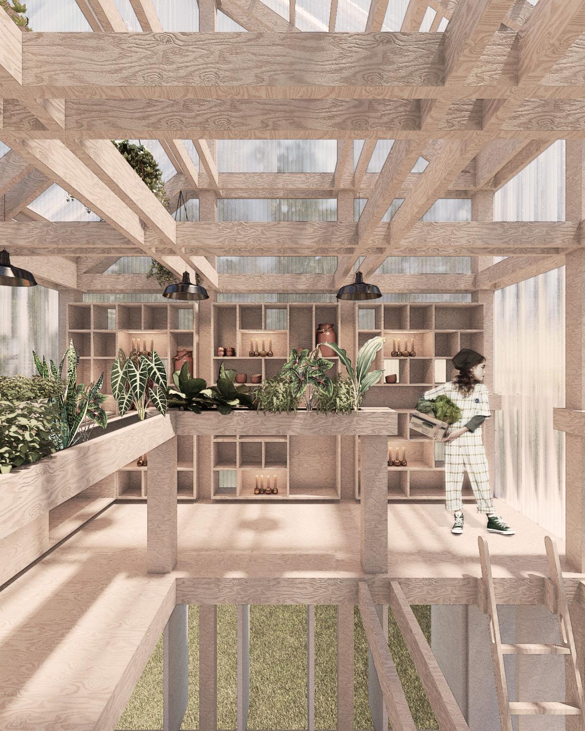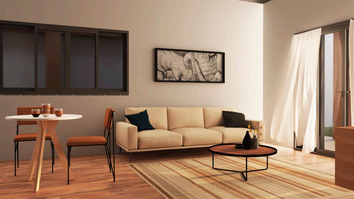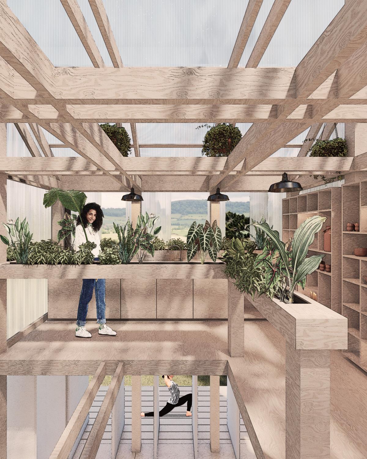 Neste projeto optamos pela utilização de cores claras, materiais naturais e formas orgânicas, trazendo mais aconchego para os moradores. A imagem foi feita utilizando um misto de colagens e renders de maneira mais livre, passando a ideia que queremos ilustrar.