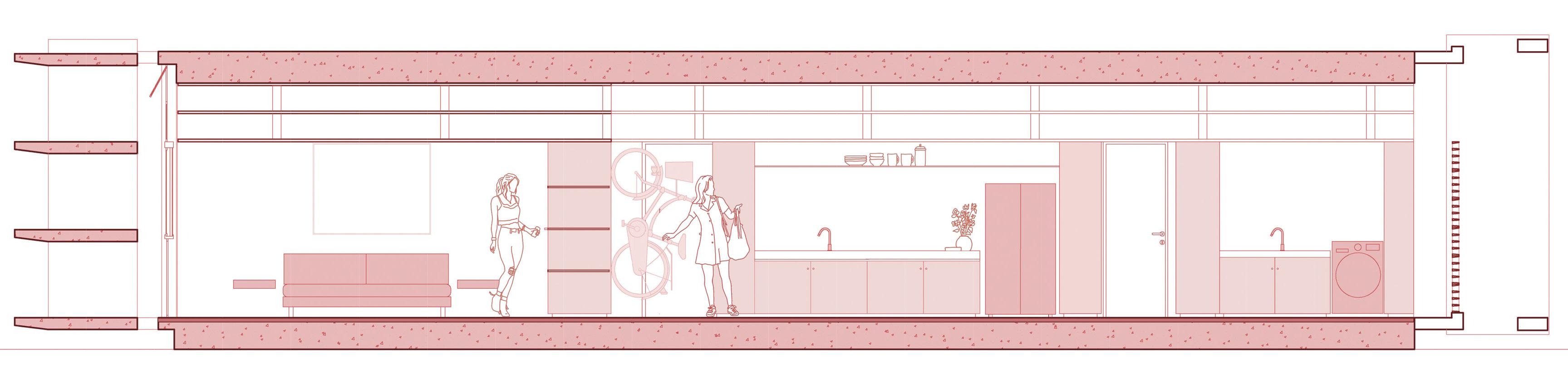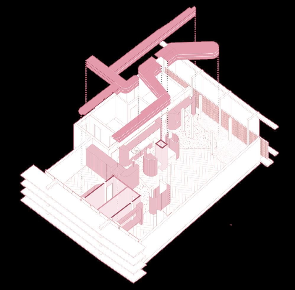O projeto de reforma, localizado no Edifício Copan, marco da arquitetura paulistana, adotou como partido principal a utilização de referências presentes na própria edificação que o abriga. Dessa maneira, o primeiro elemento pensado para a reforma foram as estantes suspensas, que se utilizam da mesma materialidade dos brises do copan e que, para além de servirem como estantes de apoio para a vasta coleção de livros das moradoras, funcionam como divisores entre as ambiências propostas. O projeto foi,
