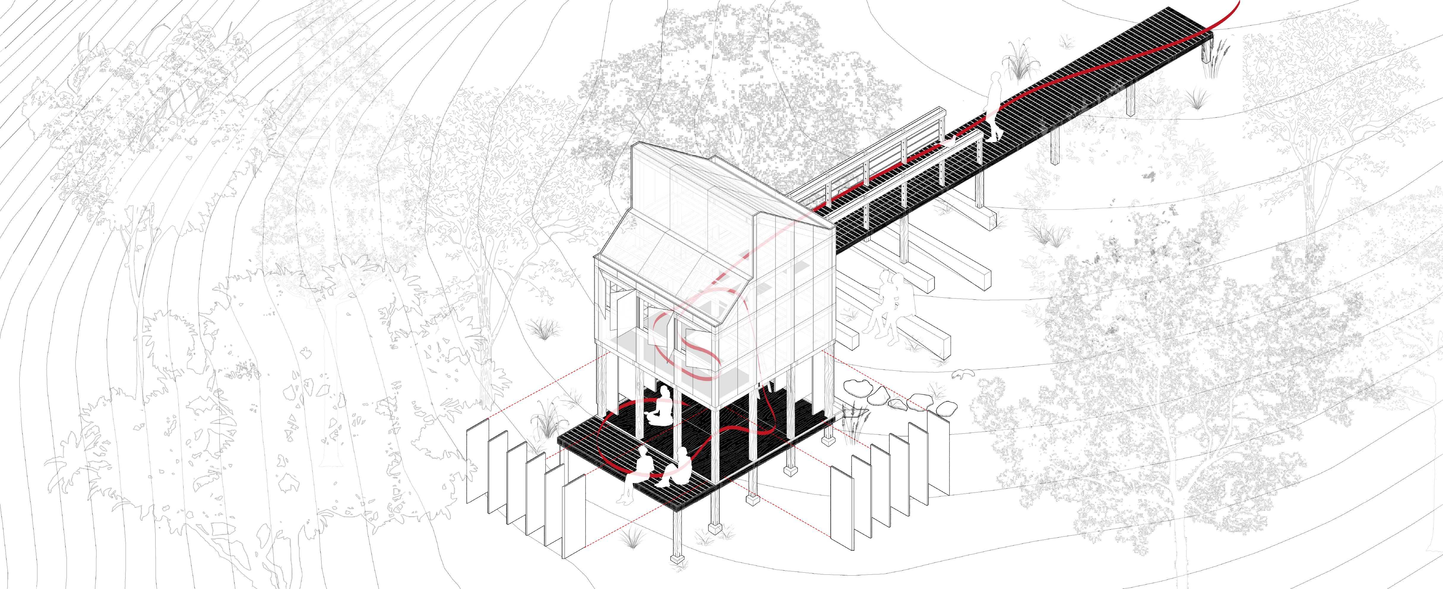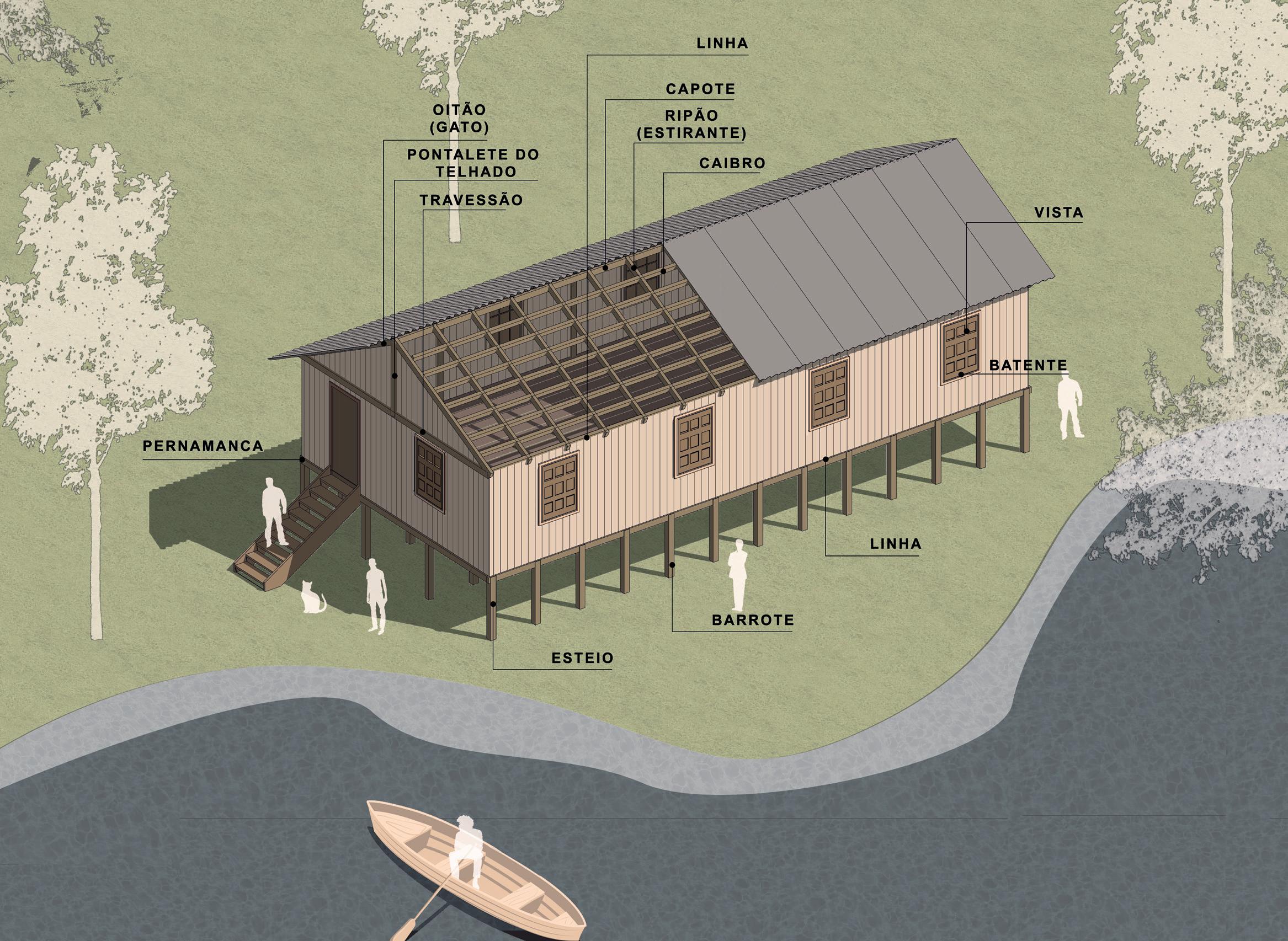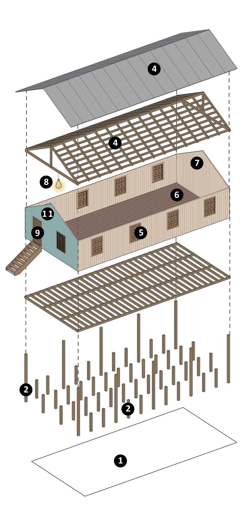 Para este concurso de arquitetura, foi utilizada uma estrutura em madeira pré fabricada e fechamentos em placas de policarbonato leitoso. A escolha desses materiais visou facilitar tanto na montagem/locomoção das peças, devido a dificuldade de acesso do sítio, como também para conseguir transformar o