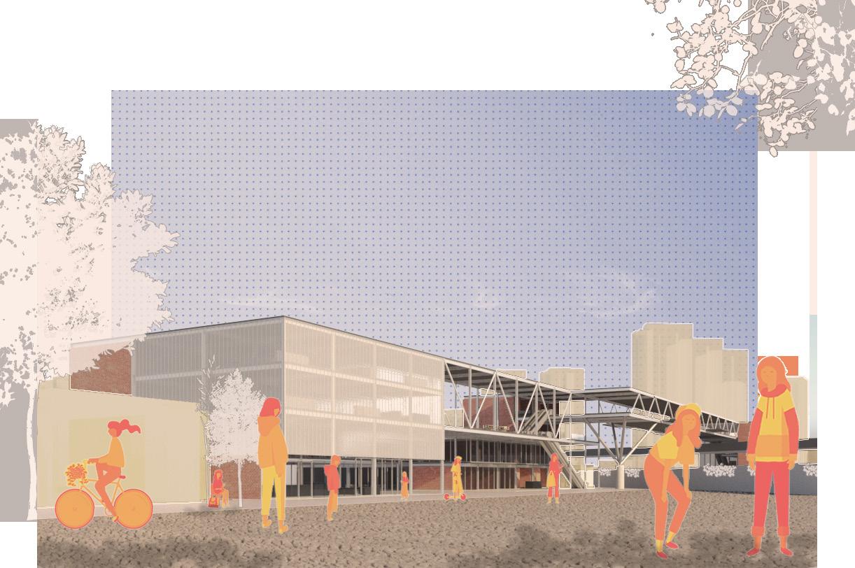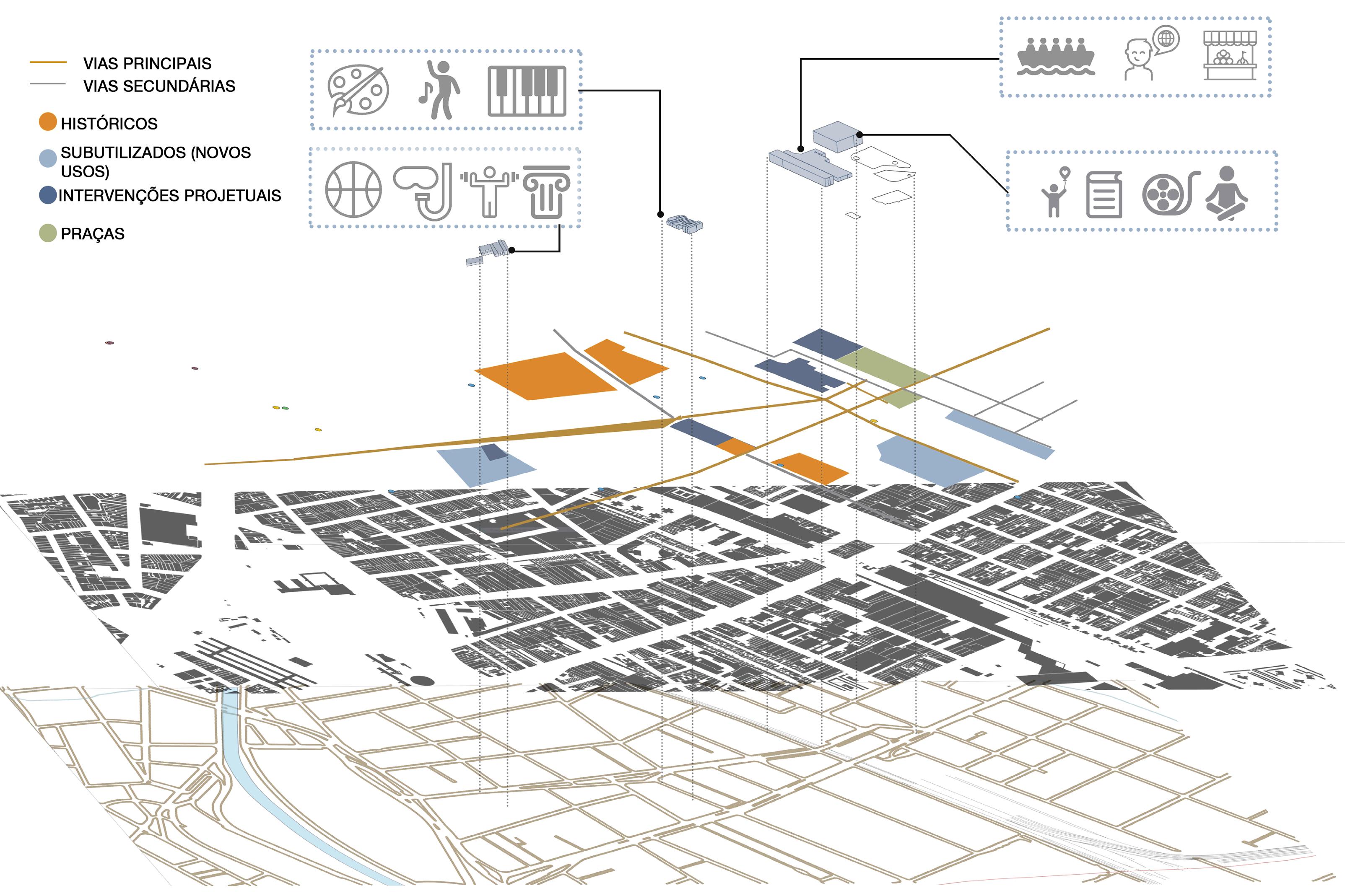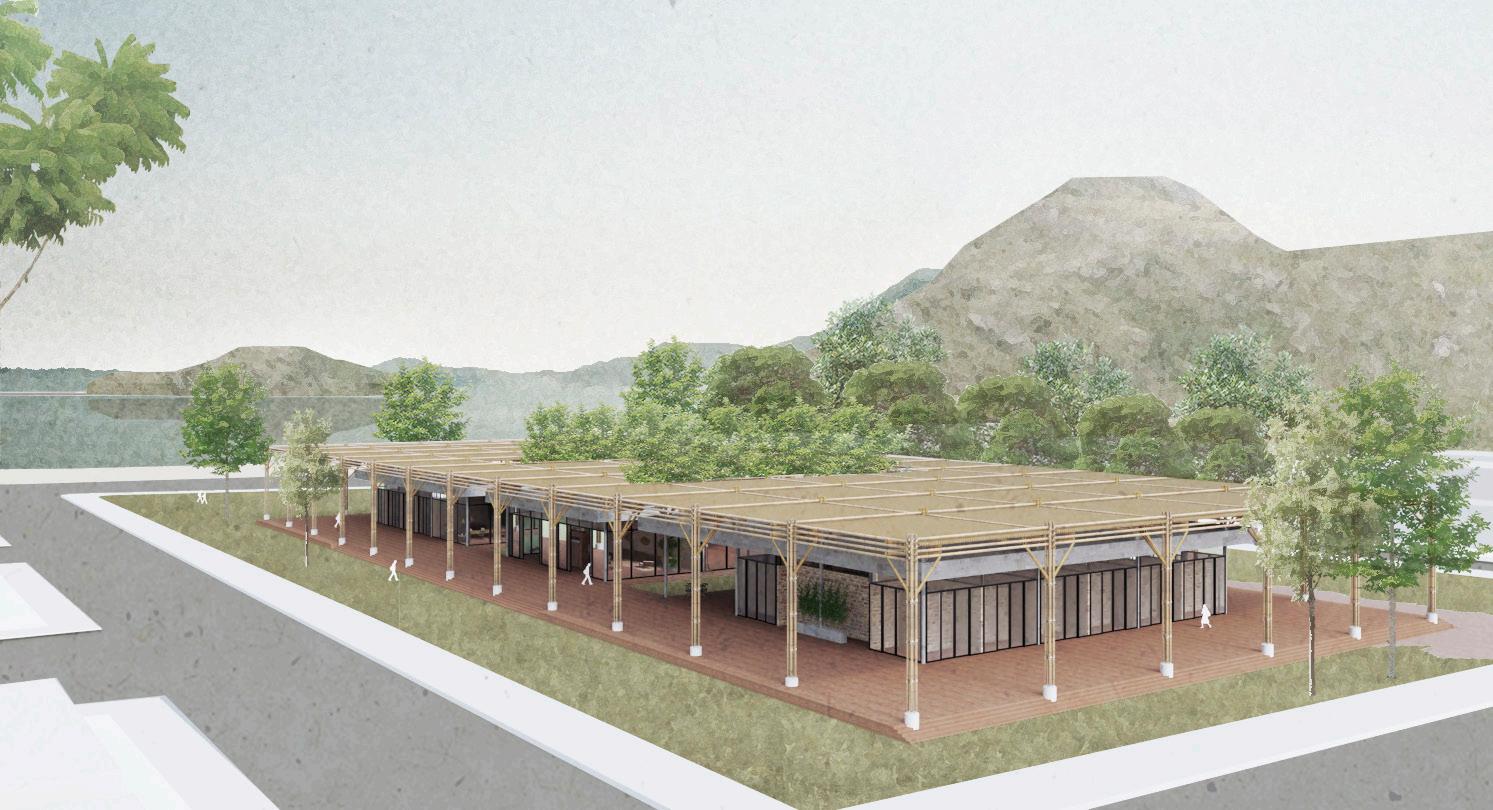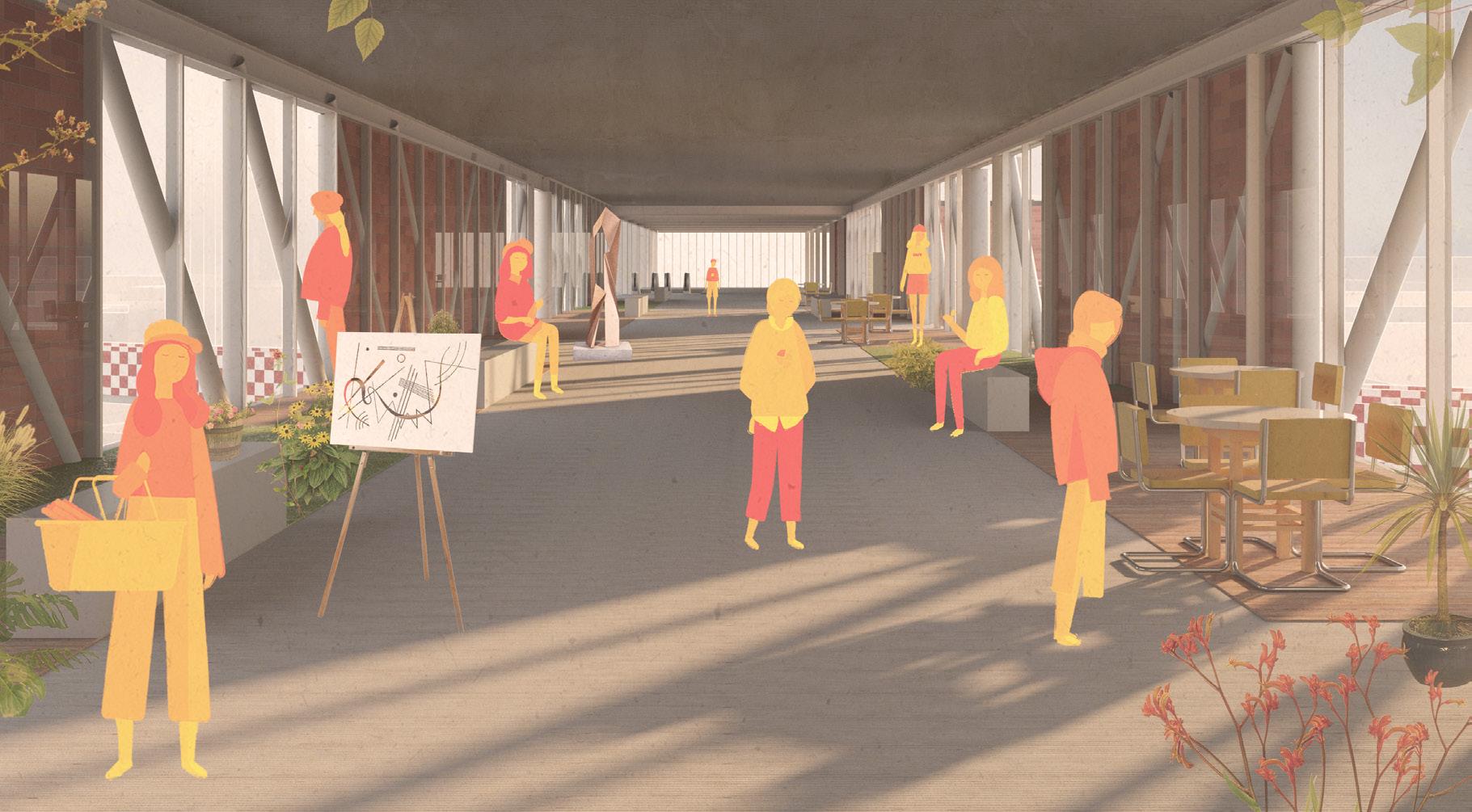 a partir de pequenas escadarias. Pequenas unidades modulares de diferentes usos complementam a paisagem com o intuito de trazer maior vitalidade e movimento para a área.