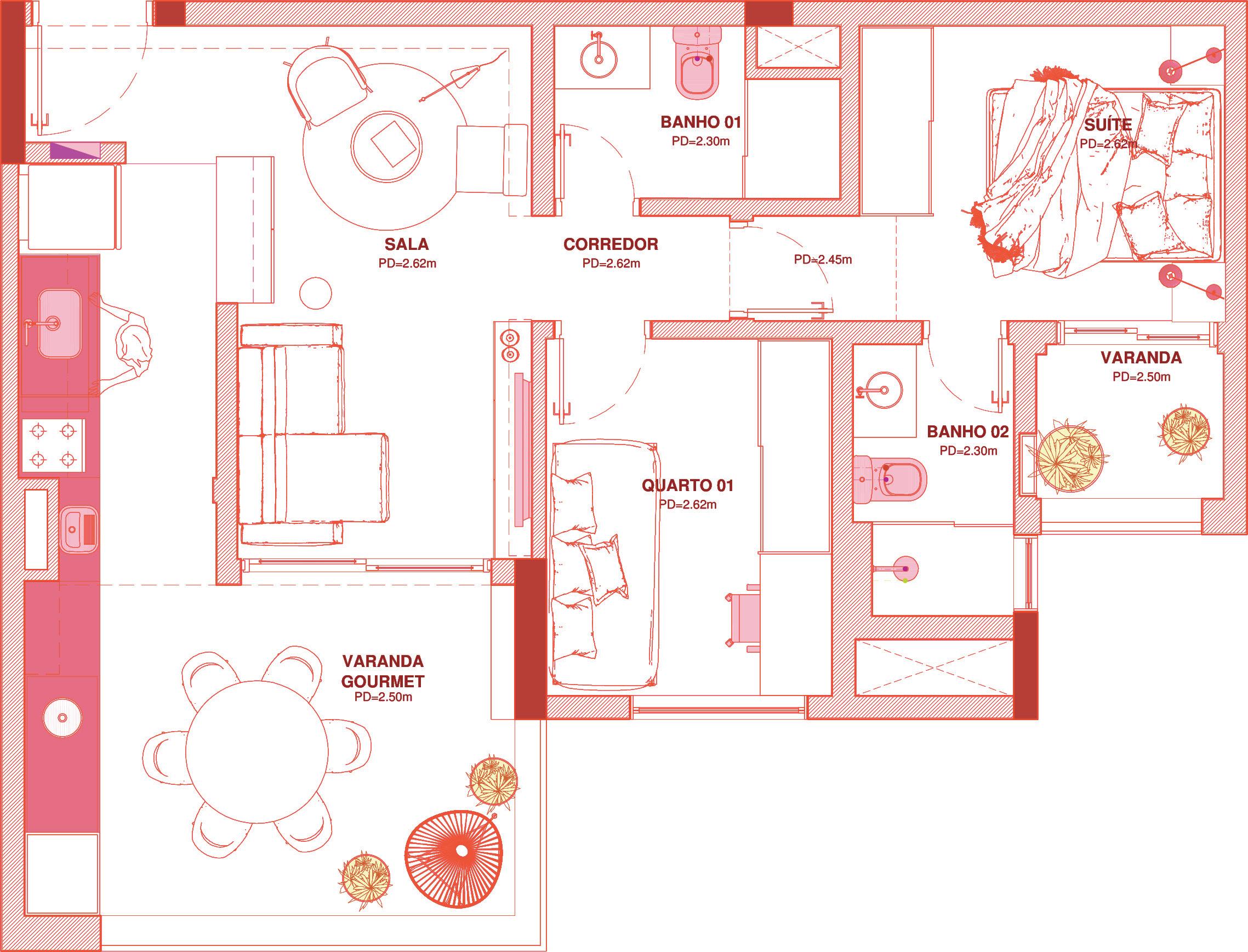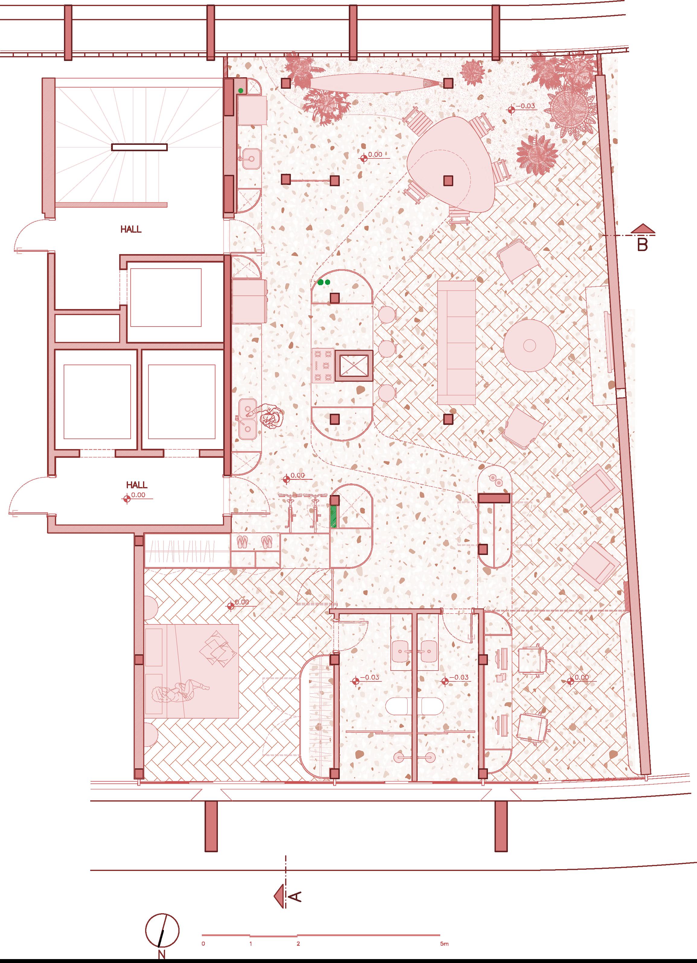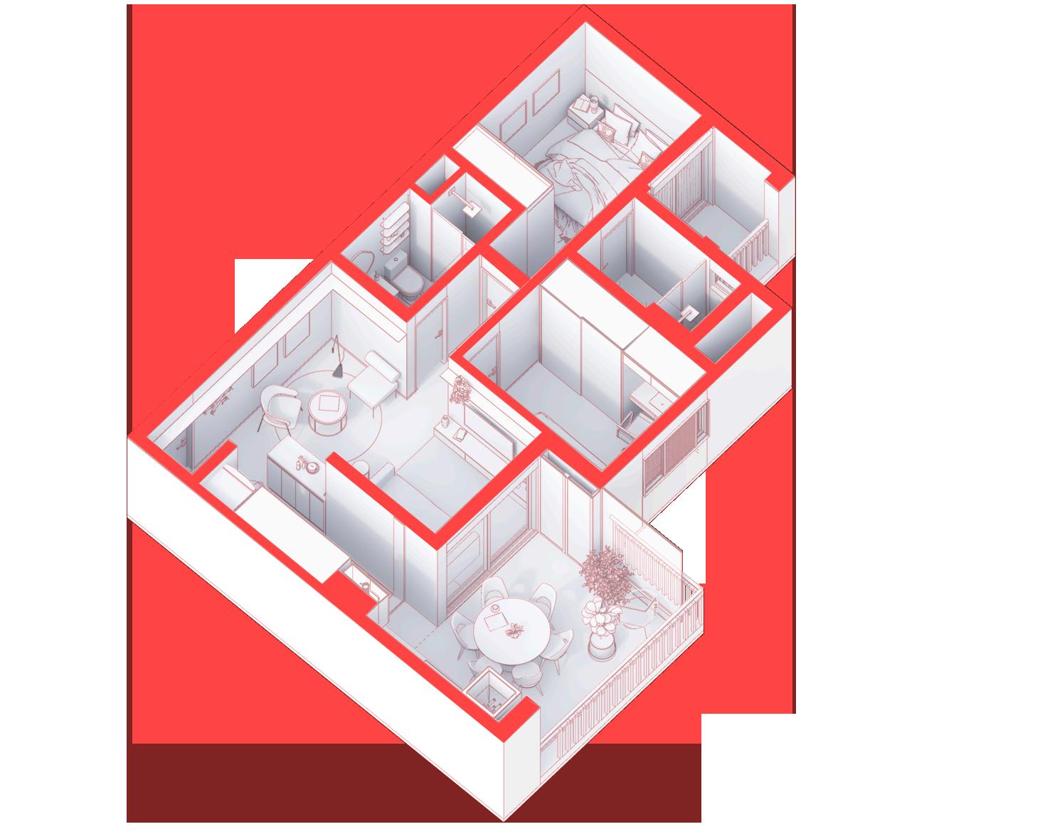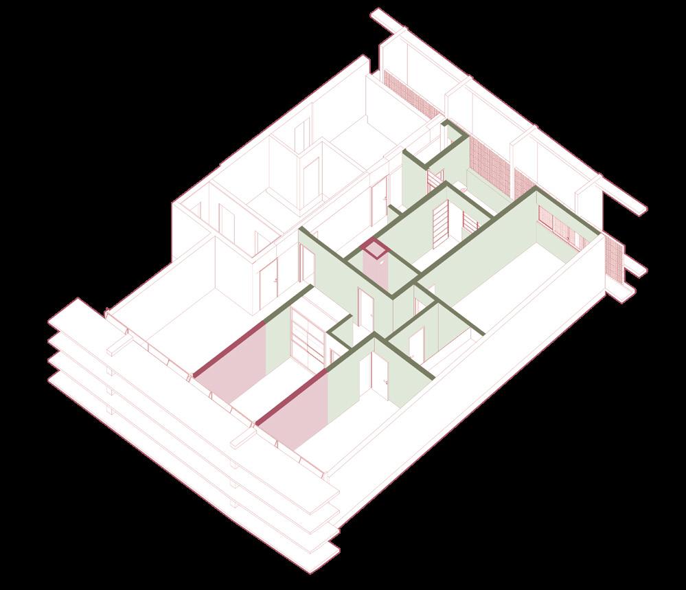 primordialmente, dividido em duas grandes áreas, uma pública, abarcando a varanda, a cozinha e a sala, contidas na face próxima ao cobogó, e uma privada, contendo o quarto, os banheiros e o escritório contidas na face próxima aos brises. Os fechamentos e divisórias, com exceção da alvenaria dos banheiros, foram feitos utilizando armários de madeira freijó e possuem um desenho orgânico não-ortogonal, que segue como padrão em diversos outros componentes do projeto.