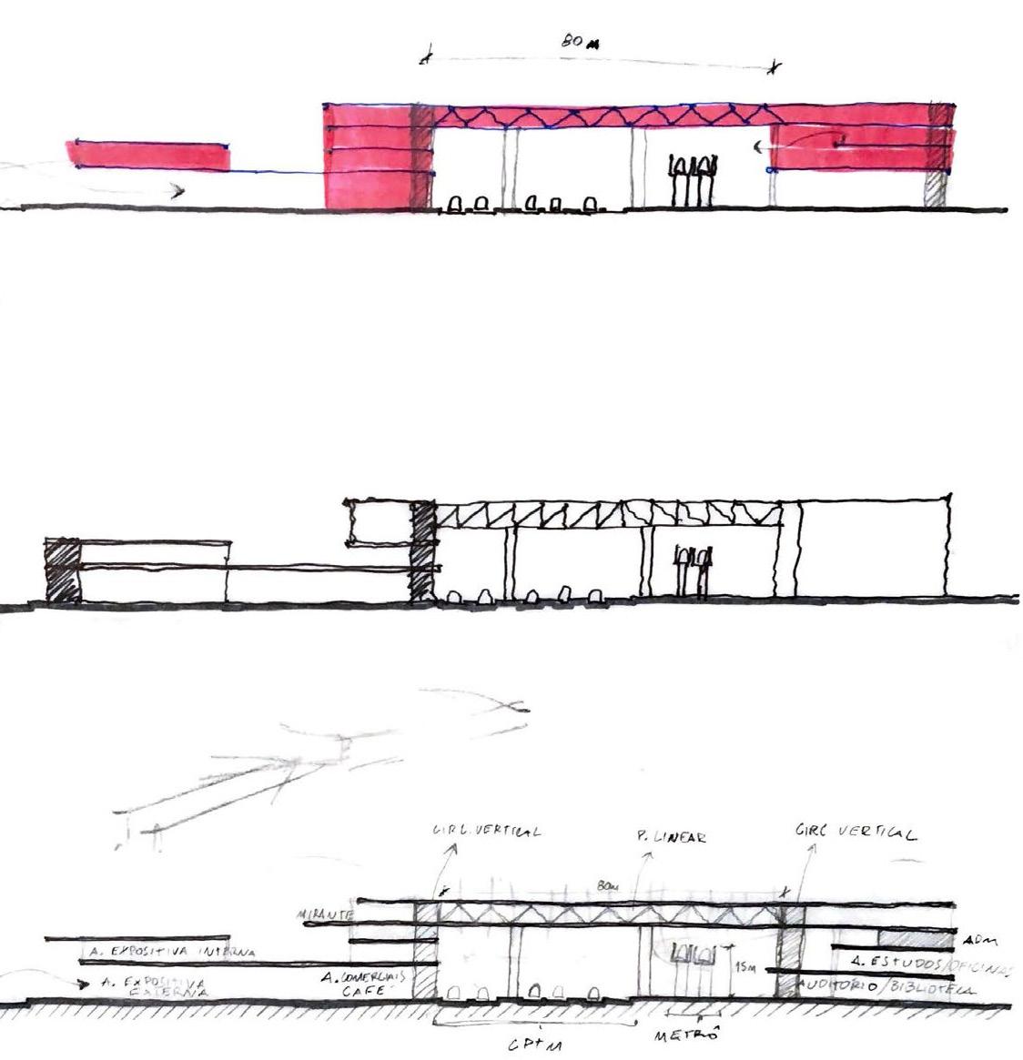 suas faces, integrando o projeto à cidade. O espelho d´água proposto no projeto urbano foi ampliado de modo a mesclar-se com o uso público e criar visuais a partir da área expositiva e infantil. A partir do avanço do volume do primeiro pavimento criou-se uma área de convivência externa integrada à um espelho d´água sobre laje.