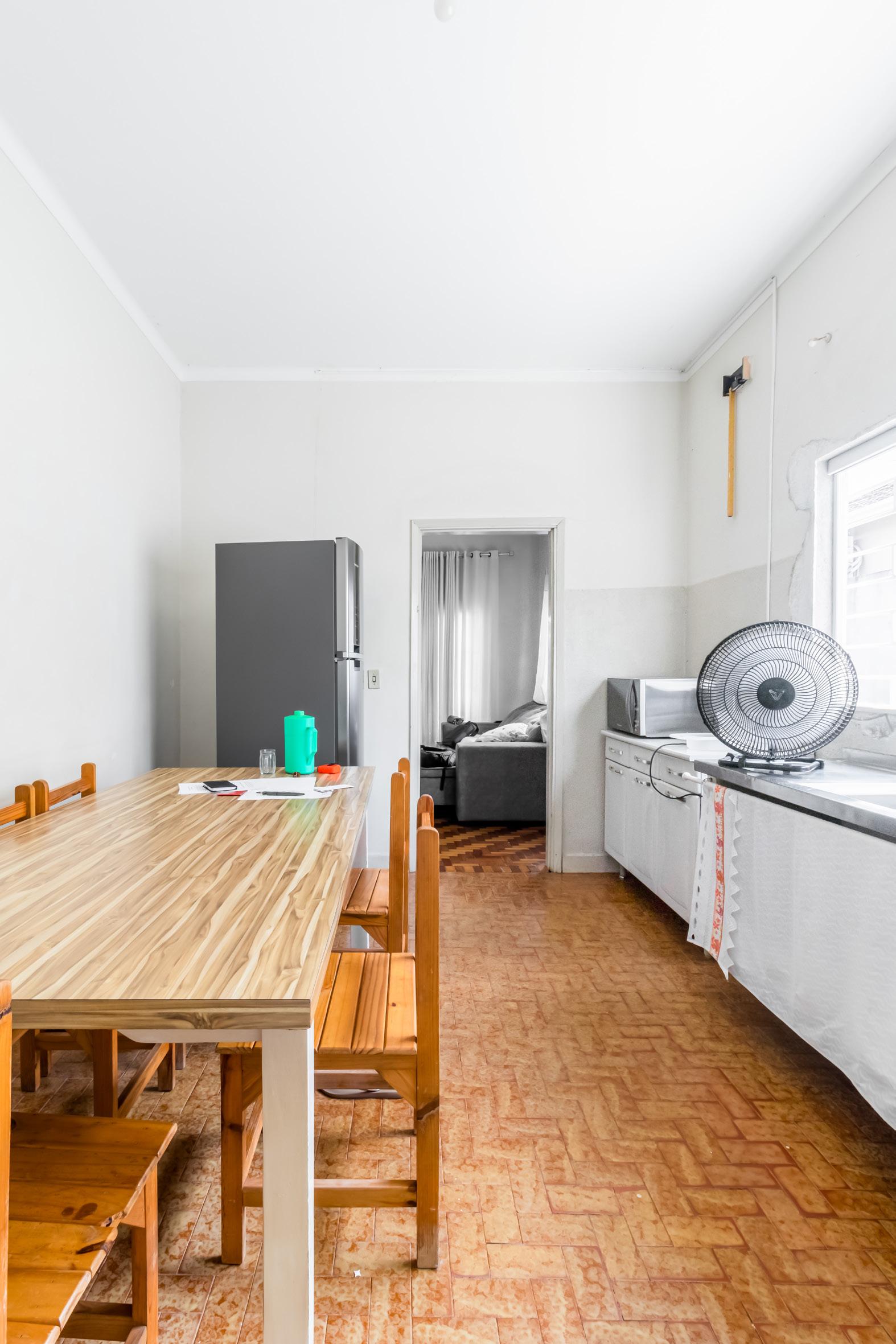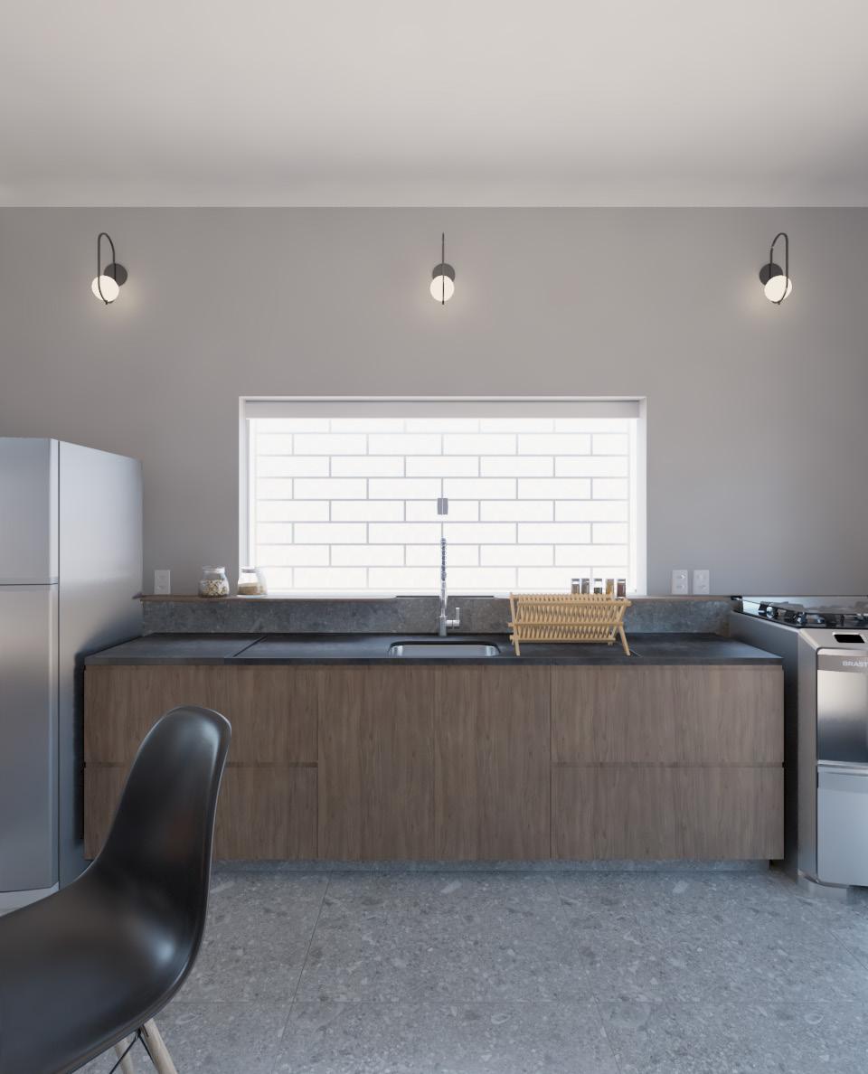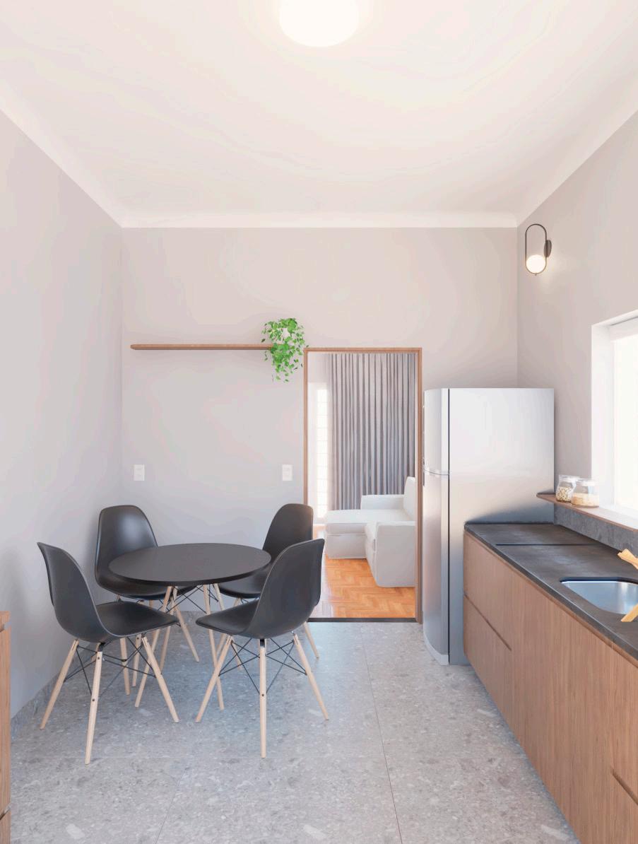 Para este projeto de pequena escala, mudamos o piso, a disponibilização da geladeira focando na praticidade do espaço, criamos uma bancada em ardosia, fizemos um armário alto com gaveta porta-vassouras e trocamos a mesa que existia antigamente por um espaço mais compacto.
