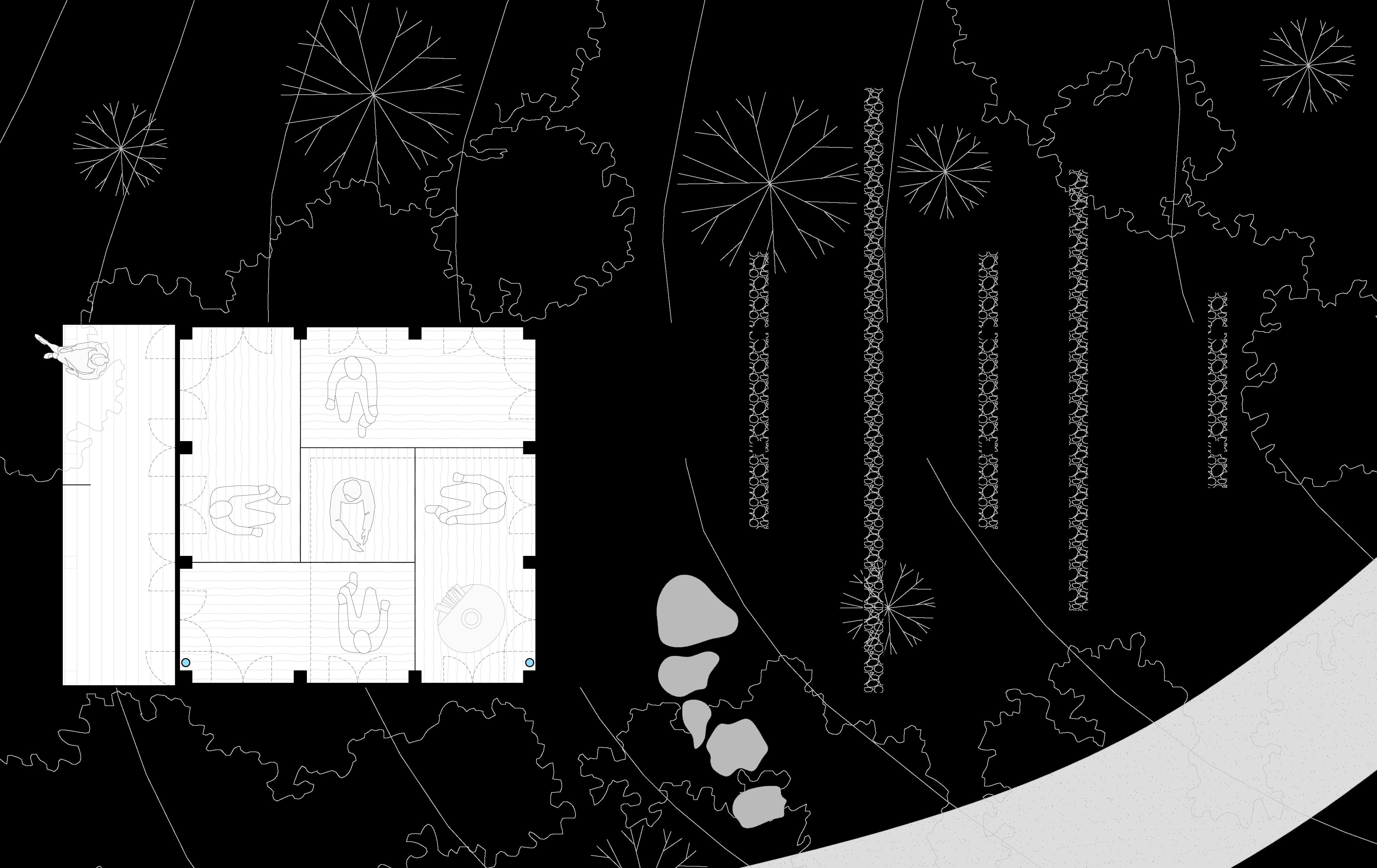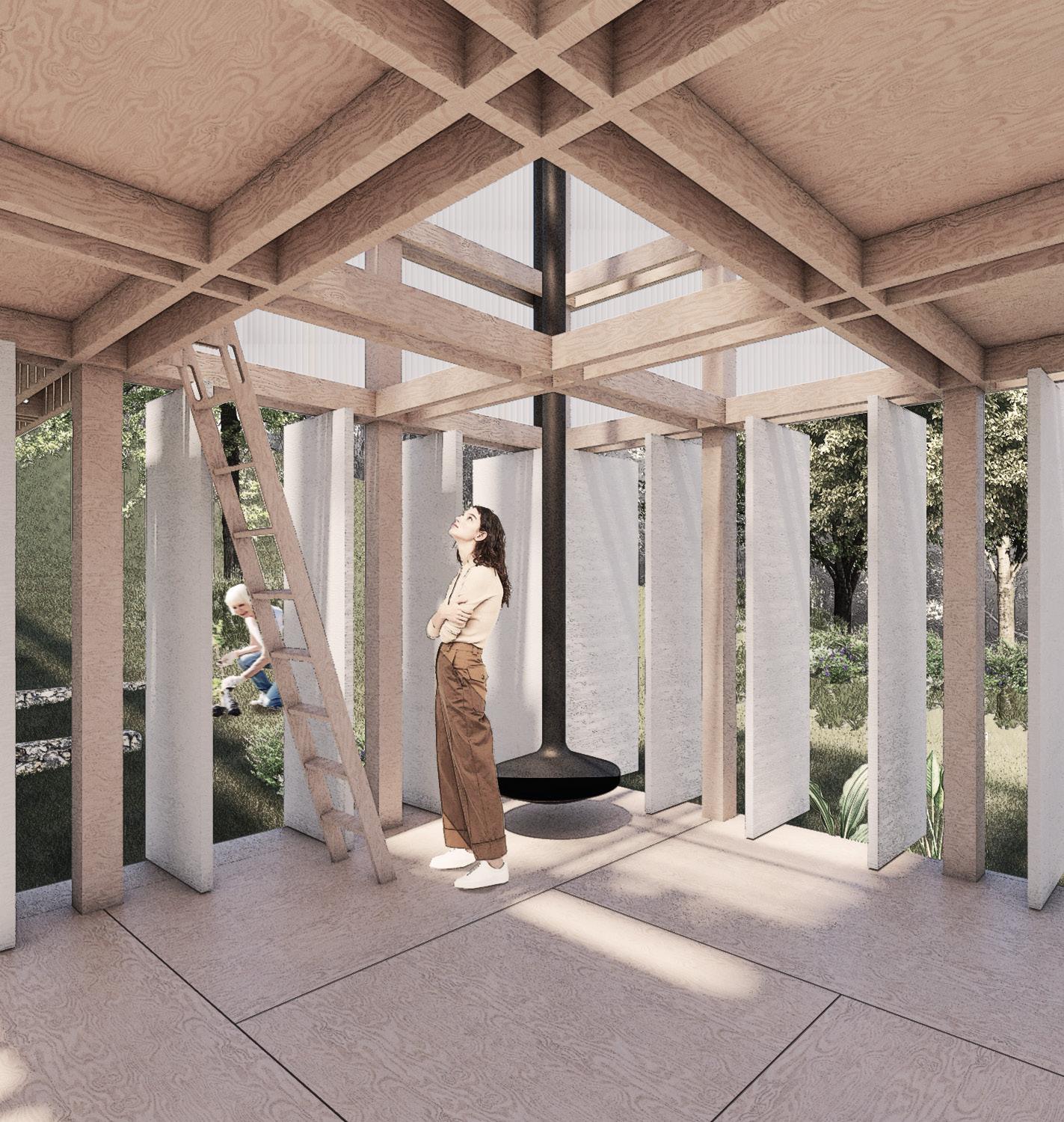 projeto em um farol de luz na floresta, sem a necessidade de uso de iluminação artificial durante o dia. Assim, permite-se que a luz solar entre tanto no mezanino, usado para produção de essências naturais, como na área de meditação localizada no terreo da cabine.