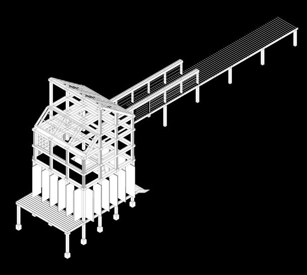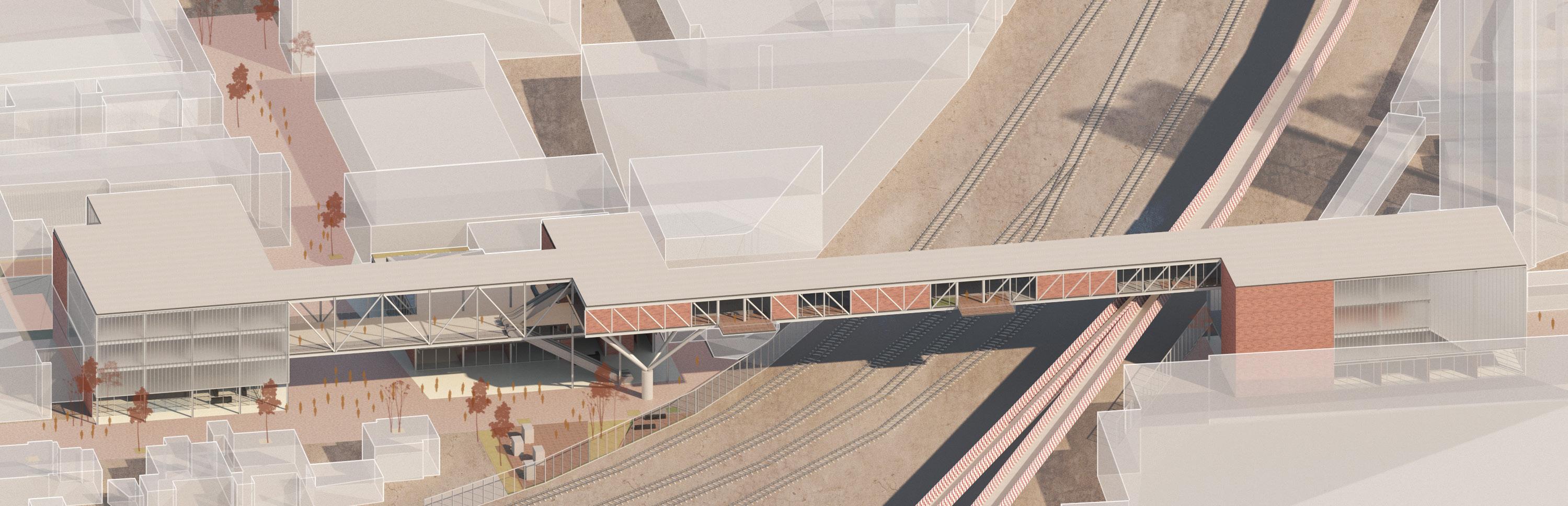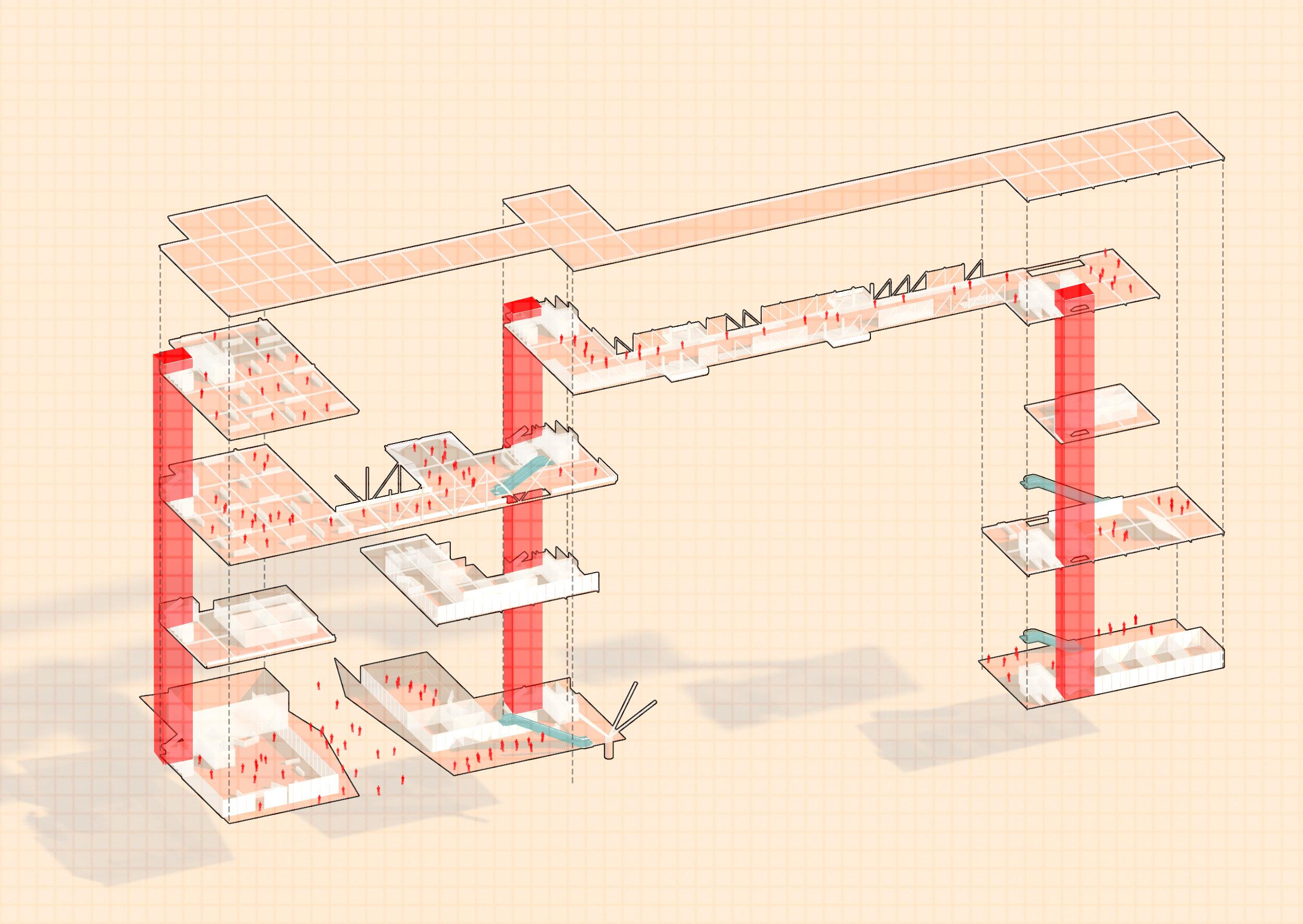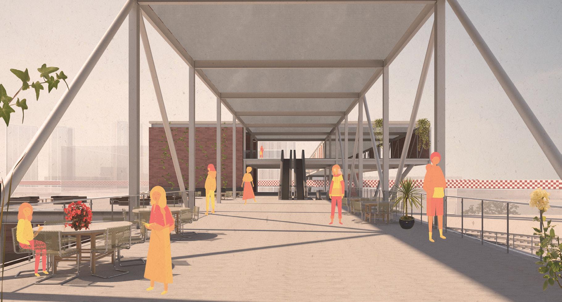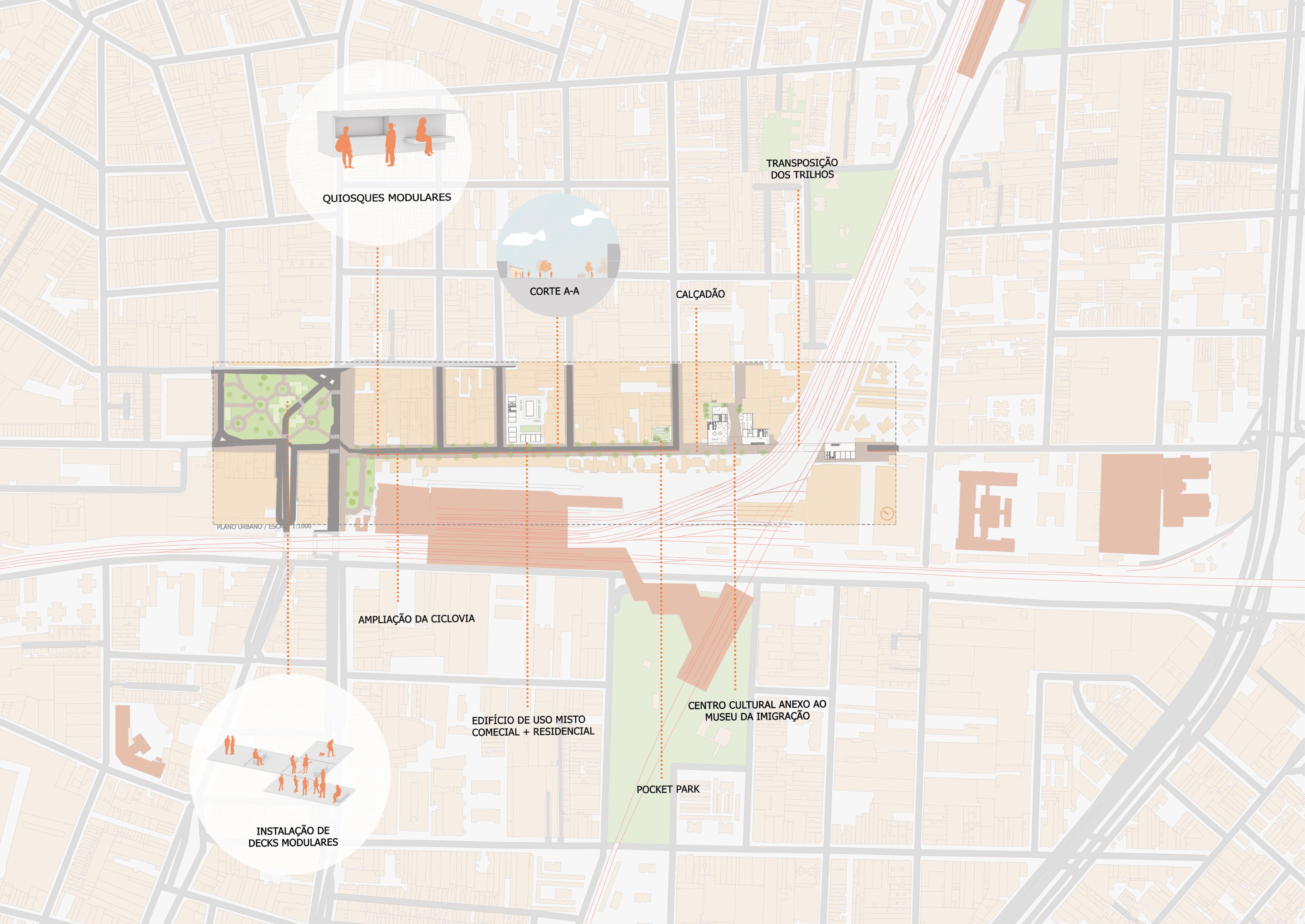 Tal reconexão foi feita através de um edifício ponte que abriga usos relacionáveis ao Museu da Imigração. Sua implantação foi definida através da análise dos principais fluxos e, dessa forma, as praças internas foram alocadas. O acesso à passarela é feito através de escadas rolantes paralelas ao percuso principal do projeto.