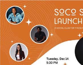 This page features my designs for the Soco Social launch party. The upper left displays the print designs, including an "Honoring Station" prompt and the event program. The lower left showcases social and event graphics used for promoting the event. These designs were carefully created to capture the spirit of Soco Social and create visual impact for attendees and online audiences.