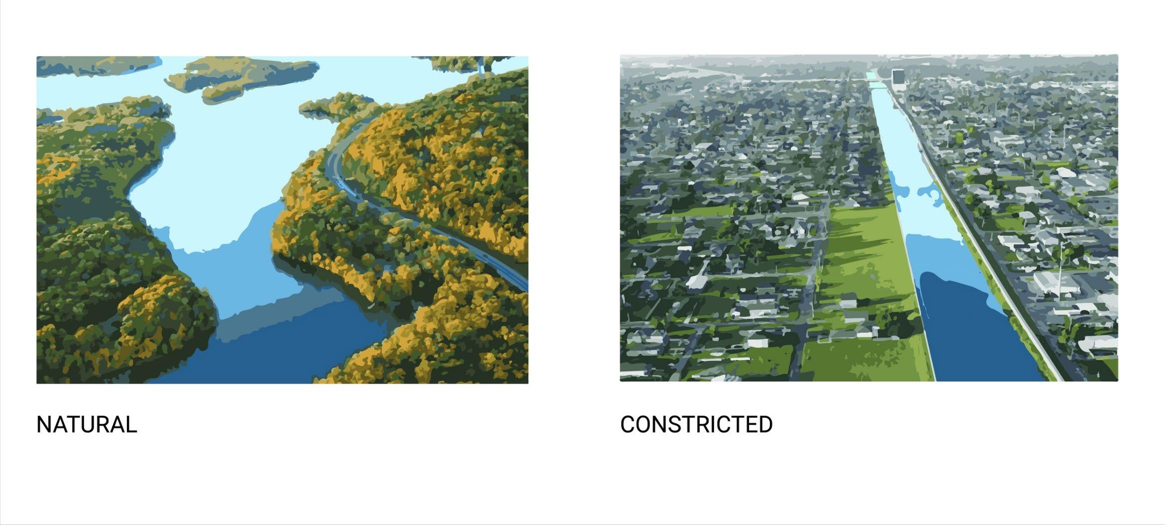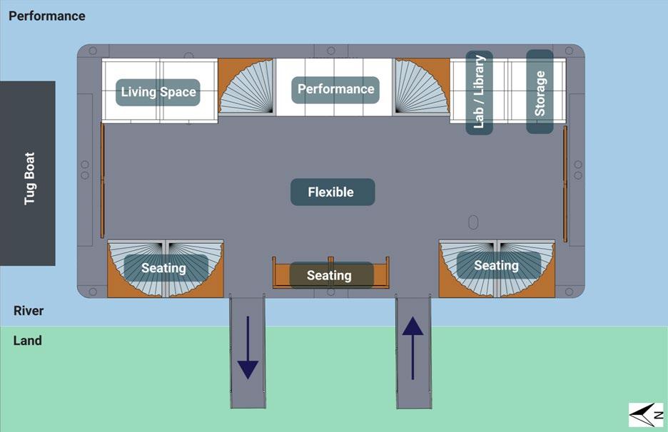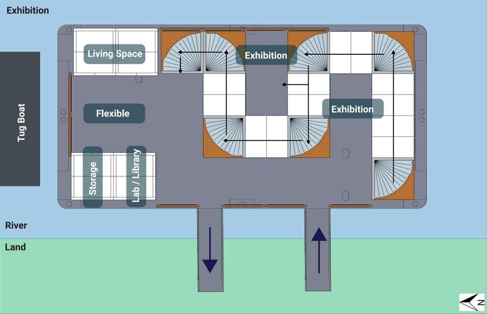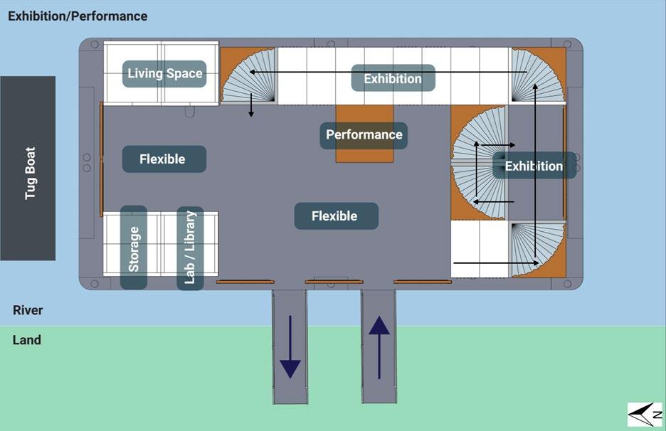 Our design proposal for the floating barge exhibition is focused on the connection between people, land and water. Our proposal achieves this by bringing a connection to the Mississippi River through the form of our design and blending it in with nature rather than invading. To do this, we wanted the form to represent natural and constricted forms to mimic the shape of the river. We provided a system consisting of square modules that insert into each other to allow for adaptability of program needs. Throughout the project are accordion structures that break up the hard edges of the square modules to make the form flow more naturally.