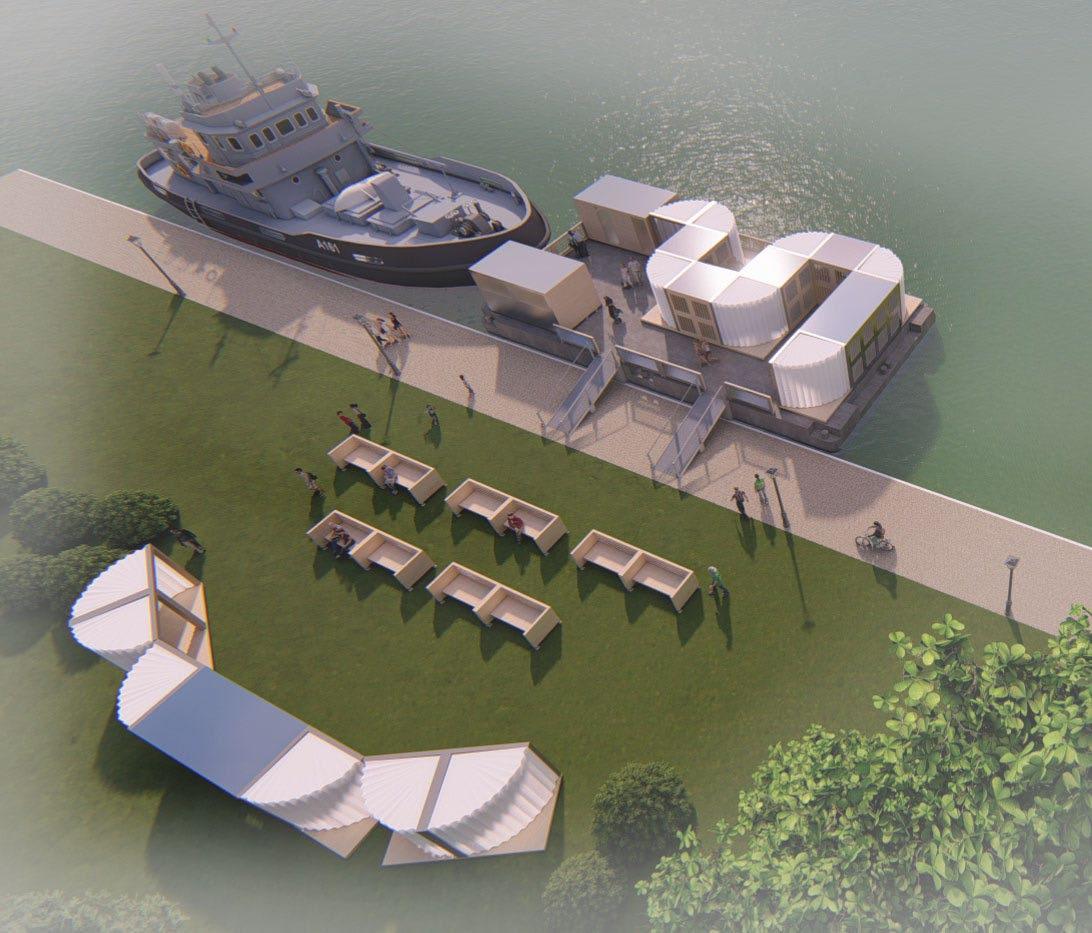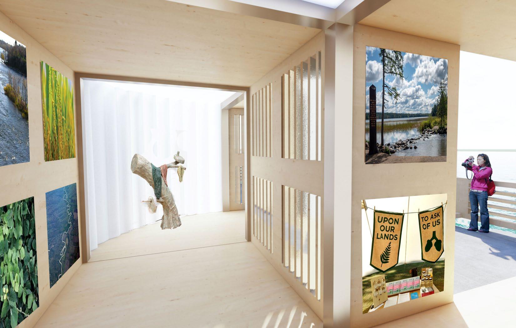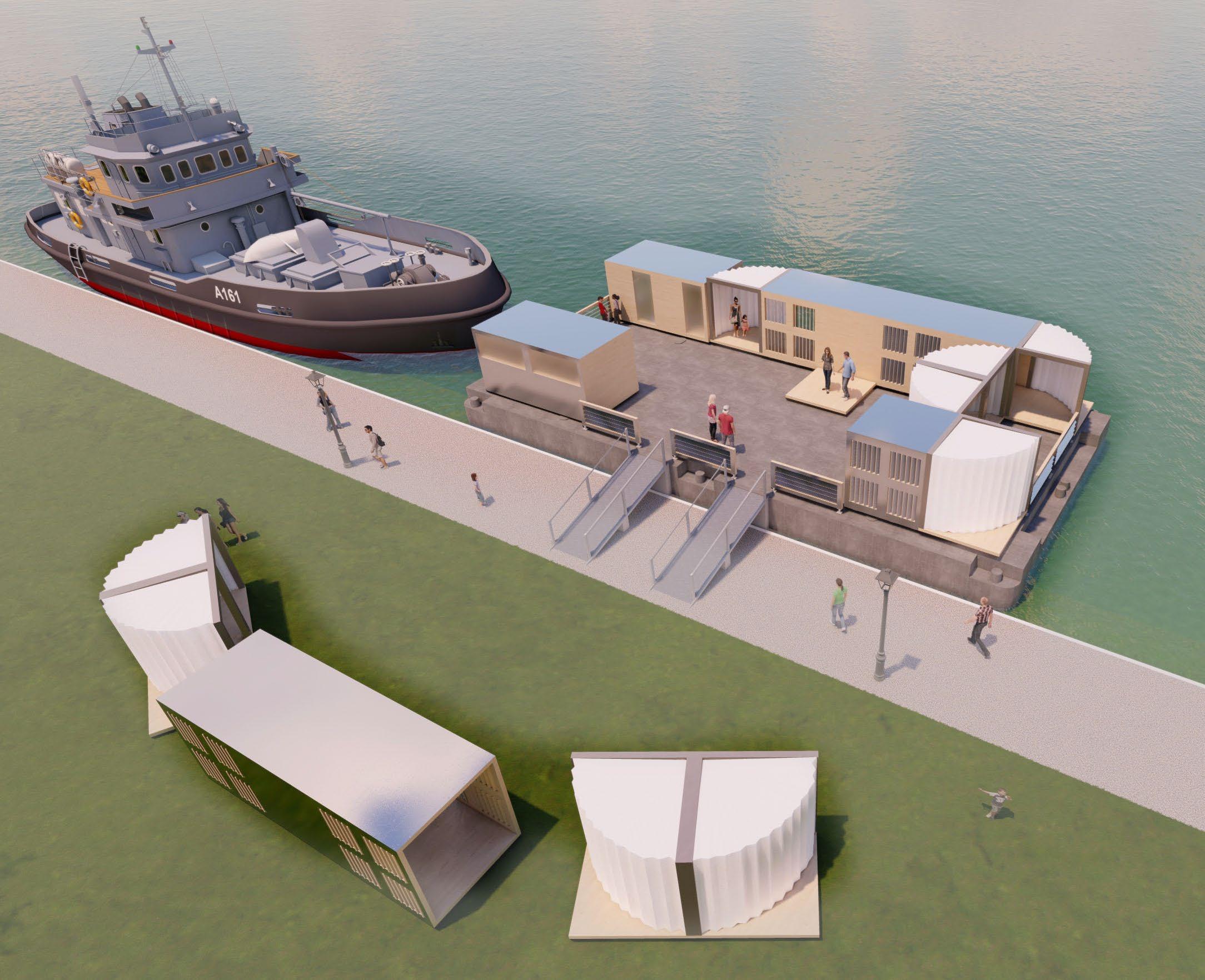 Our design proposal for the floating barge exhibition is focused on the connection between people, land and water. Our proposal achieves this by bringing a connection to the Mississippi River through the form of our design and blending it in with nature rather than invading. To do this, we wanted the form to represent natural and constricted forms to mimic the shape of the river. We provided a system consisting of square modules that insert into each other to allow for adaptability of program needs. Throughout the project are accordion structures that break up the hard edges of the square modules to make the form flow more naturally.
