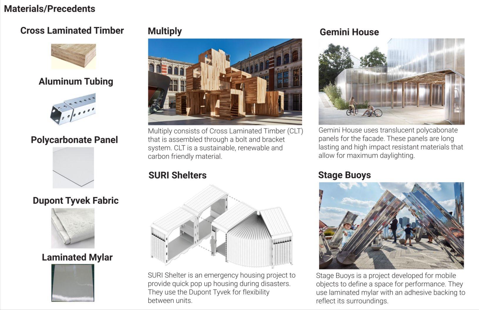To make the design blend in with nature, we decided to add laminated mylar to the exterior of the modules to reflect its surroundings This allows the de- sign to become a literal reflection of nature and gives visitors the opportunity to see themselves within nature This provides a unique and inspiring look, while also giving visitors a different perspective of viewing the Mississippi River and its surroundings. Overall, we wanted to offer a natural and open design that allowed the visitor to experience all the great things the Mississippi River provides us and share those experiences to inspire others around the world. Group Project: Marina