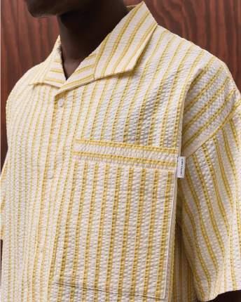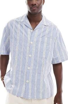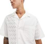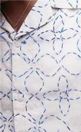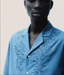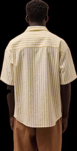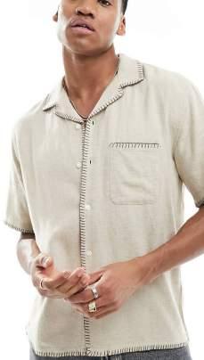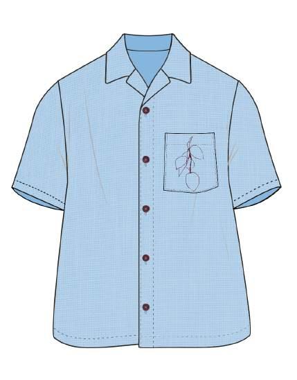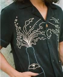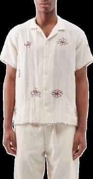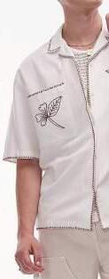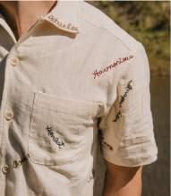 >Camp collar shirt: short sleeve,camp collar,boxy t, front pocket embroidery. Cotton linen blend.