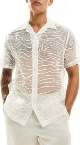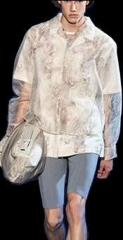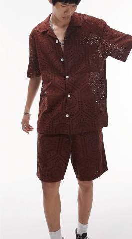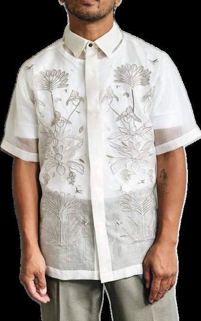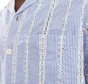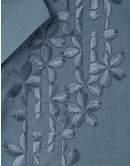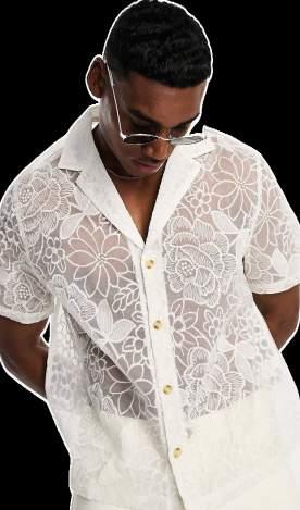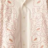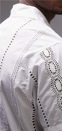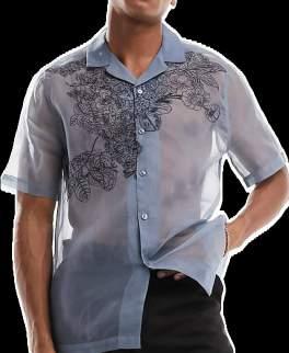 >Flowy shirt: semi sheer plain woven nylon and cotton blend shirt. Long dropped sleeve,long t. All over oral see-throughout embroidery.