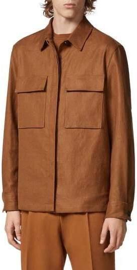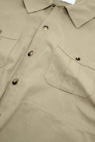 >Utility shacket: short sleeve, hidden zip closure,multi pockets. Cotton twill fabric. Garment dye.