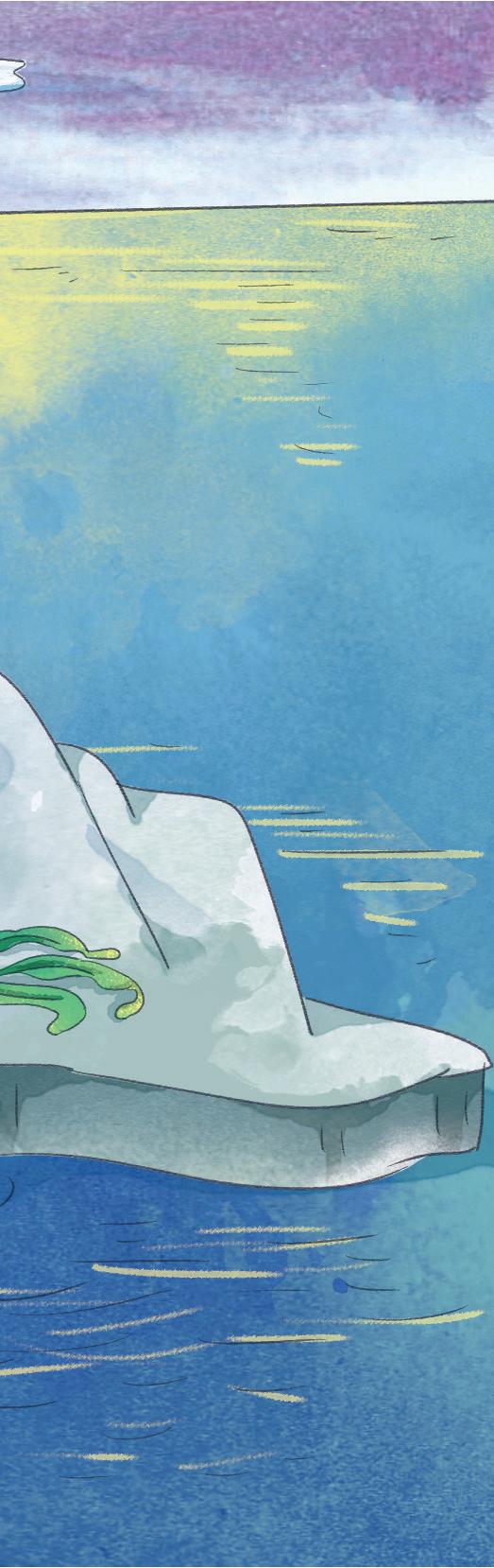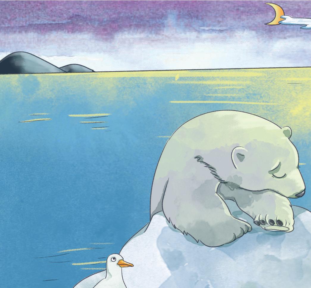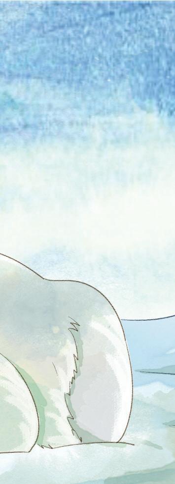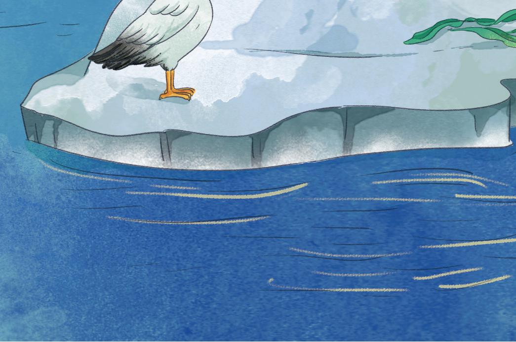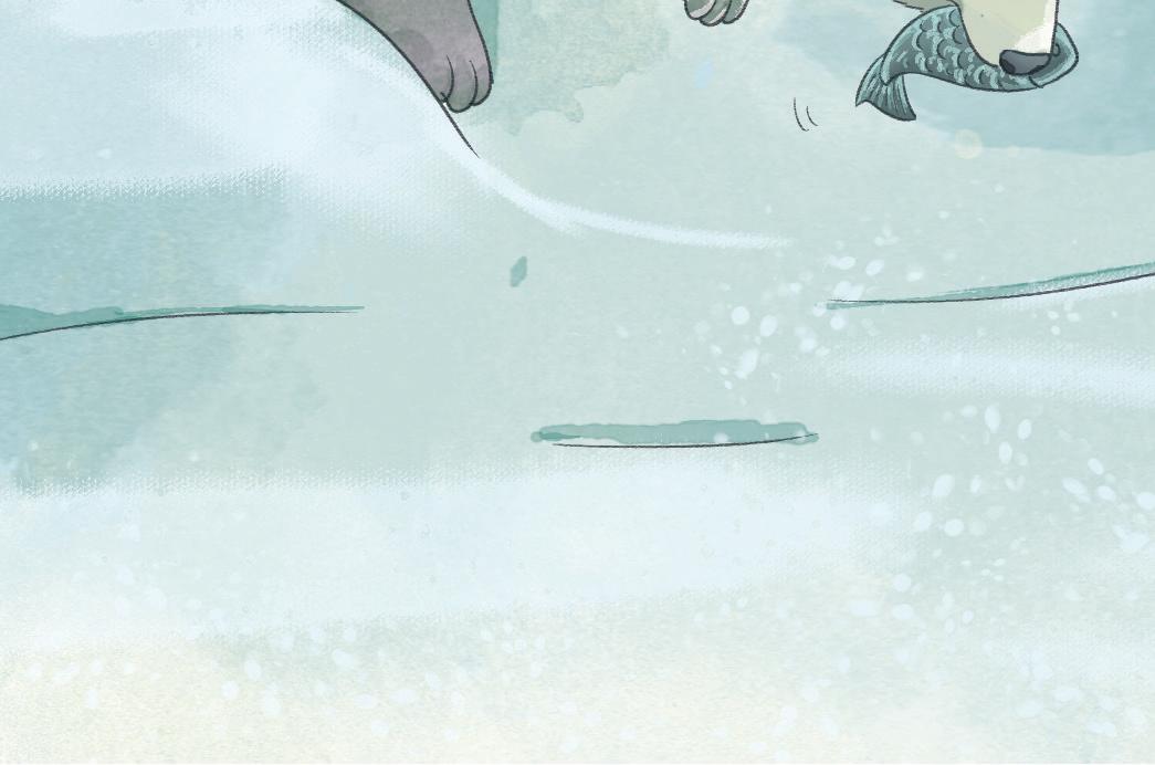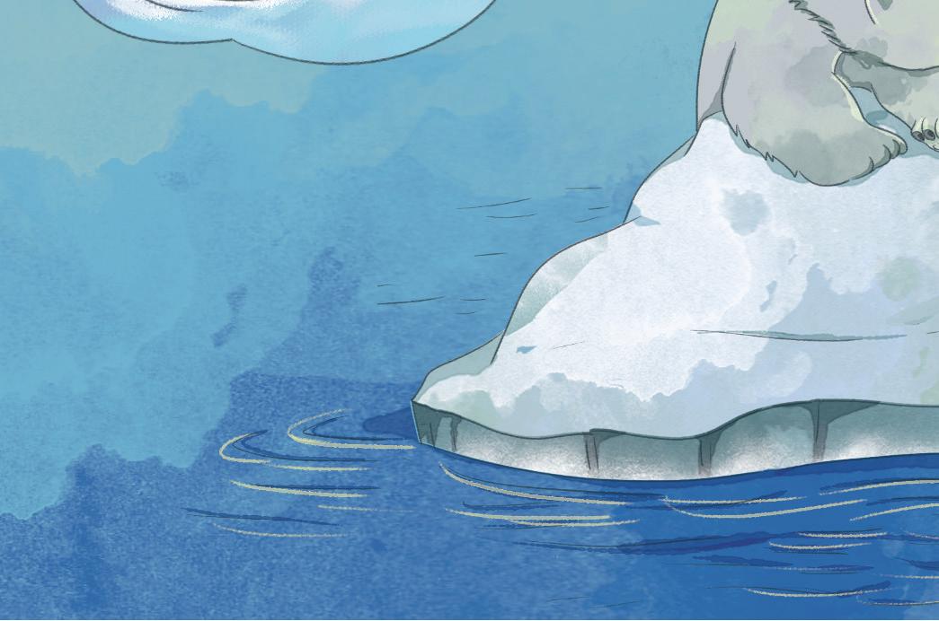 一天,妈妈又出去找食物,小白自己在冰 上玩儿。脚下的冰裂了,冰块带走了小 白。