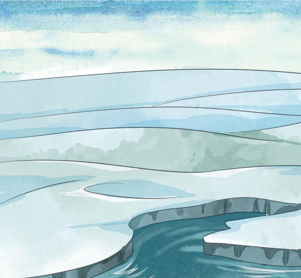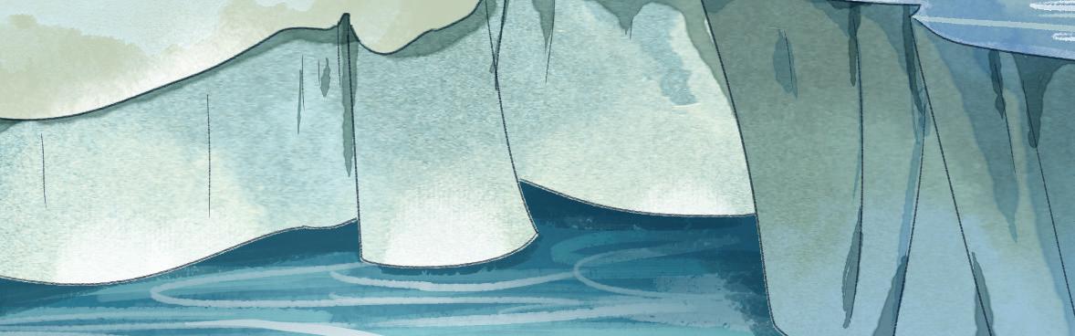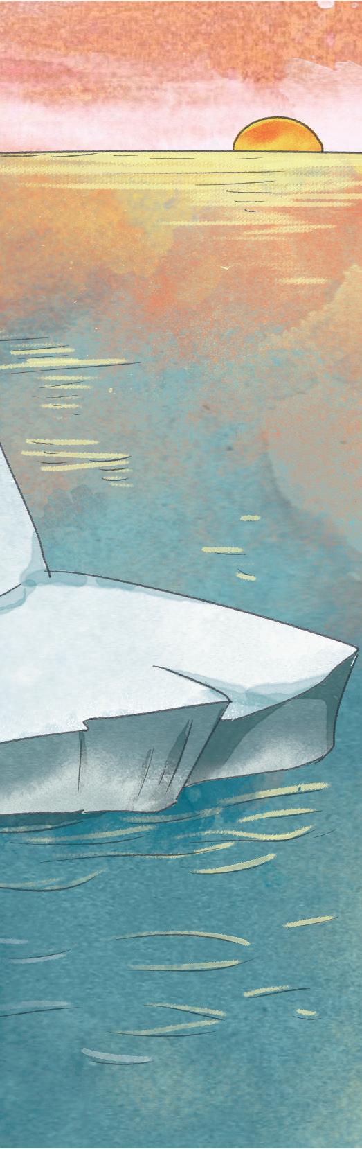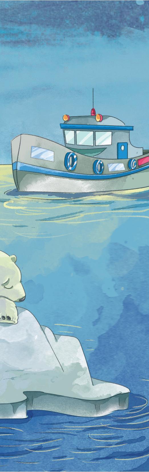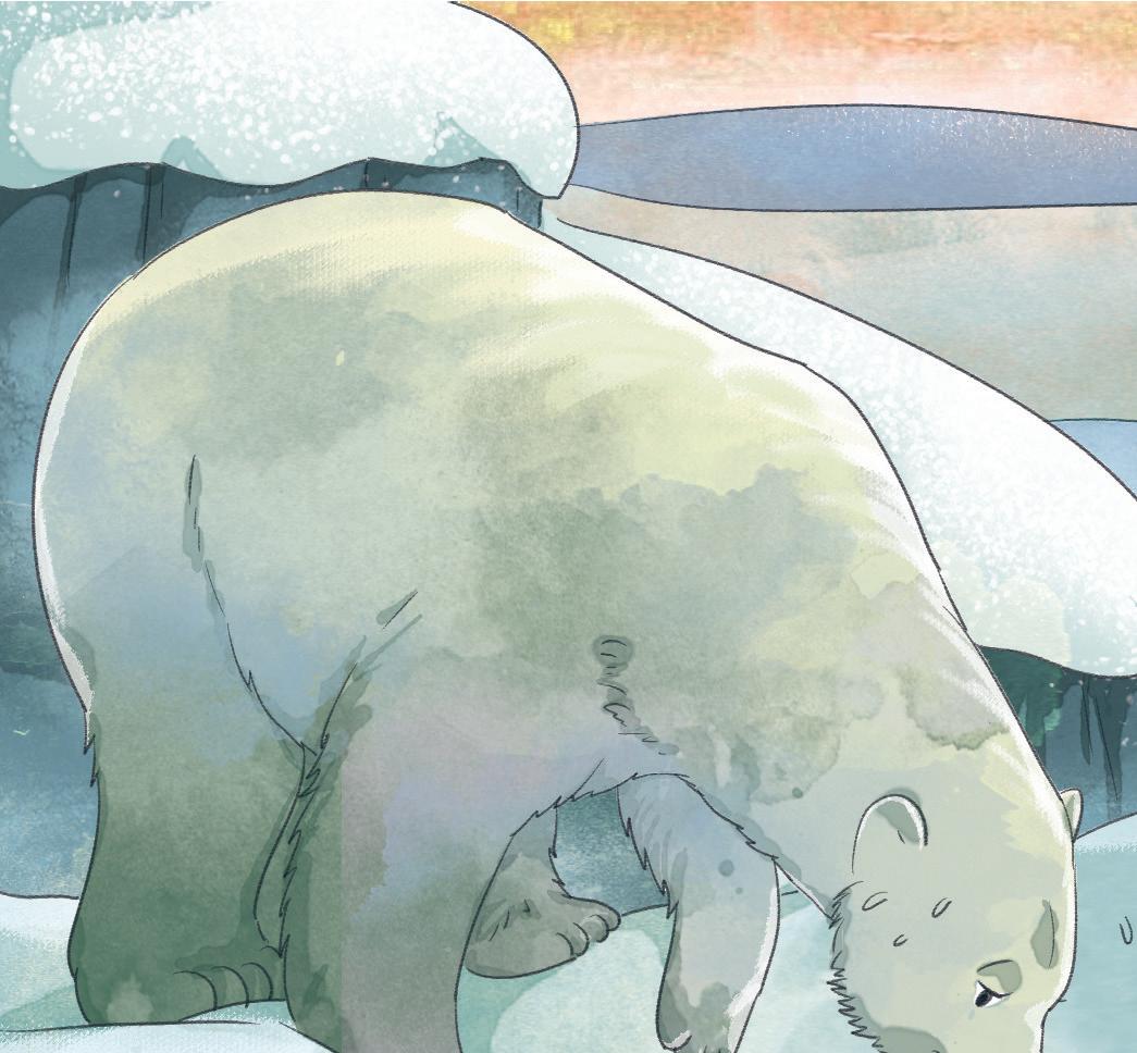 一天,妈妈又出去找食物,小白自己在冰 上玩儿。脚下的冰裂了,冰块带走了小 白。