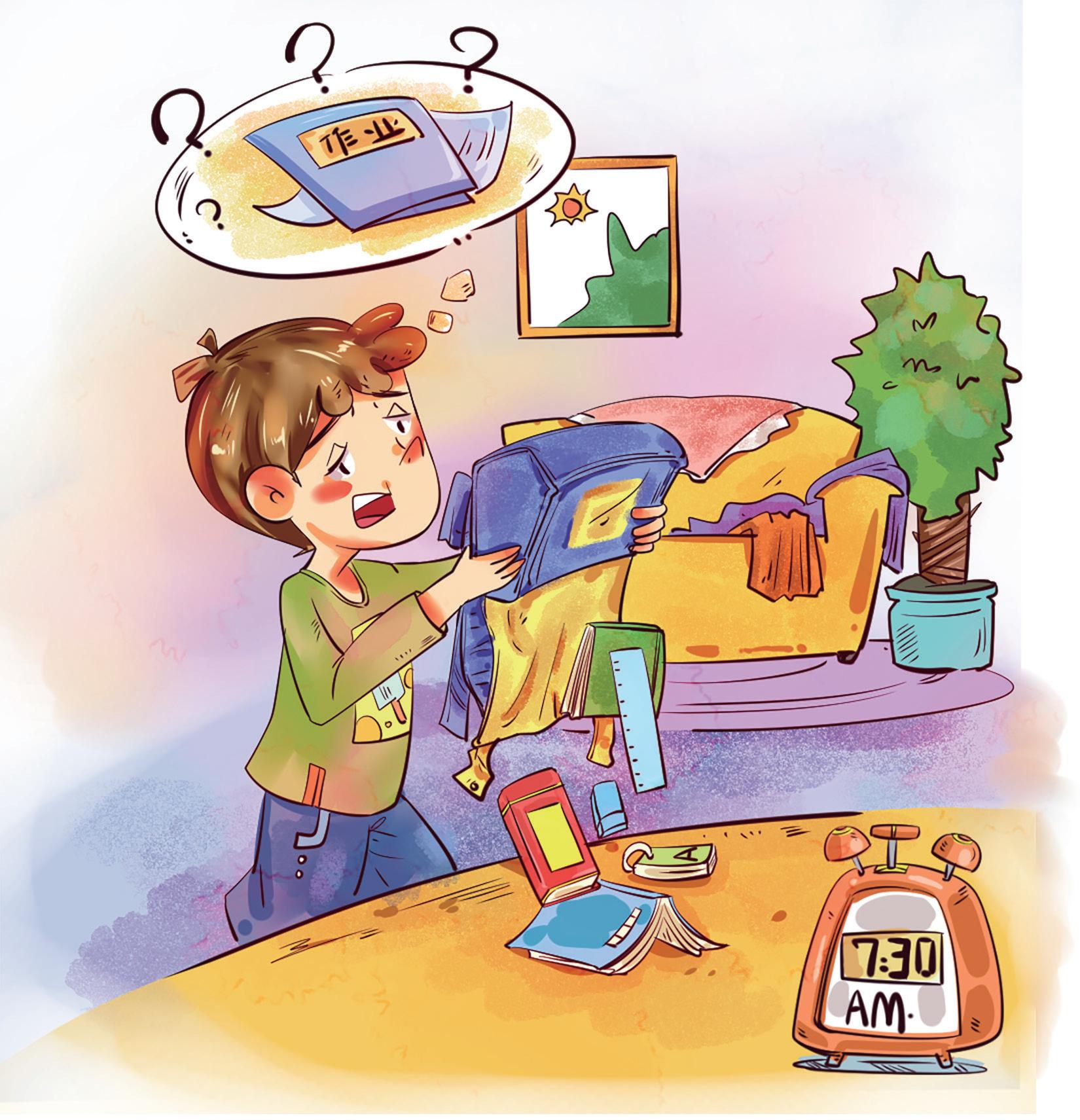 早上七点二十分, 小明找书包。