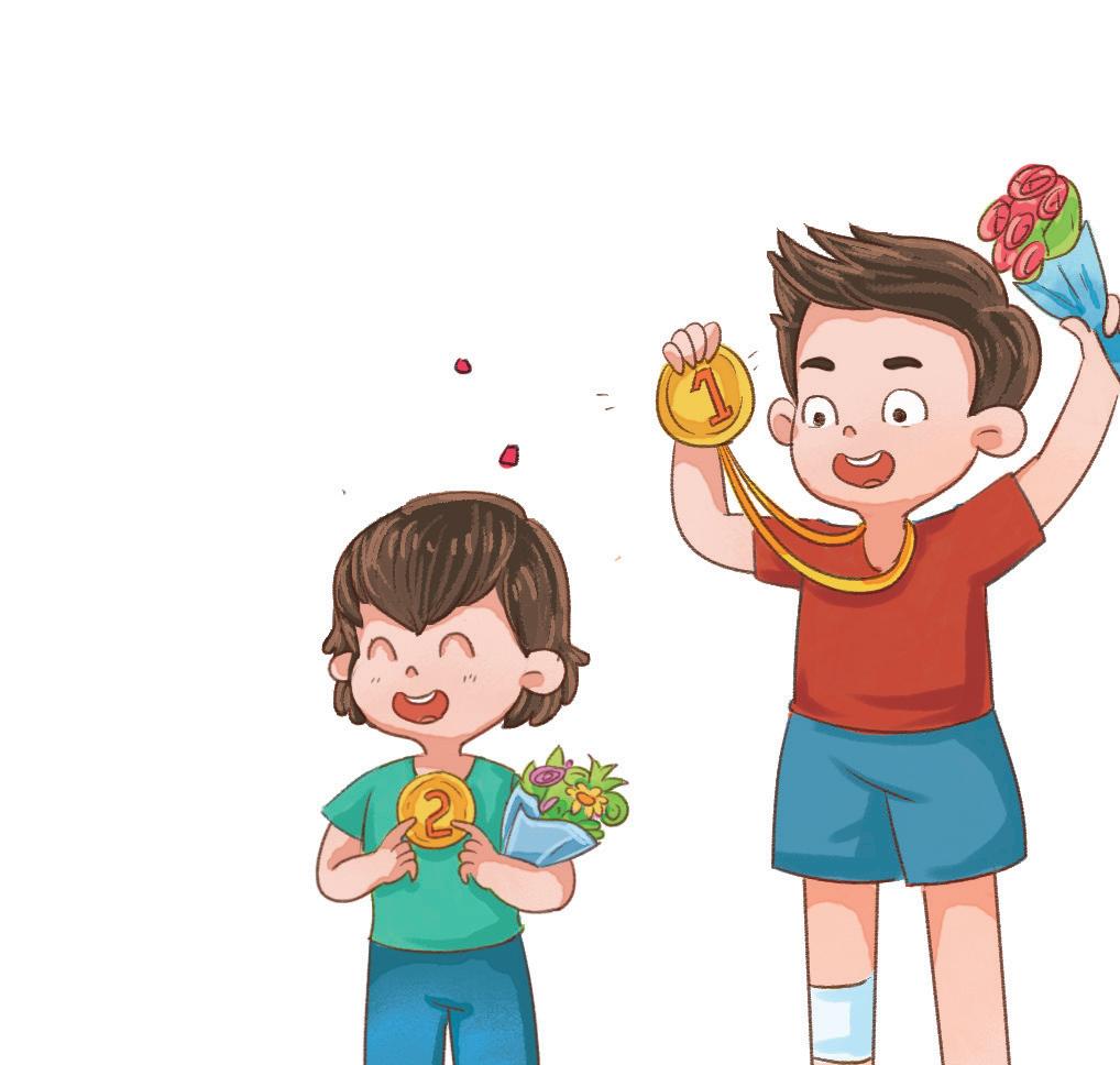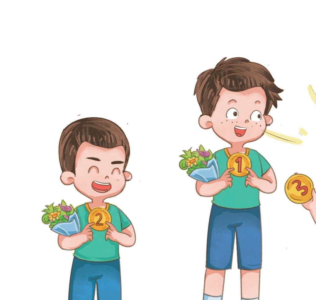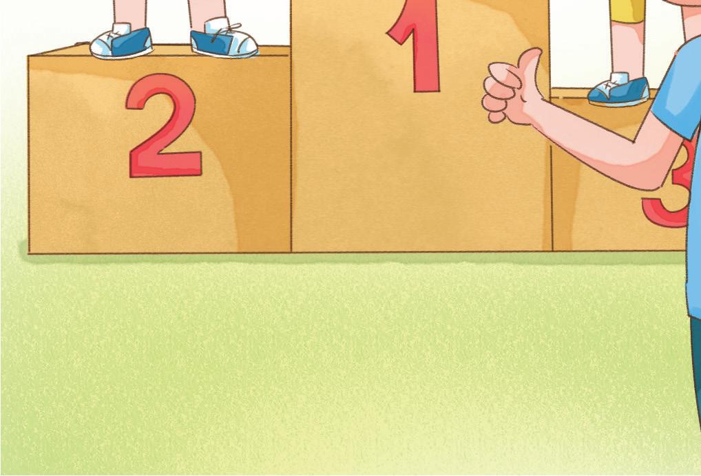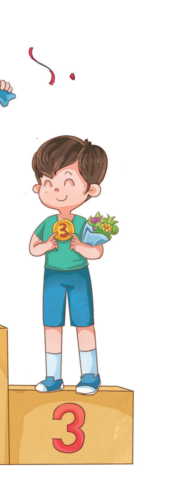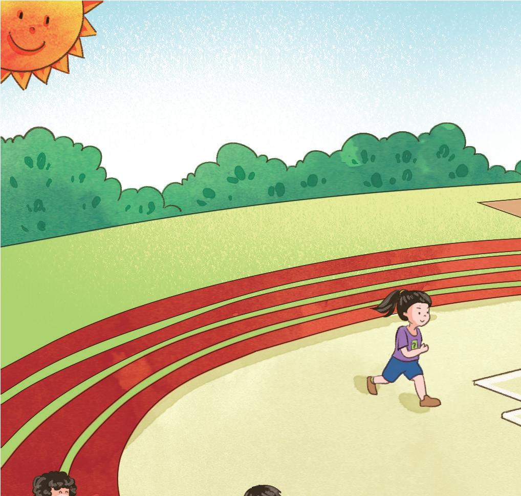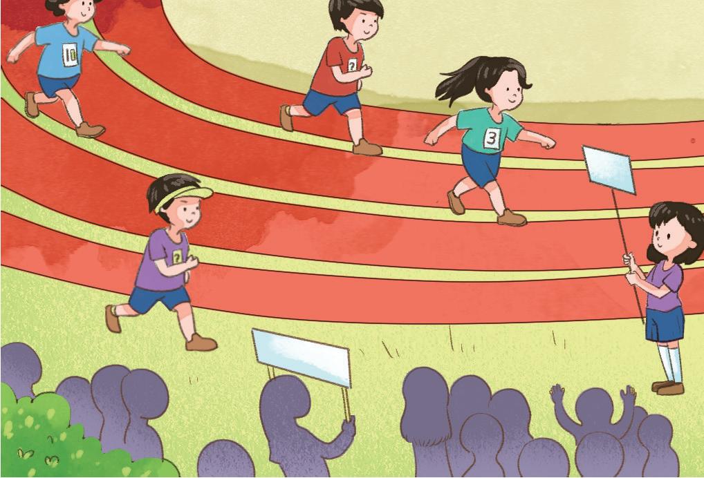 大卫跑得 快 ,他参加了 跑步 比 赛。“加油!加油!大卫,加