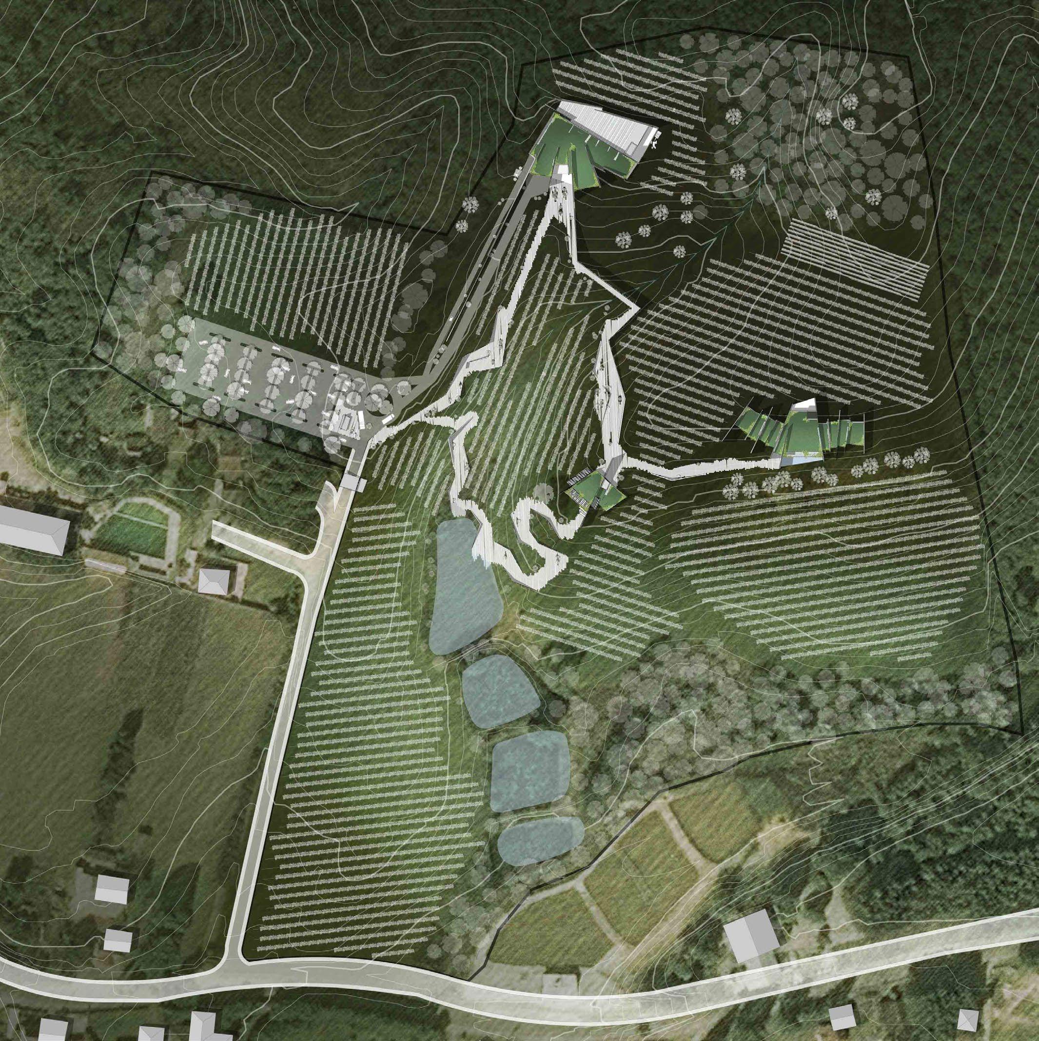 This Winery complex includes not only the production area of the wine, but also a hotel and a restaurant. The design concept was the construction of independent concrete walls within different angles that provoke different natural light and shadows effects and unique visuals to the site, enhancing even more the visitor’s tour around the winery. The materiality of this design proposal plays a great role on maintaining the ideal internal temperatures, for a good wine to be made.