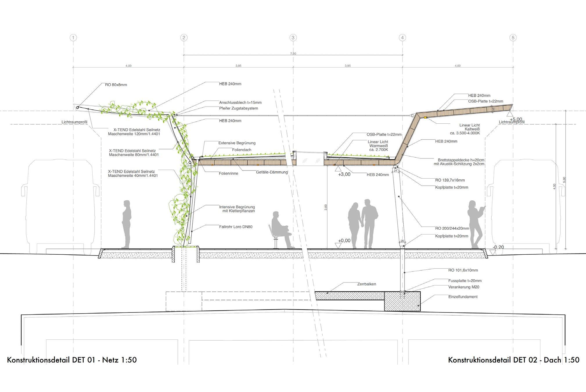 Genehmigungsplanung: Erarbeiten und Zusammenstellen der Vorlagen für die erforderlichen Genehmigungen. Ausführungsplanung: Erarbeiten der Ausführungspläne M. 1:50 und Detailplanung M. 1:5.