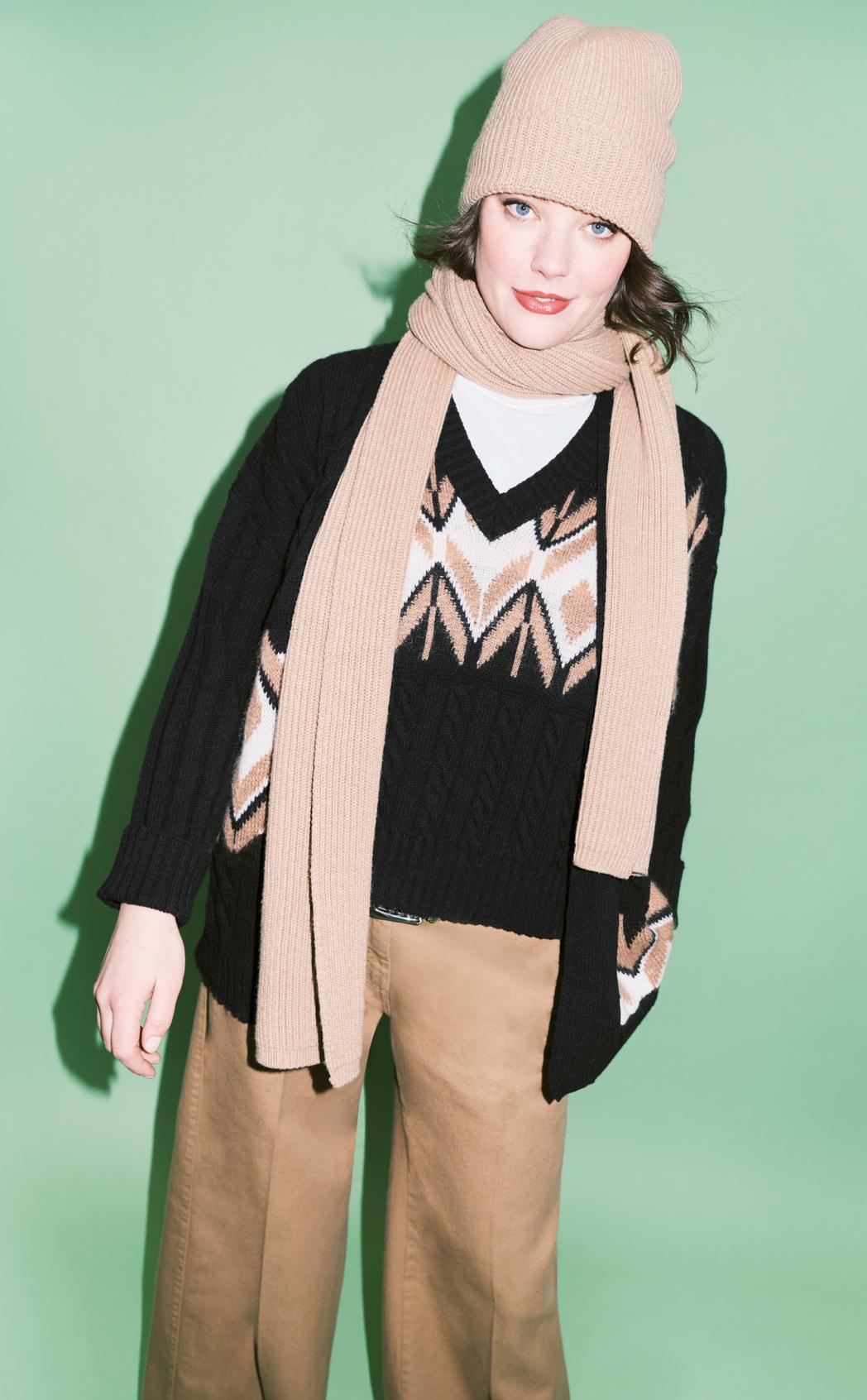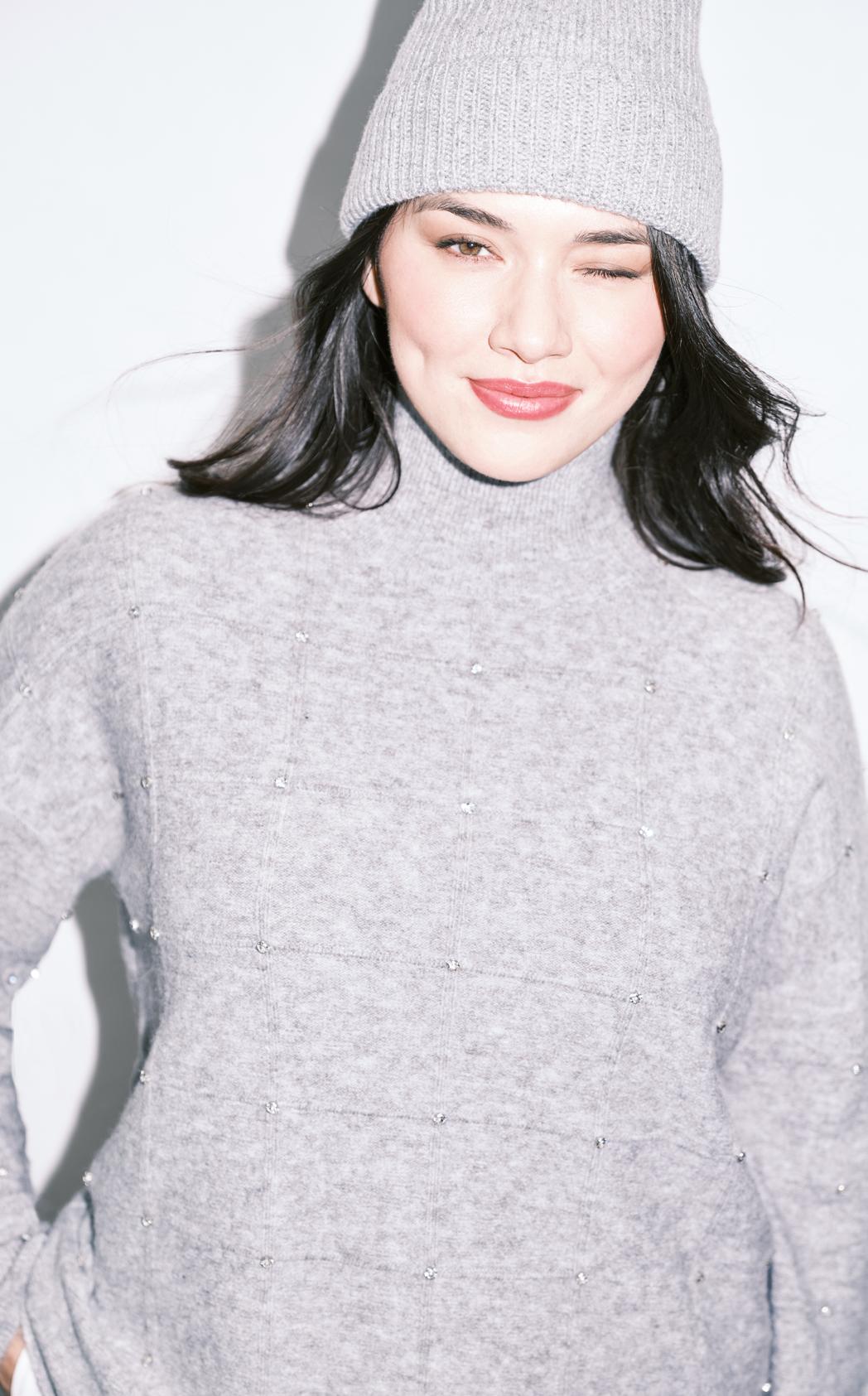 Un calore che brilla. Il morbido filato in misto alpaca stretch e il motivo check si accendono di strass.