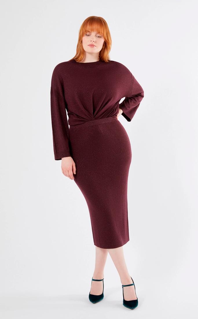 84. GARAGE / BACCO. La gonna lunga a coste, con il suo scintillio metallizzato, dona magia al tuo passo. Abbinata alla maglia coordinata, è il completo da sogno che ti rende radiosa e irresistibile.