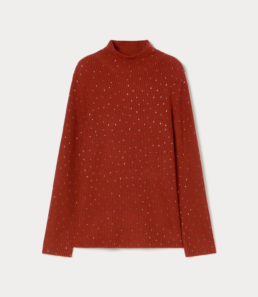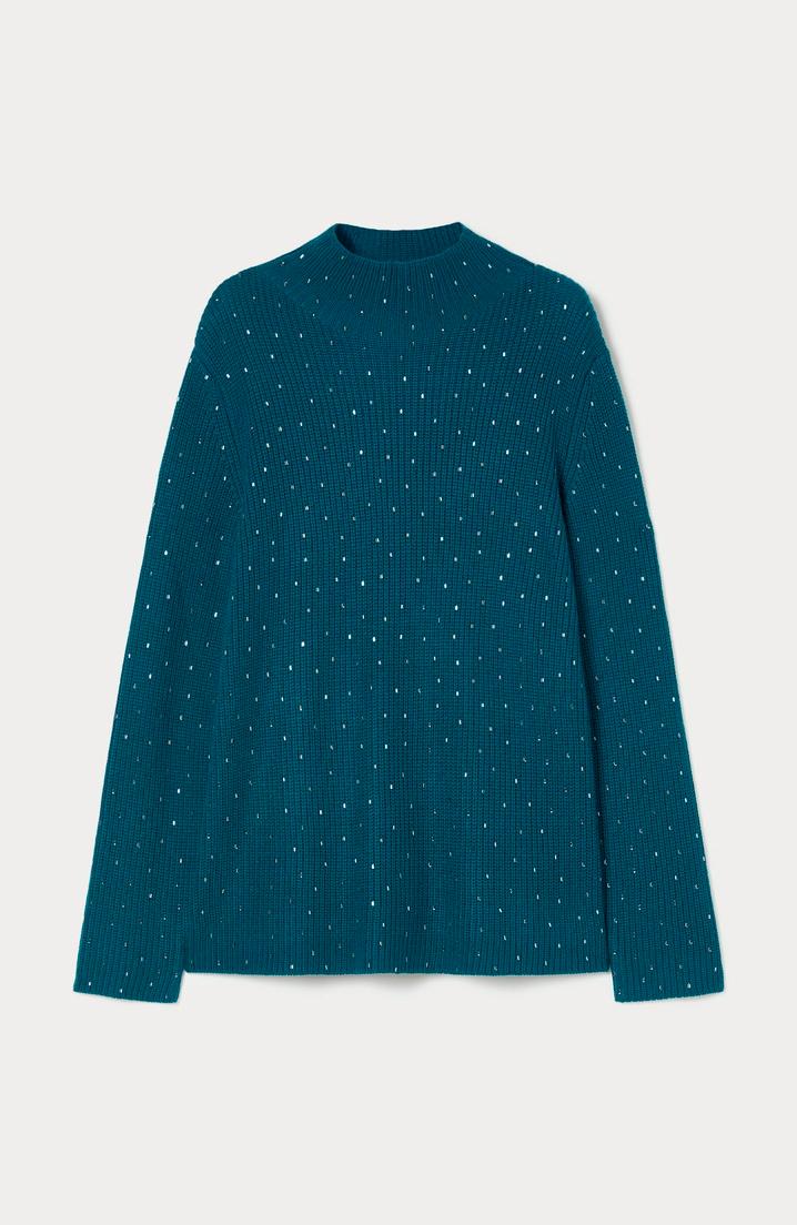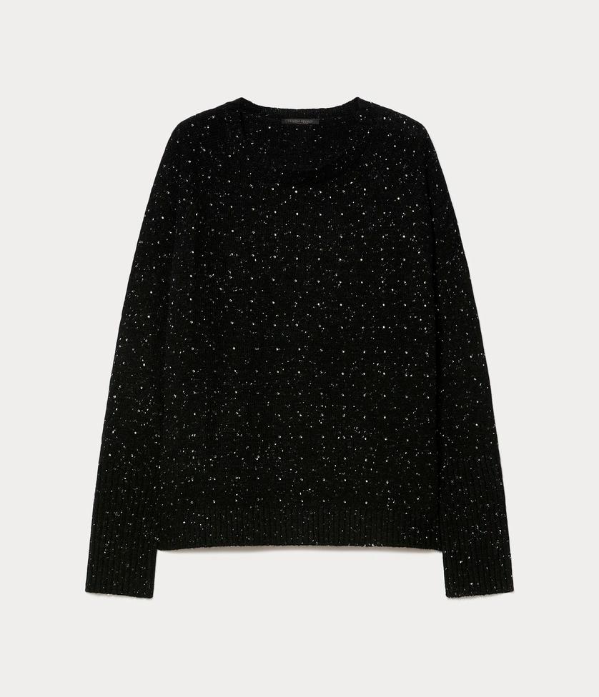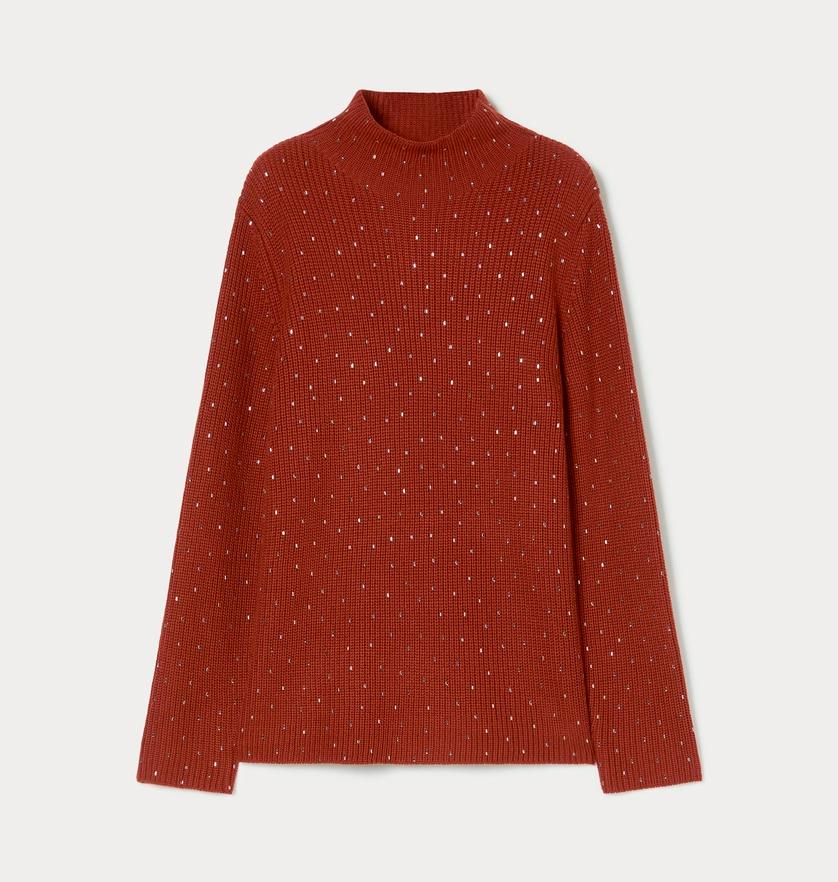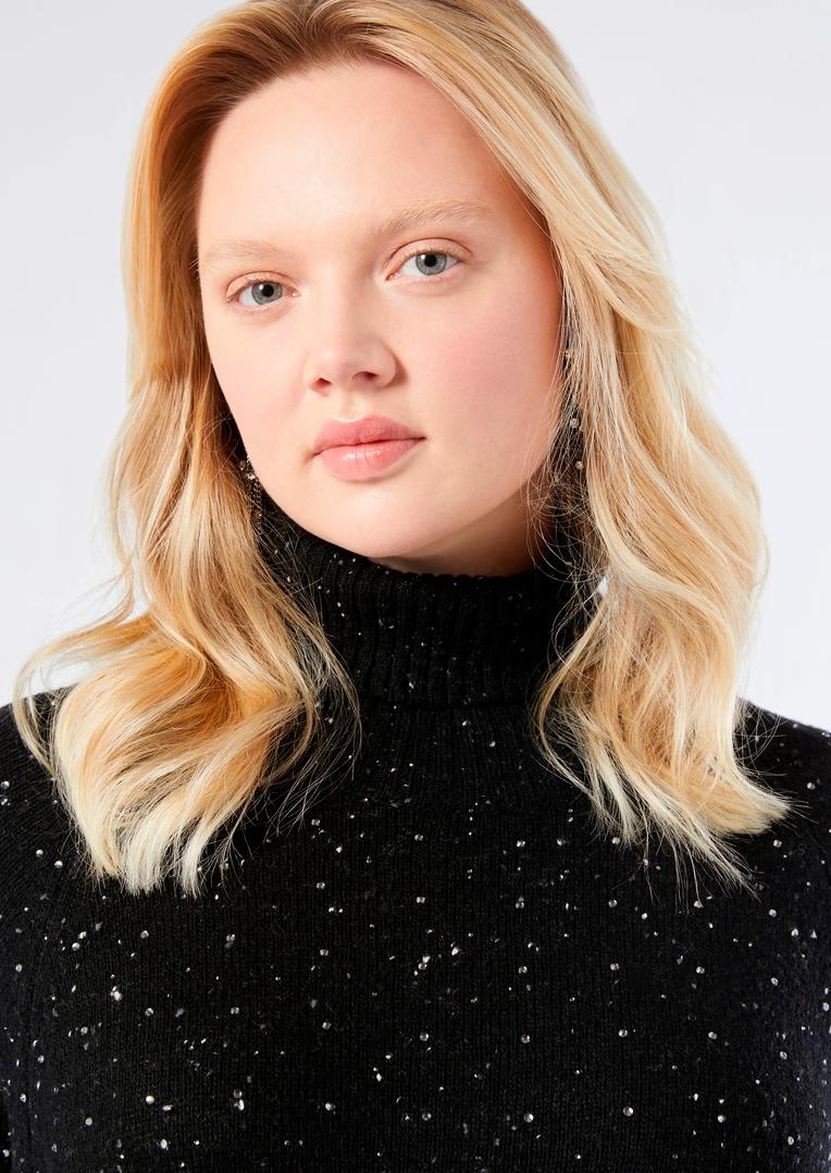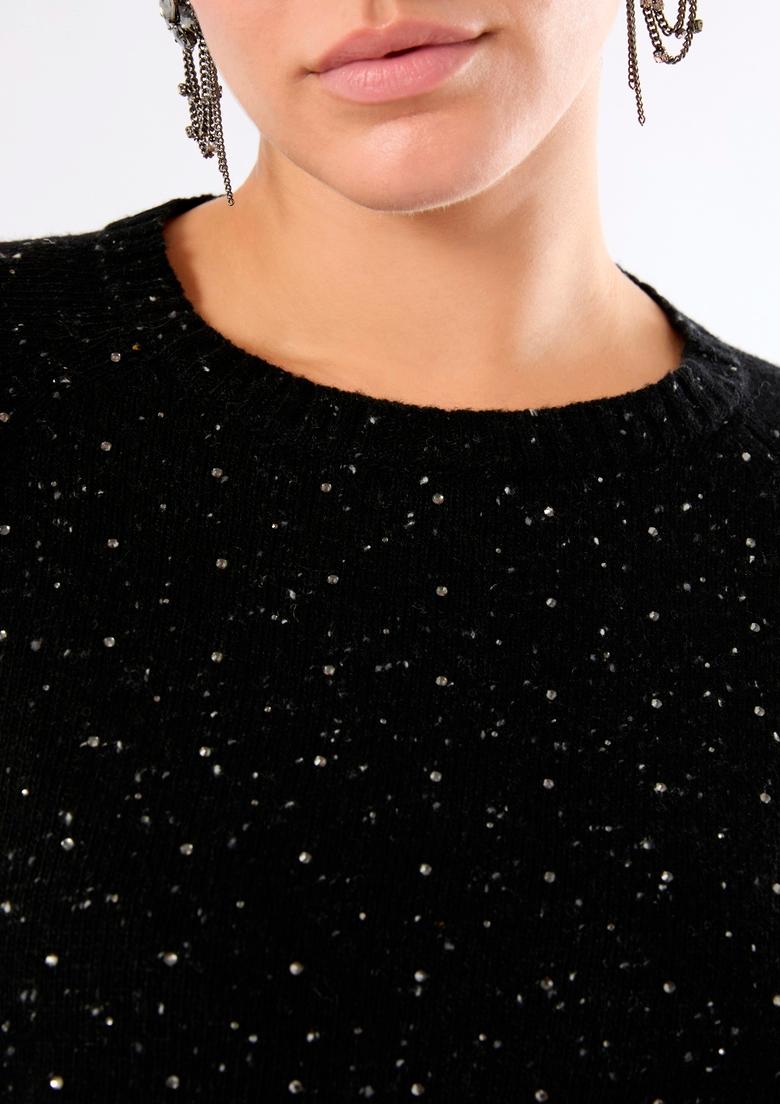 CONGO. La maglia con strass black diamond ti fa brillare con un glamour irresistibile, completando il look con la morbidezza avvolgente di un tocco cozychic. / Sparkling with black diamond rhinestones, this knit delivers irresistible glamour, finishing the look with a cozy-chic, soft embrace.