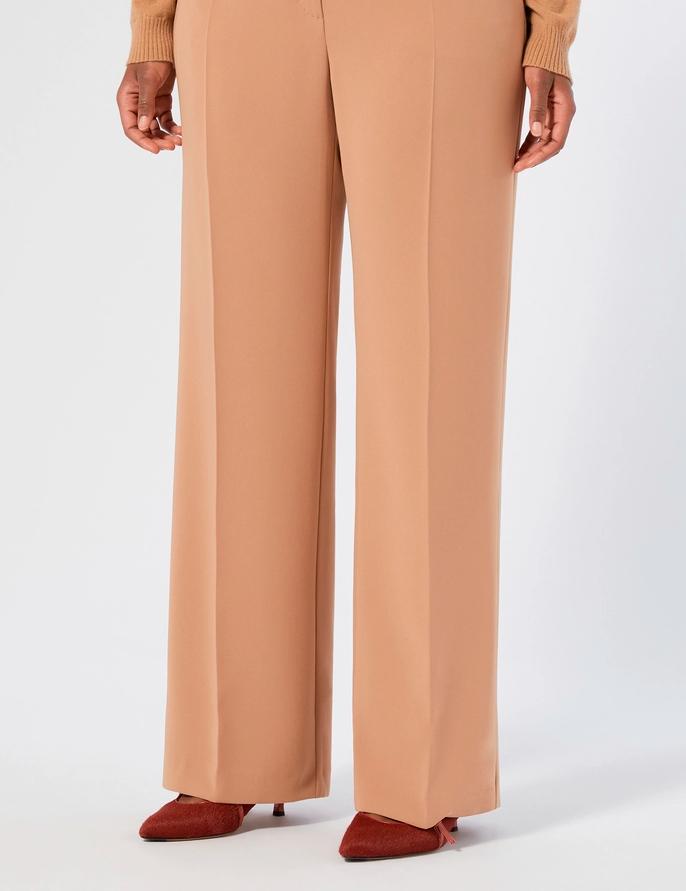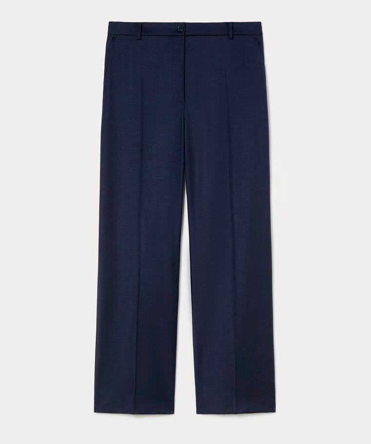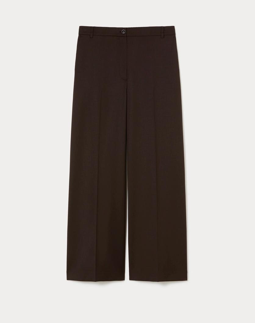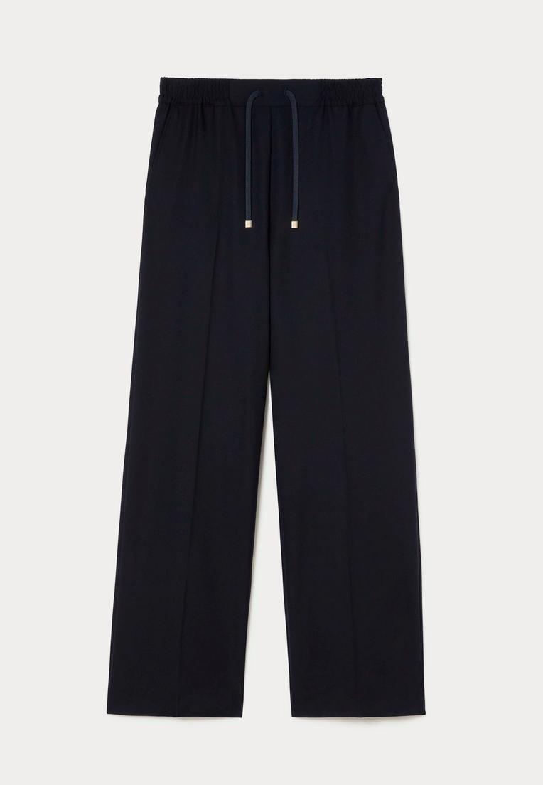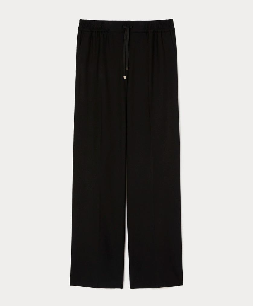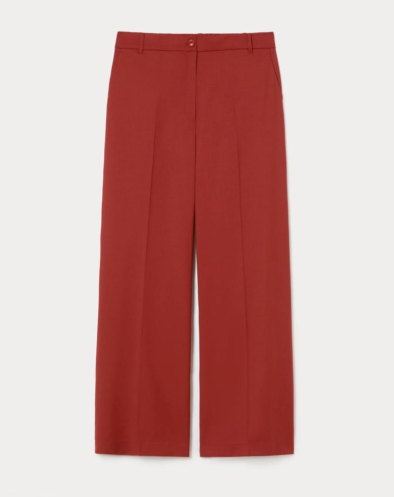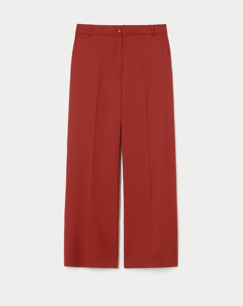 99. QUOTA. Pantaloni in saglia di viscosa monoelastica in trama. Linea wide leg attuale. / Single-stretch viscose twill trousers. Current wide-leg fit.