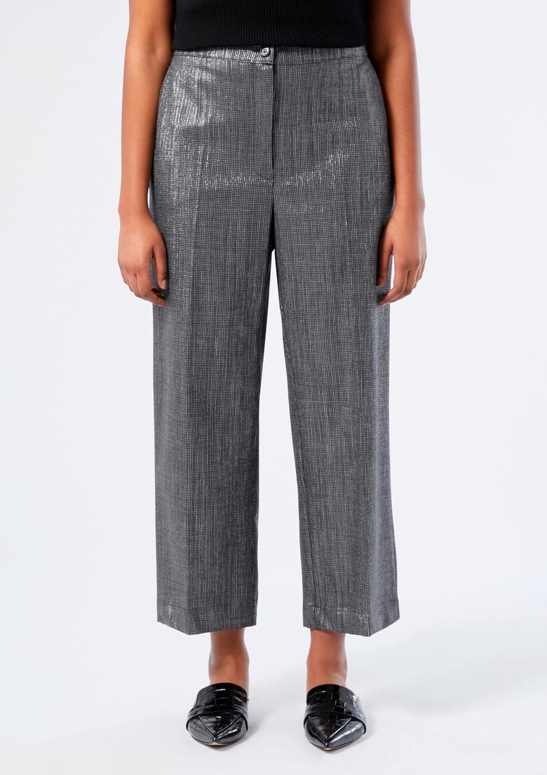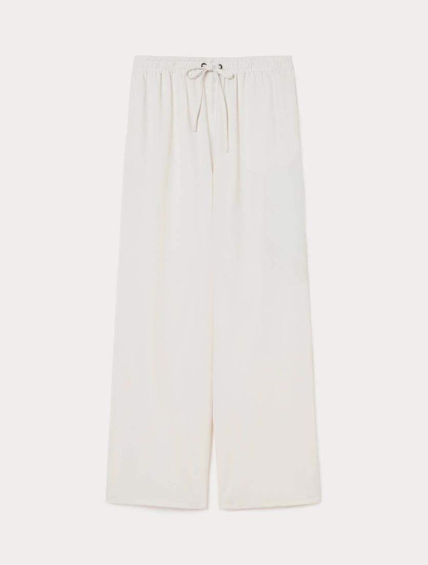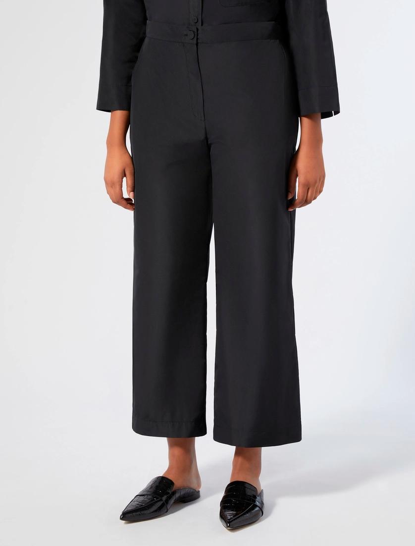 106. PATIO. Pantaloni in taffetà con elastico in vita sul retro. / Wide-leg sophisticated taffeta trousers with elastic on the back waist.