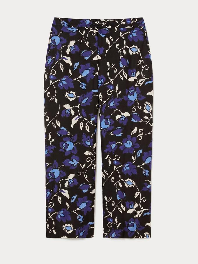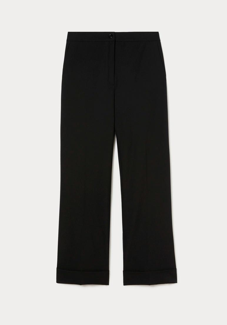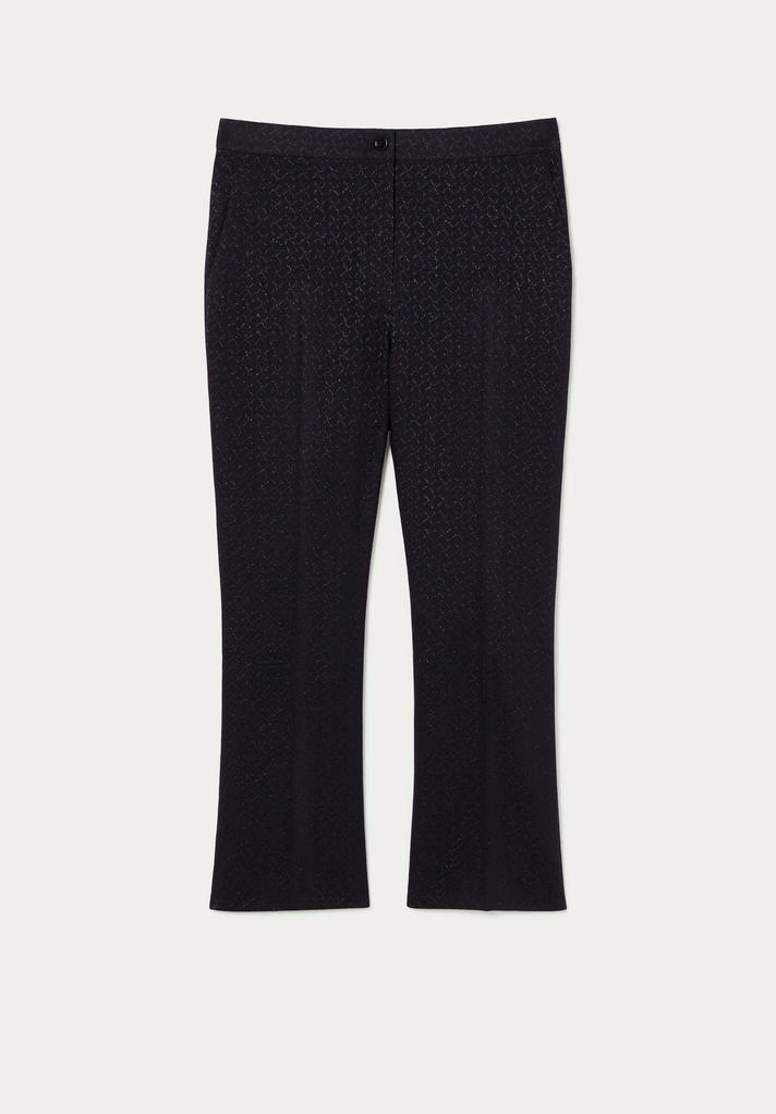 109. OMBRINA. Pantaloni in saglia di misto viscosa dalla linea flare e cropped. / Trousers in viscose-blend twill fabric, featuring a flared, cropped cut.