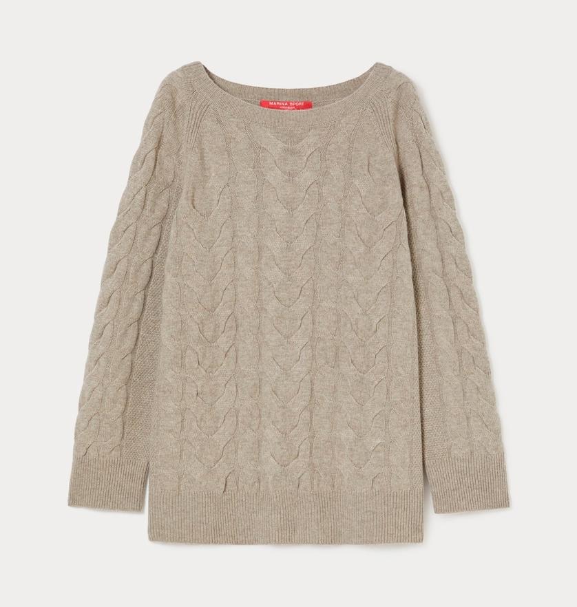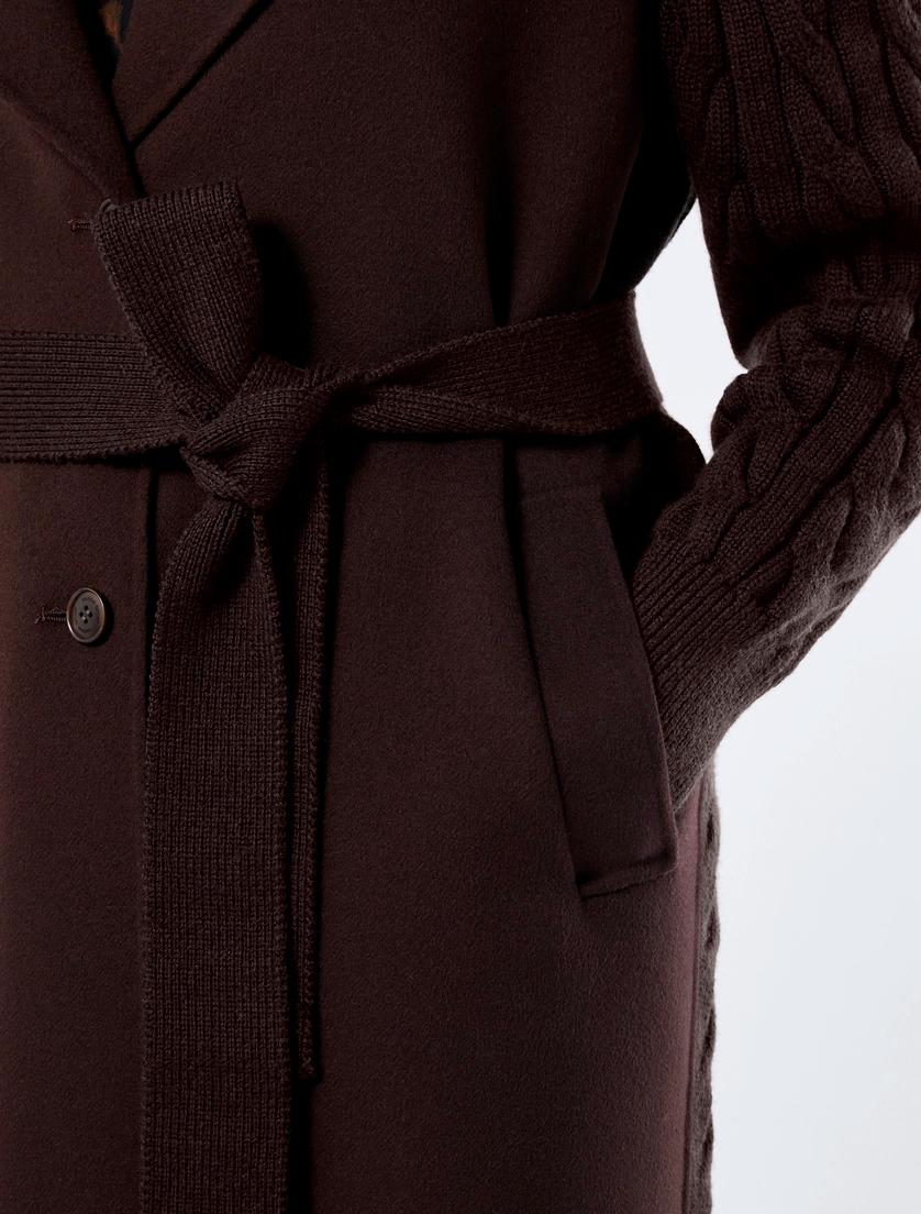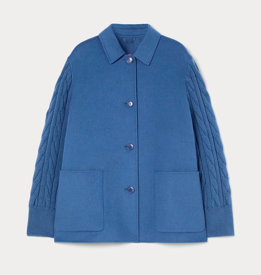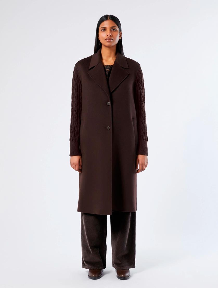 134. ZARINA. Cappotto in double di lana e nylon con retro e maniche in maglia a trecce di misto lana. / Double-faced wool and nylon coat exudes a cosy-chic flair and boasts a cable-knit wool-blend back and sleeves.