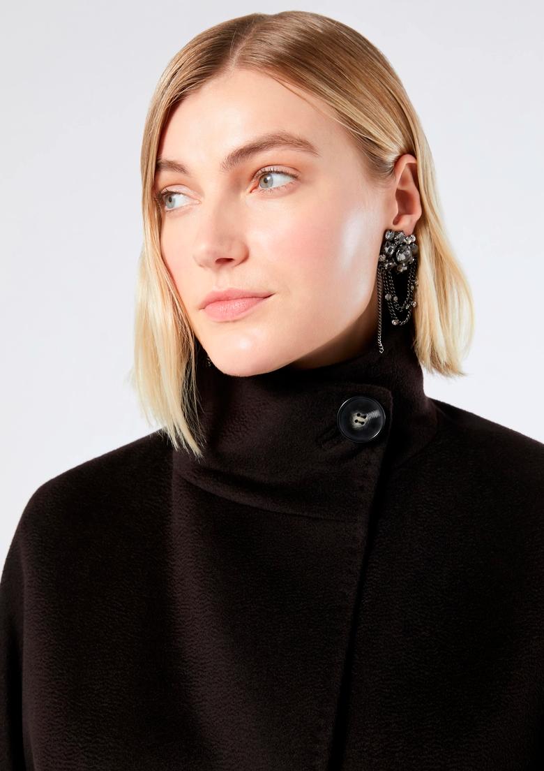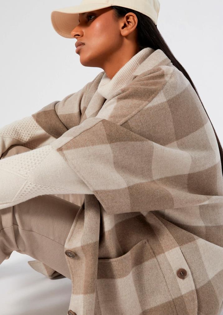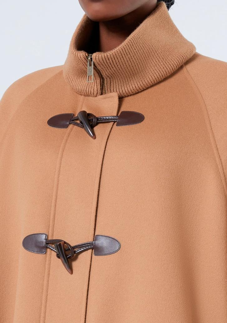 EFESO. Cappa di tendenza in double misto lana con collo in maglia. È il capo outerwear ricercato che eleva immediatamente ogni look. Protagonista assoluta, on e off duty. / Trending cape in wool blend double-face with knitted collar. It is the sophisticated outerwear piece that instantly elevates any look. An absolute protagonist, both on and off duty.