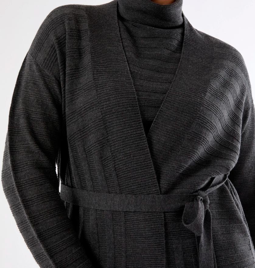 Cardigan in pura lana vergine seamless per una vestibilità fluida. Abbinato ai pantaloni coordinati, crea un knit-suit versatile ed elegante. Completa il look con il lupetto in pura lana vergine: massimo calore e funzionalità in un ensemble impeccabile.