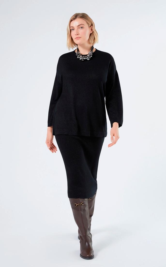 The long ribbed skirt, featuring a metallic glimmer, brings magic to your walk. Combined with the coordinating sweater, it’s the dream set that makes you radiant and