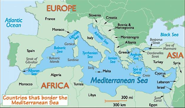 With an average depth of 4,920ft (1500m) and a maximum depth of 17,280ft (5267m), the aptly named Sea is almost completely surrounded by 21 countries. The countries that border the Mediterranean Sea (in alphabetical order) are: Albania, Algeria, Bosnia and Herzegovina, Croatia, Cyprus, Egypt, France, Greece, Israel, Italy, Lebanon, Libya, Malta, Monaco, Morocco, Palestine, Slovenia, Spain, Syria, Tunisia, and Turkey. This body of water also encompasses more than 3300 islands, the two largest of which are Sicily and Sardinia.