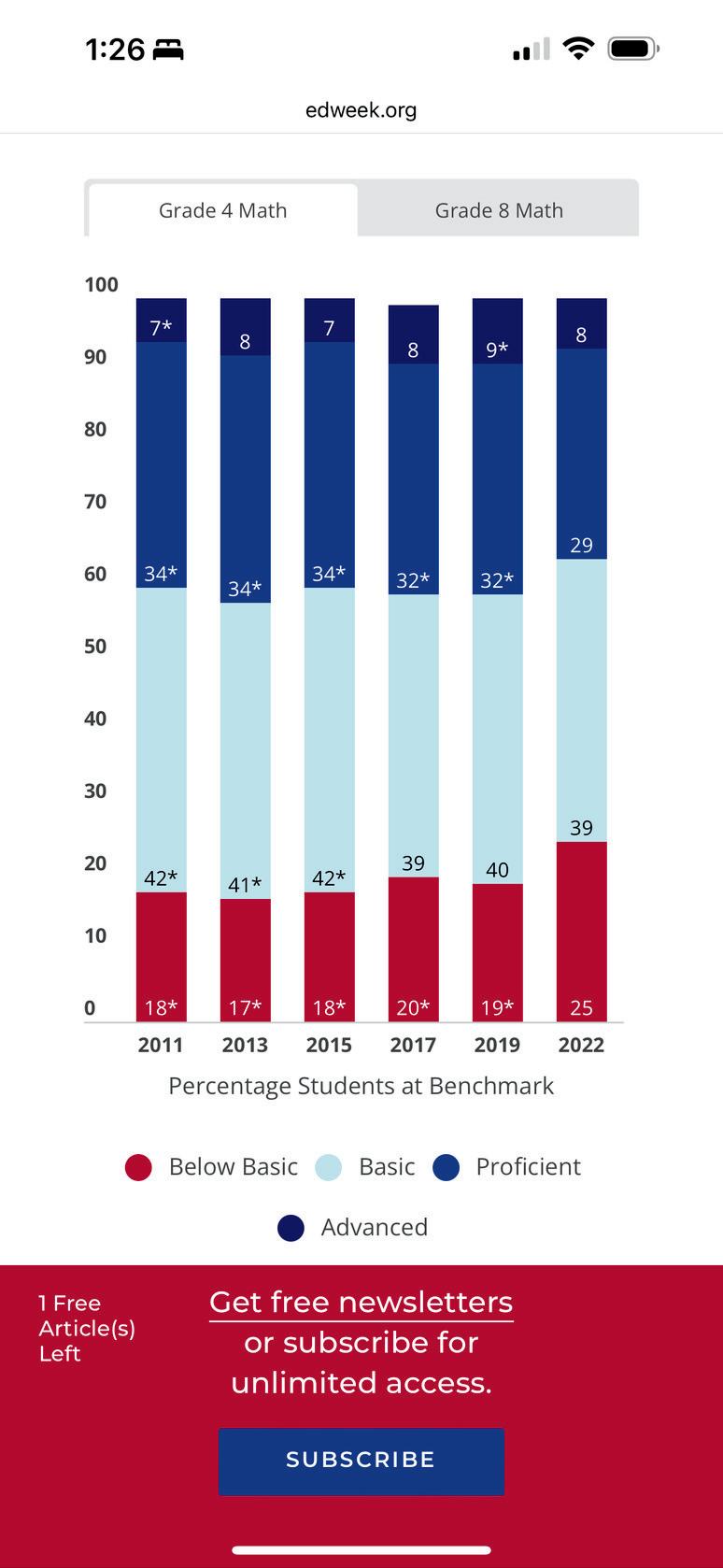 Between 2012 and 2022, on the 0 - 500 point scale of the National Assessment of Educational Progress (NAEP), aptly known as the “Nation’s Report Card,” 4th-grade scoresfellfrom244to236,8th-gradescoresfrom285to274,and12th-grade scoresfrom153to150.