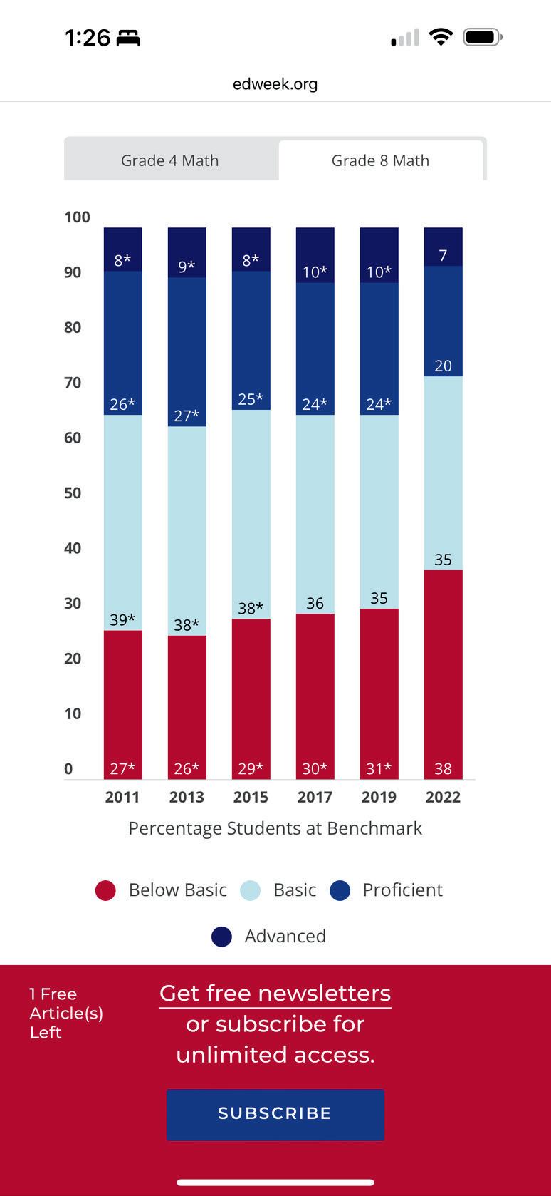 Between 2012 and 2022, on the 0 - 500 point scale of the National Assessment of Educational Progress (NAEP), aptly known as the “Nation’s Report Card,” 4th-grade scoresfellfrom244to236,8th-gradescoresfrom285to274,and12th-grade scoresfrom153to150.