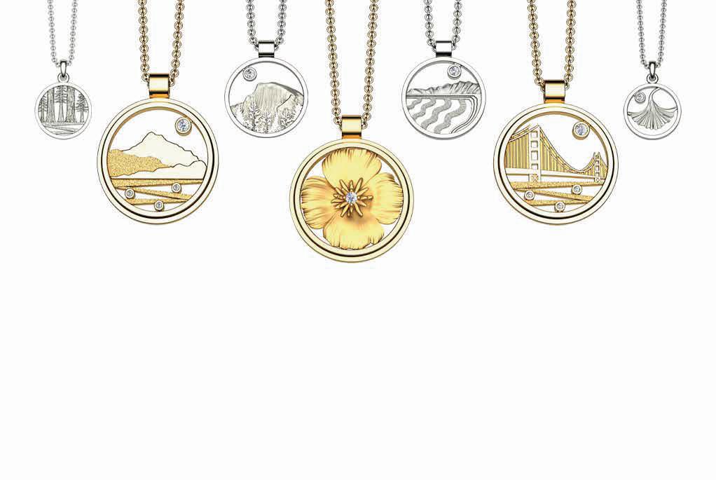 Why do we live here and what do we love about it? These iconic pendants in 14k gold with diamond accents and Sterling silver with white sapphires remind us of the places and landmarks that are so special. The Golden Gate Bridge, Mount Tamalpais, Stinson Beach and Muir Woods to name a few. All are unique to this region and admired by all. Why not collect them all?