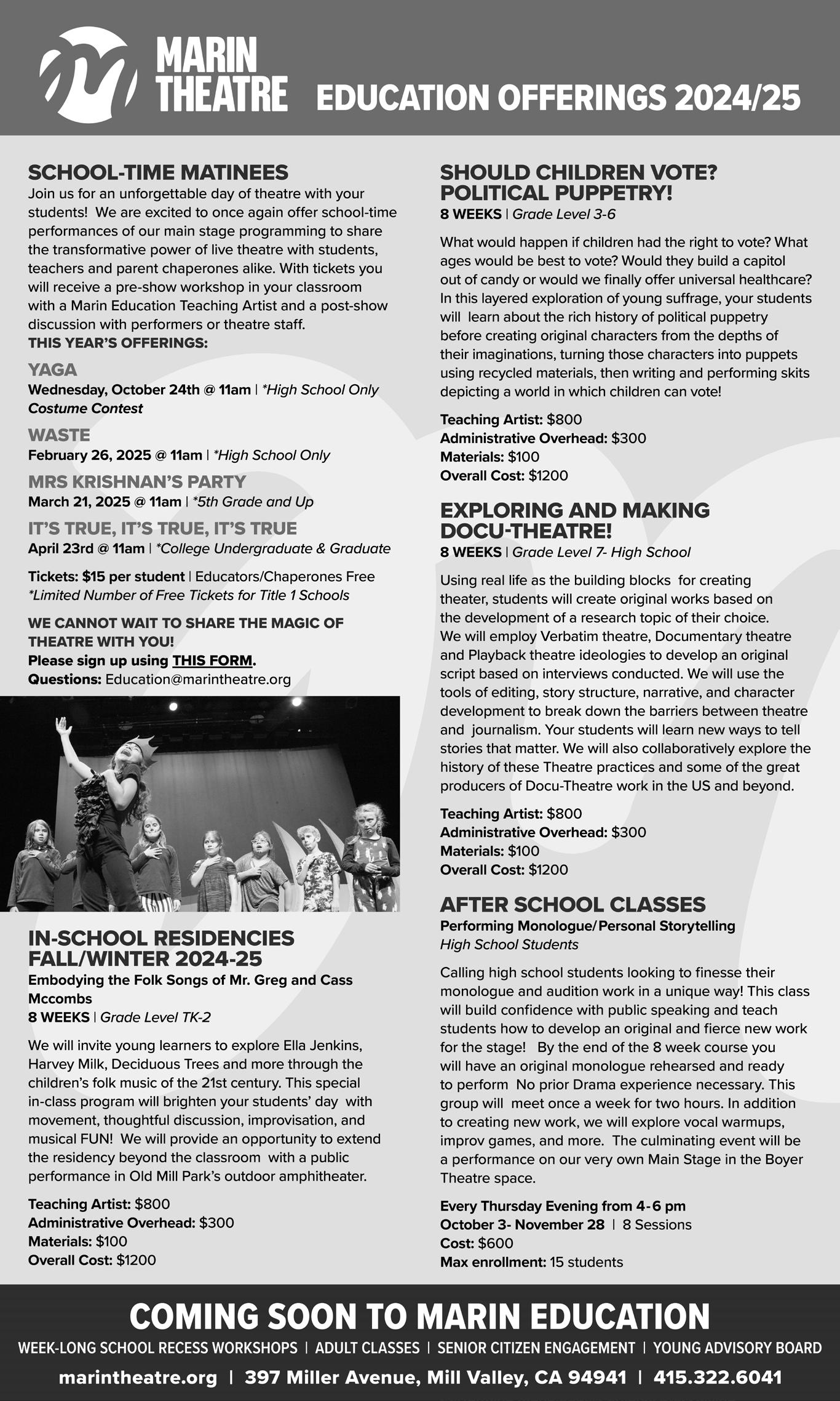 Welcome to Marin Theatre’s 2024-2025 season! With a fresh name and a new look, we’re turning the page to begin the next chapter in the story of this storied institution. We’ve curated a robust slate of fascinating plays to delight, surprise, and inspire you.