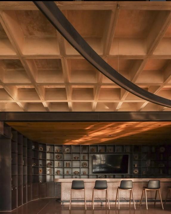 - The design emphasizes natural materials such as terracotta bricks and exposed steel and concrete structure.