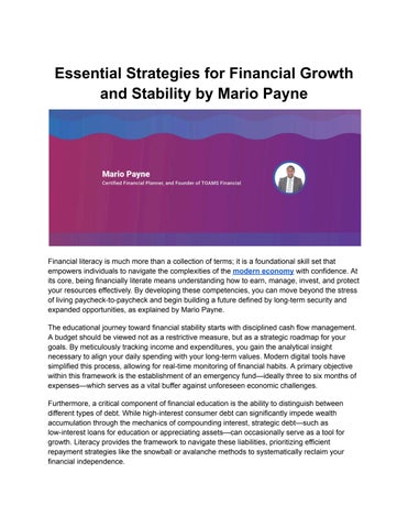 Mario Payne is a U.S. Army veteran, Certified Financial Planner, and the founder of TOAMS Financial, an independent advisory firm based in Jacksonville, Florida. With over 15 years of experience, he has focused on helping clients grow their wealth, plan for their futures, and alleviate financial stress. Through efforts such as The Relax Estate and Payneful Profits, he has worked to provide individuals and families with tools for building long-term financial security. Mario J. Payne was born in Cincinnati, Ohio. After finishing high school, he attended Tennessee State University and earned a degree in Business Administration. Later, he completed a degree in financial planning through the College for Financial Planning. His dedication to his profession earned him the CERTIFIED FINANCIAL PLANNER™ certification and the Accredited Asset Management Specialist designation. These qualifications place him among fewer than 2 percent of licensed African American advisors who hold the CFP® credential. Mario joined the United States Army during college and served as a Financial Sergeant during Operation Enduring Freedom. In this role, he supported fellow soldiers by helping them manage their pay, make careful financial decisions, and plan for their futures during challenging times. He began his career in financial services at American Income Life Insurance Company, where he gained experience in explaining financial concepts to working families. He then joined Edward Jones, where he worked with retirees, families, and business owners to help them prepare for their futures through investment and planning strategies. These experiences helped him develop his skills and shape his client-centered approach. In 2013, Payne founded TOAMS Financial, which stands for “Tithes Offering Alms Means Stewardship.” The firm is based in Jacksonville and serves clients across the United States and internationally.